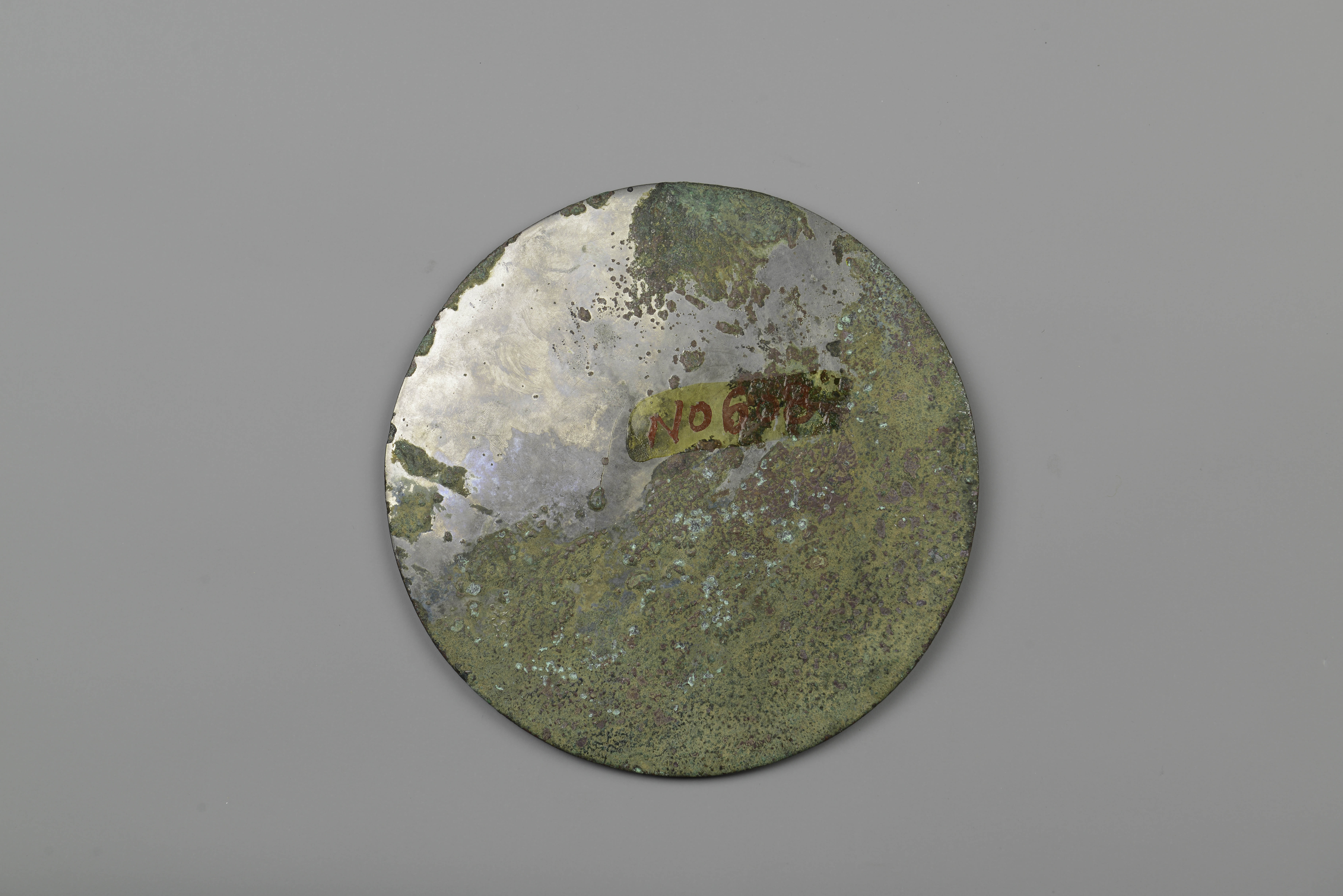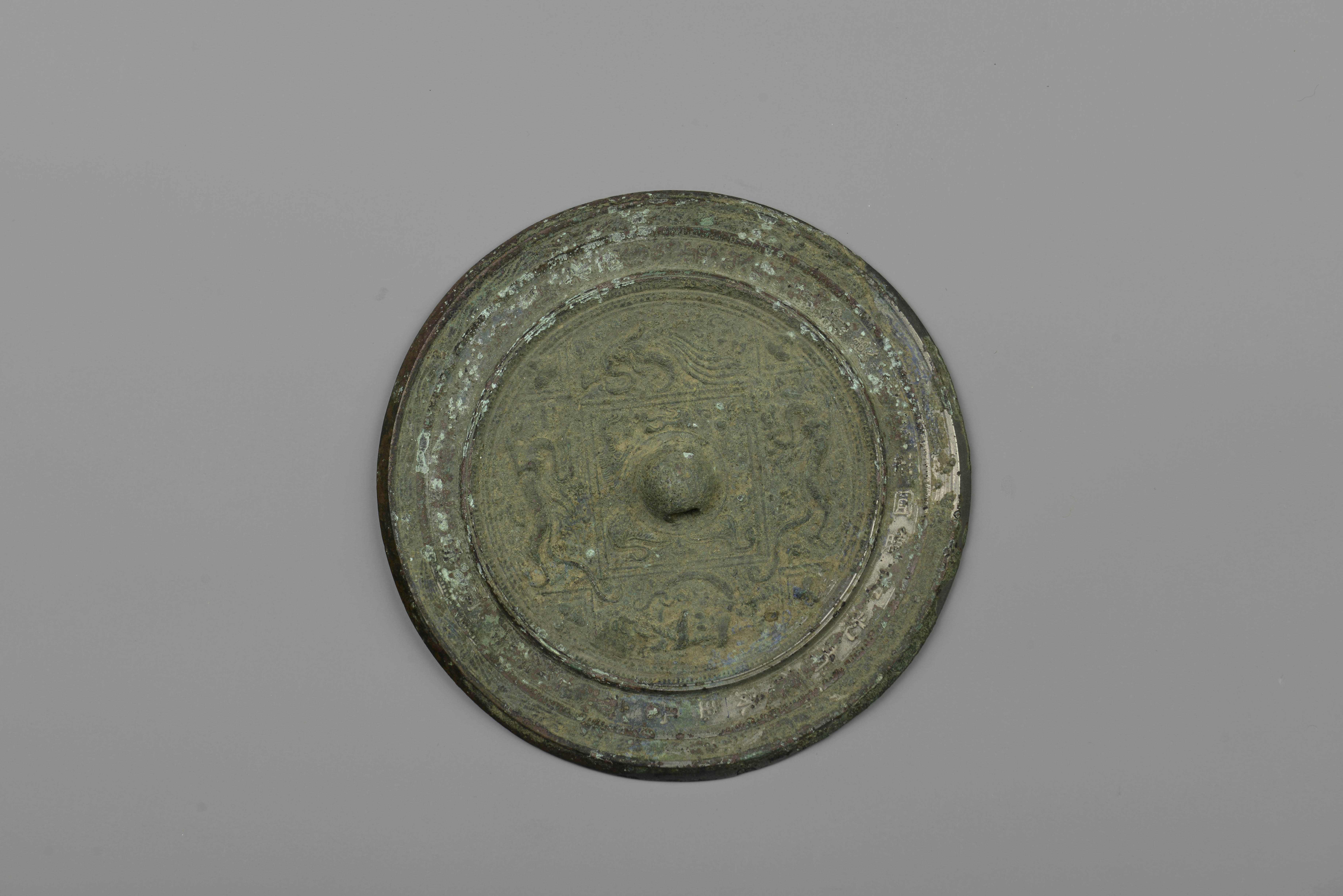 圆形,圆钮,圆钮座。座外双线方格饰神兽纹,格外青龙、白虎、朱雀、玄武四神各居一方,方格四角与“V”形纹相对,“V”形内有兽面纹。一周凸棱外楷体铭带一周,锈蚀严重,字迹多漫漶不清。窄缘外出,饰流云纹。