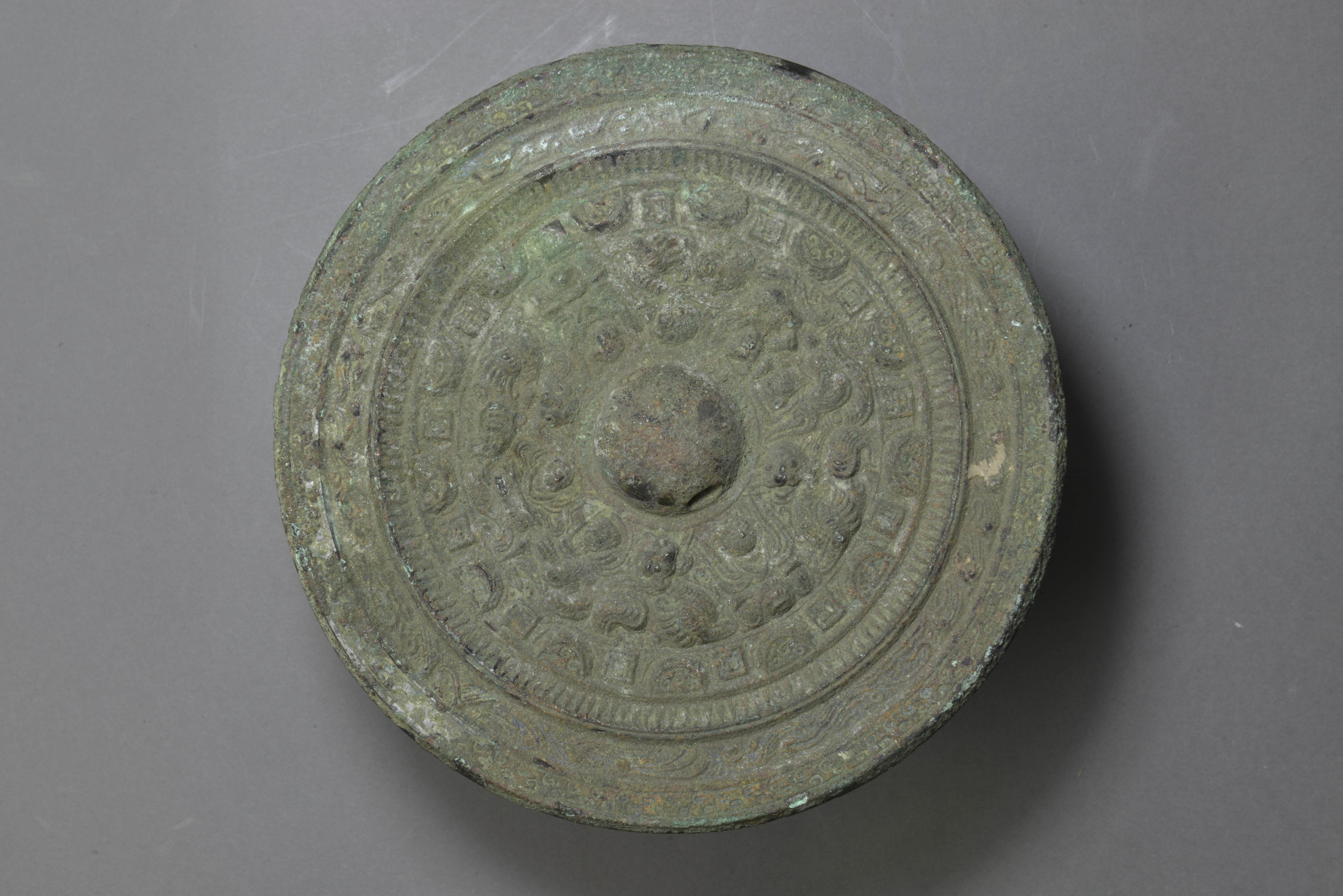 圆形,圆钮,圆钮座。座外主纹分为两式两组,一组为两神对立而坐,帔巾飘带;另一组为神正面端坐,四组神人以狮形瑞四兽相间,主纹外有半圆方枚各十三个;半圆饰卷云纹,方枚中有文字,边缘云纹。