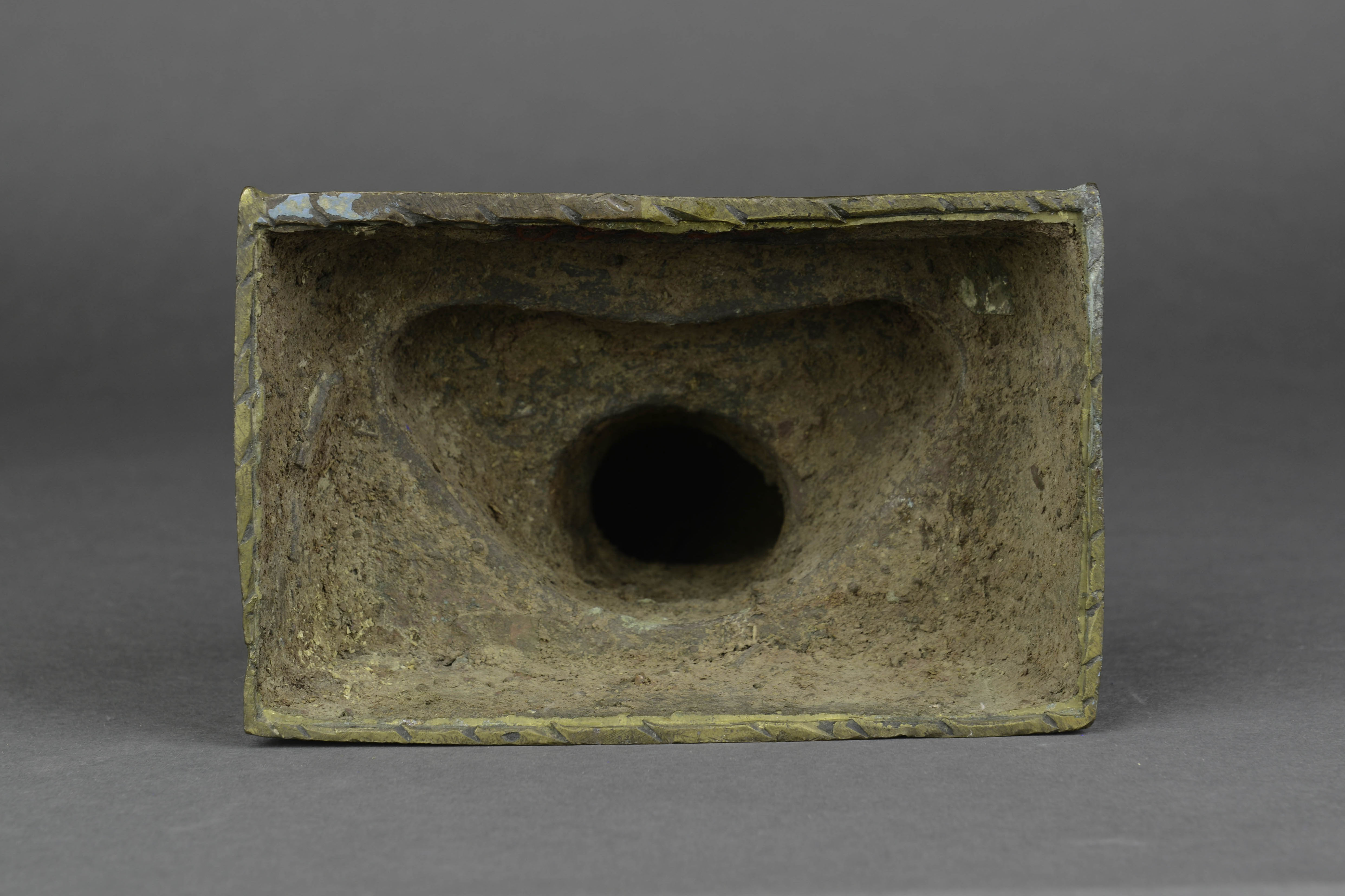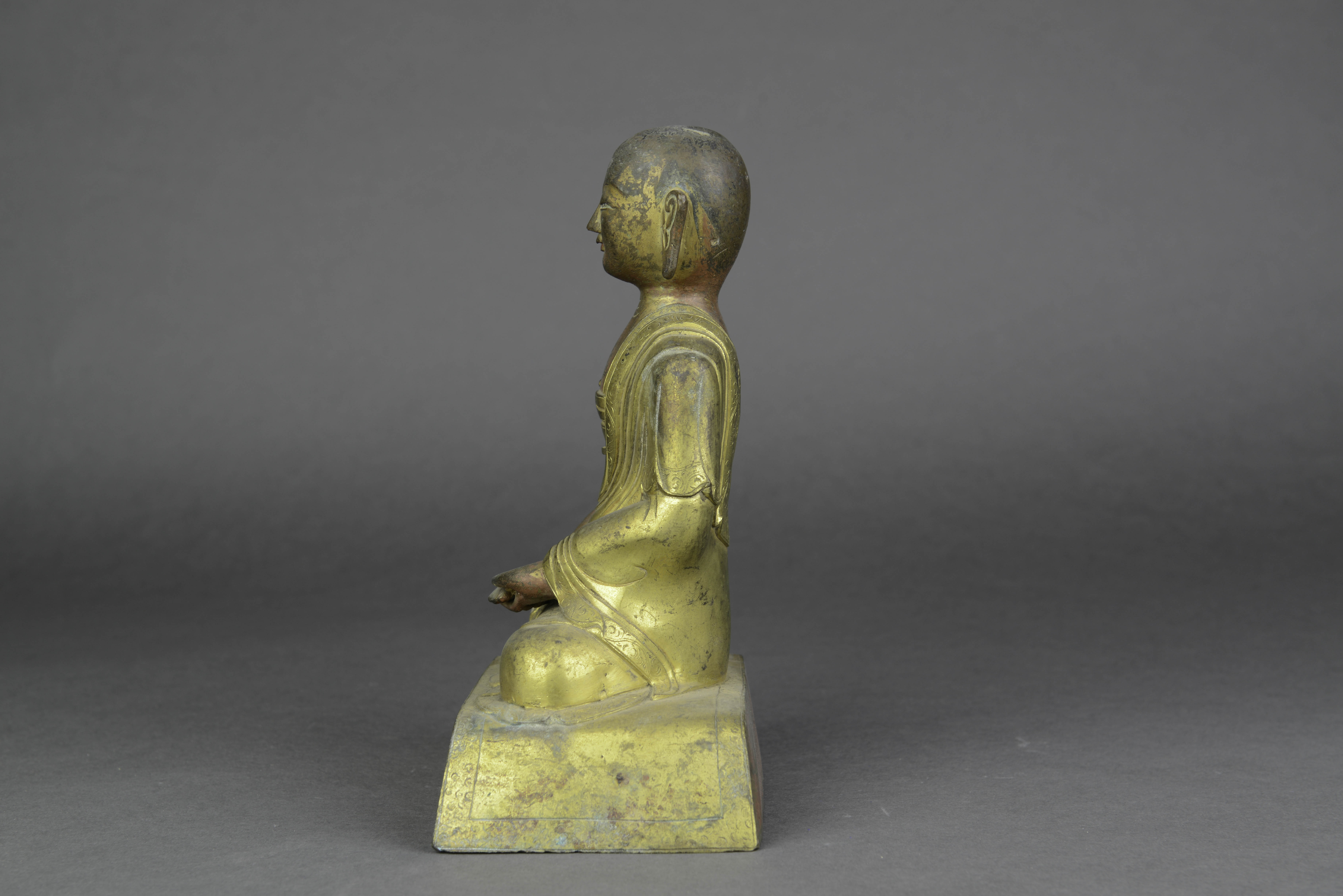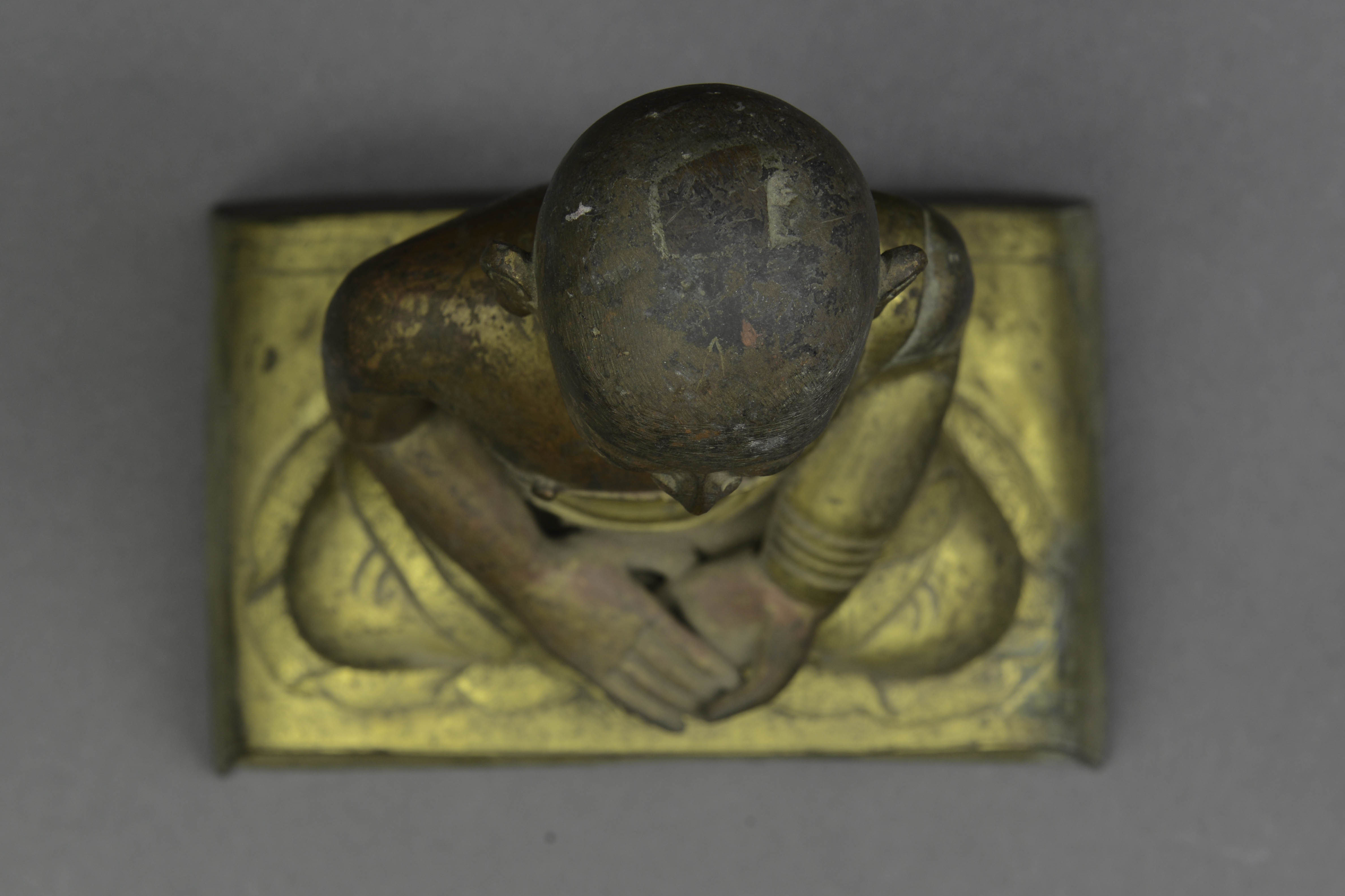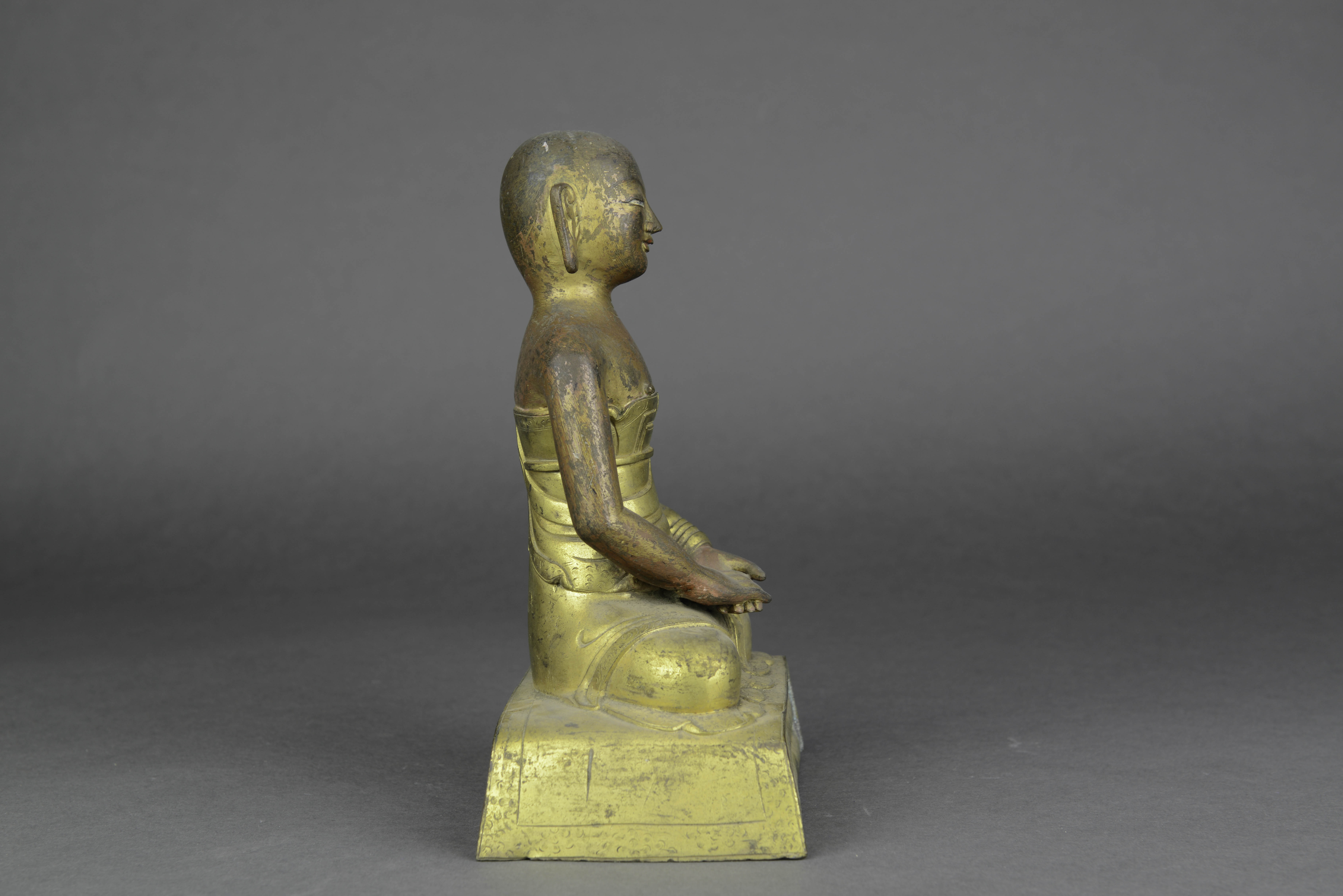- 内容:黄铜质,佛秃发,面相浑圆,面自下垂,双目微睁,鼻梁交隆,安详恬静,着袒右式袈裟,结跏趺坐於长方形床坐上,右手按压左手之上施禅定印。造像通体鎏金,佛袒右部分,咀唇及床座背面髹有红漆,床座上面阴刻三层卷莲纹,背面黑书藏文一行。
