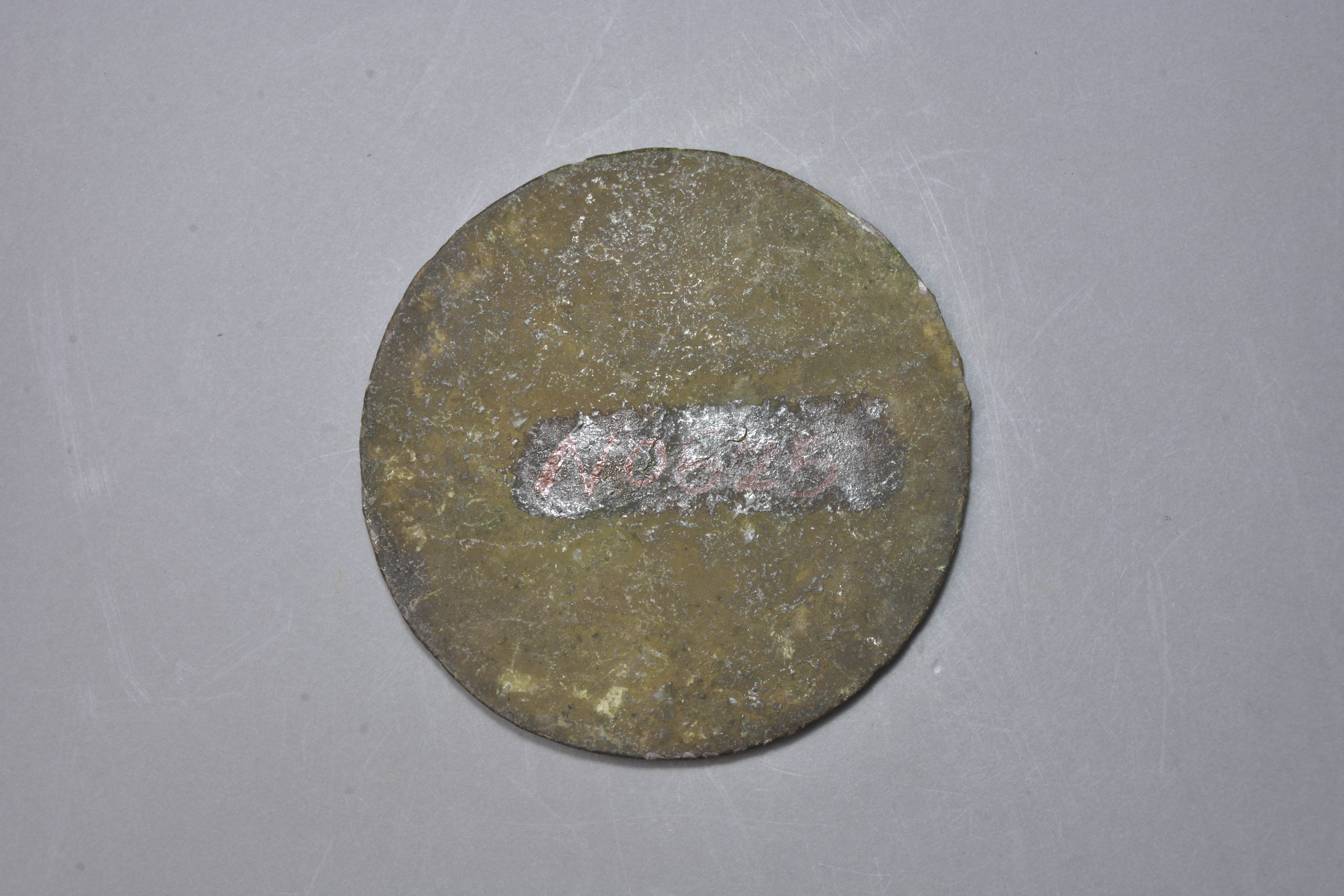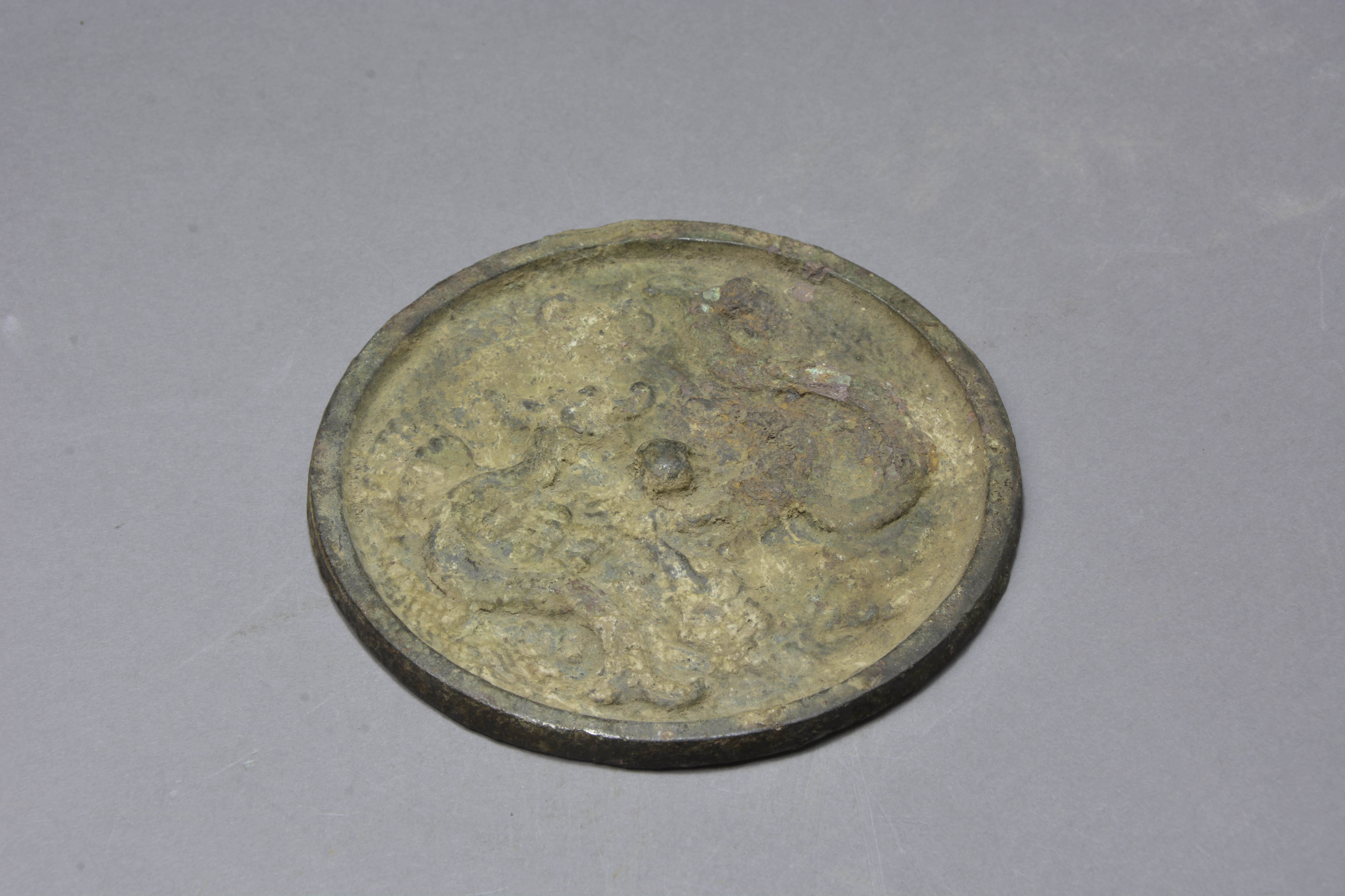 圆形,长方形柄。钮外二摩羯同向环绕。龙头鲤鱼身,前鳍变成两只张开的翅膀,脊鳍,后鳍均消失。窄素颜。
