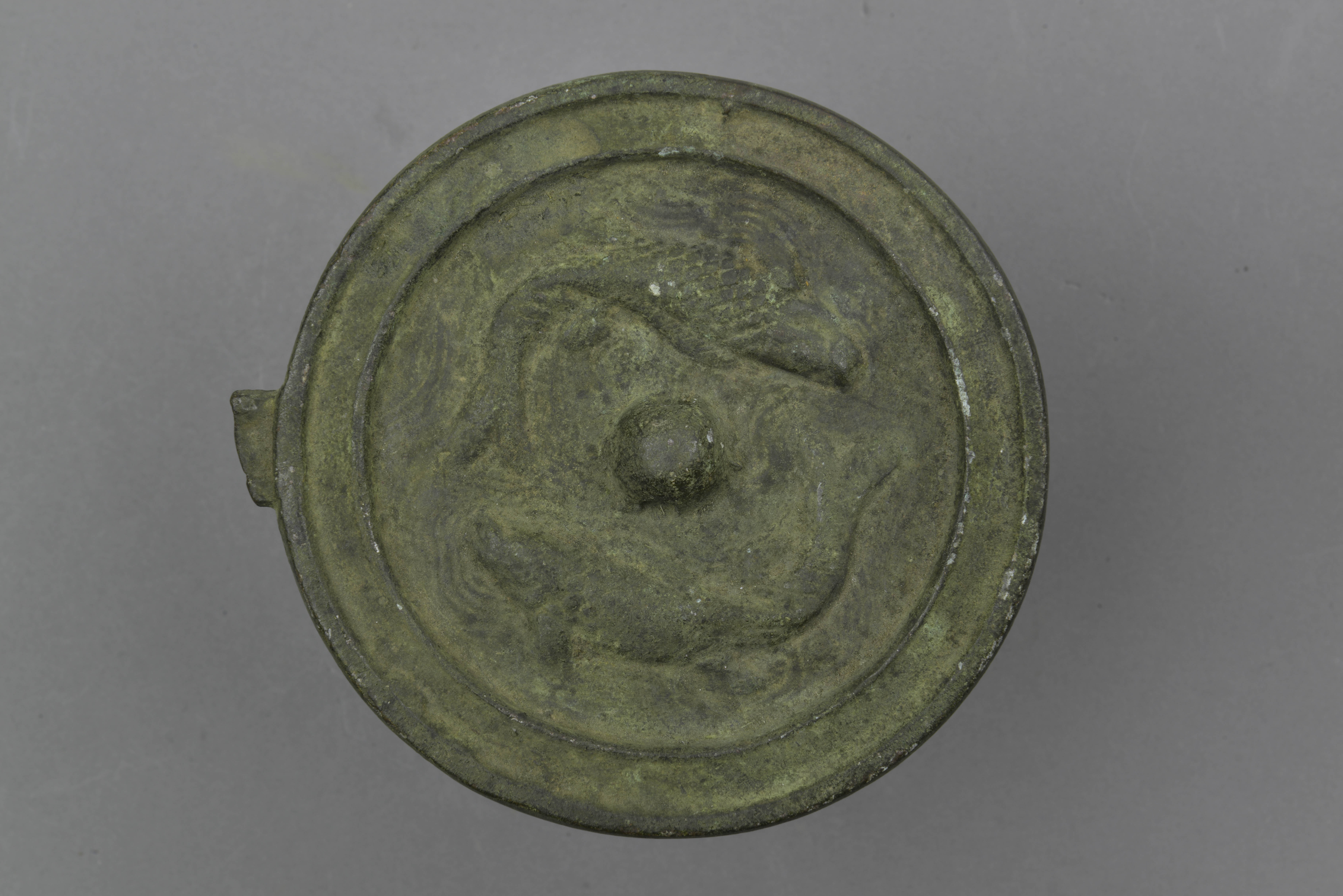 圆形,有柄,圆钮。钮外二鱼同向环绕。作游动状。并衬水曲纹。双重素缘。