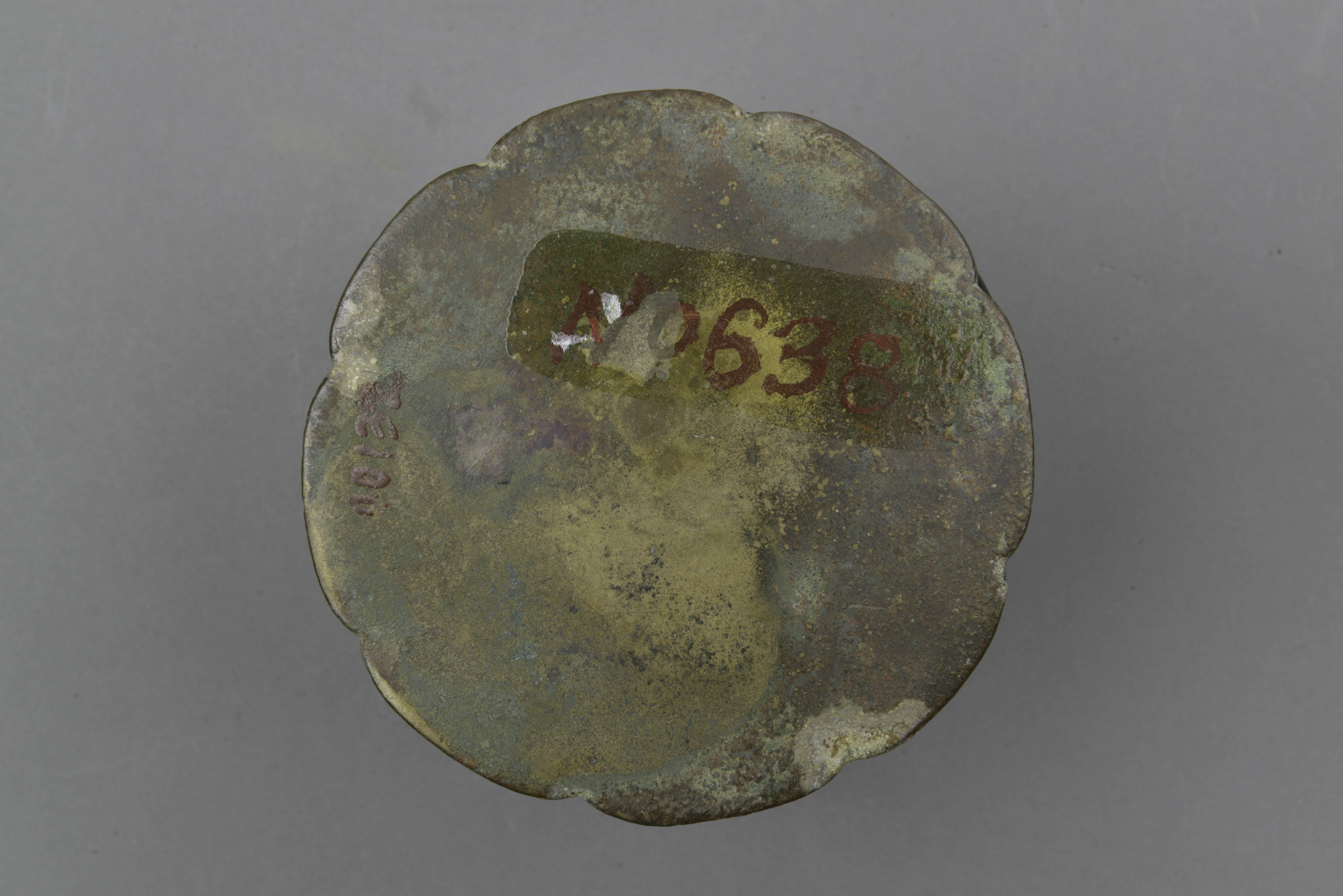圆形,小钮,钮外满饰连钱纹,钱纹排列紧密,钱孔中有小花瓣。外饰连珠纹一周。素缘。
