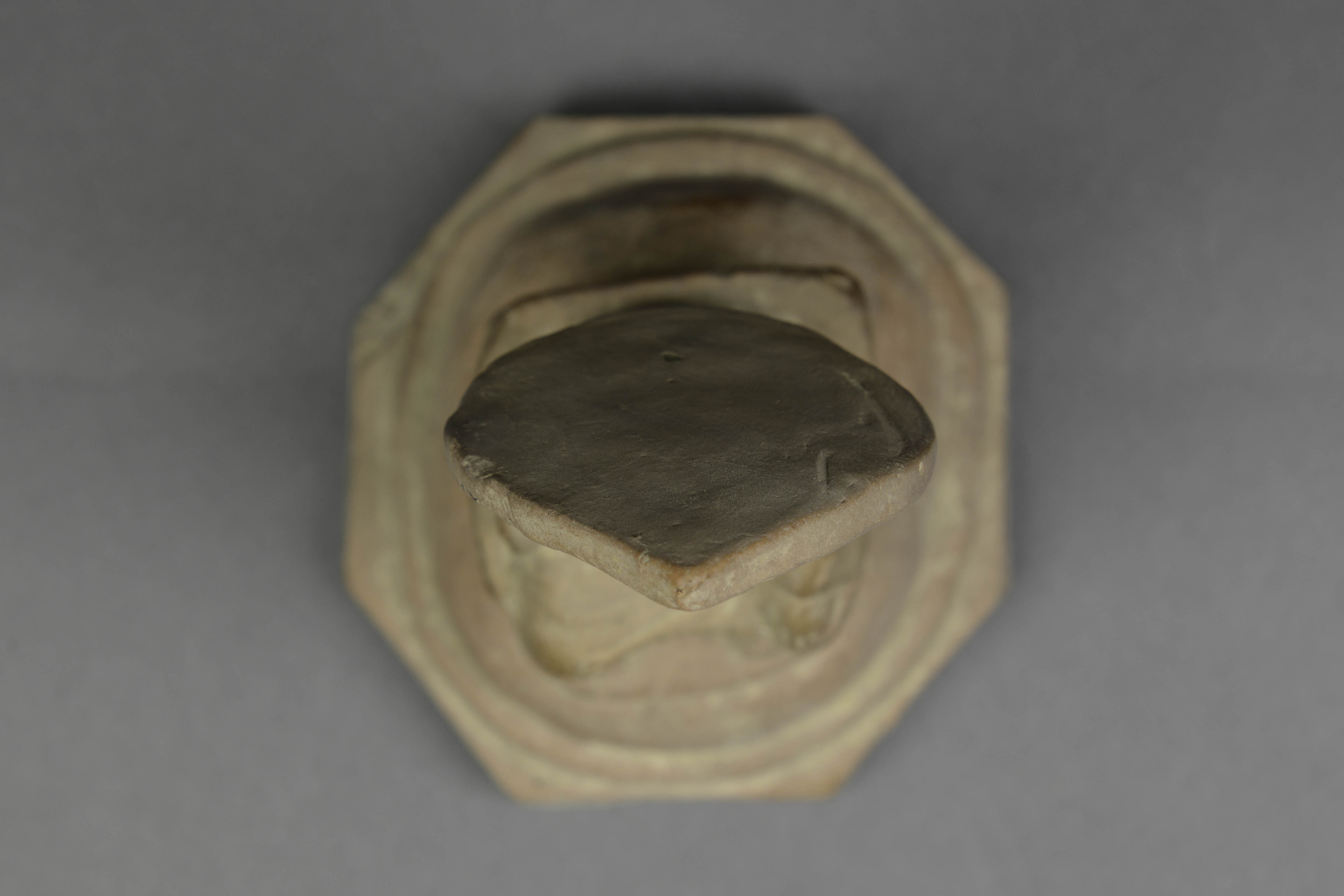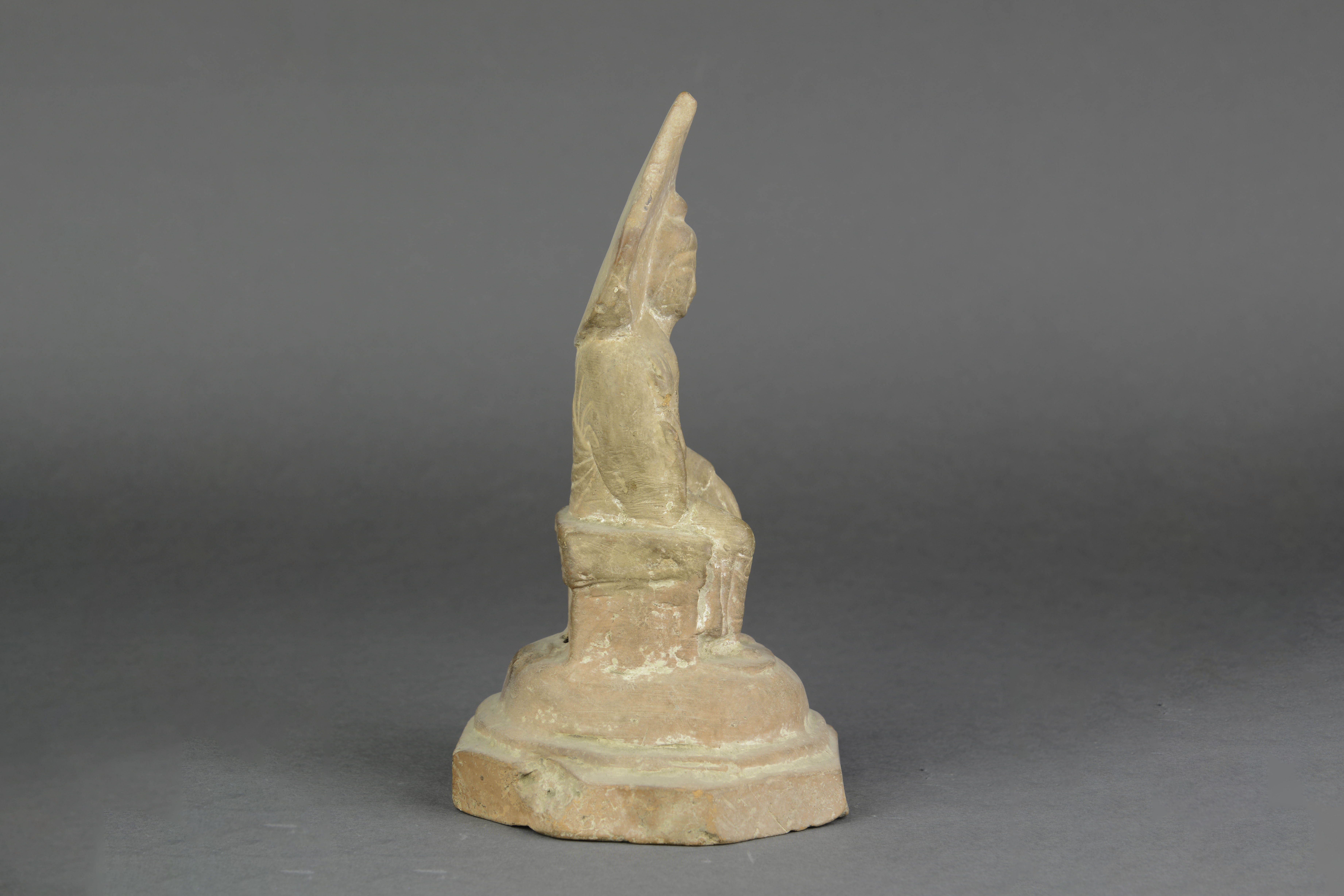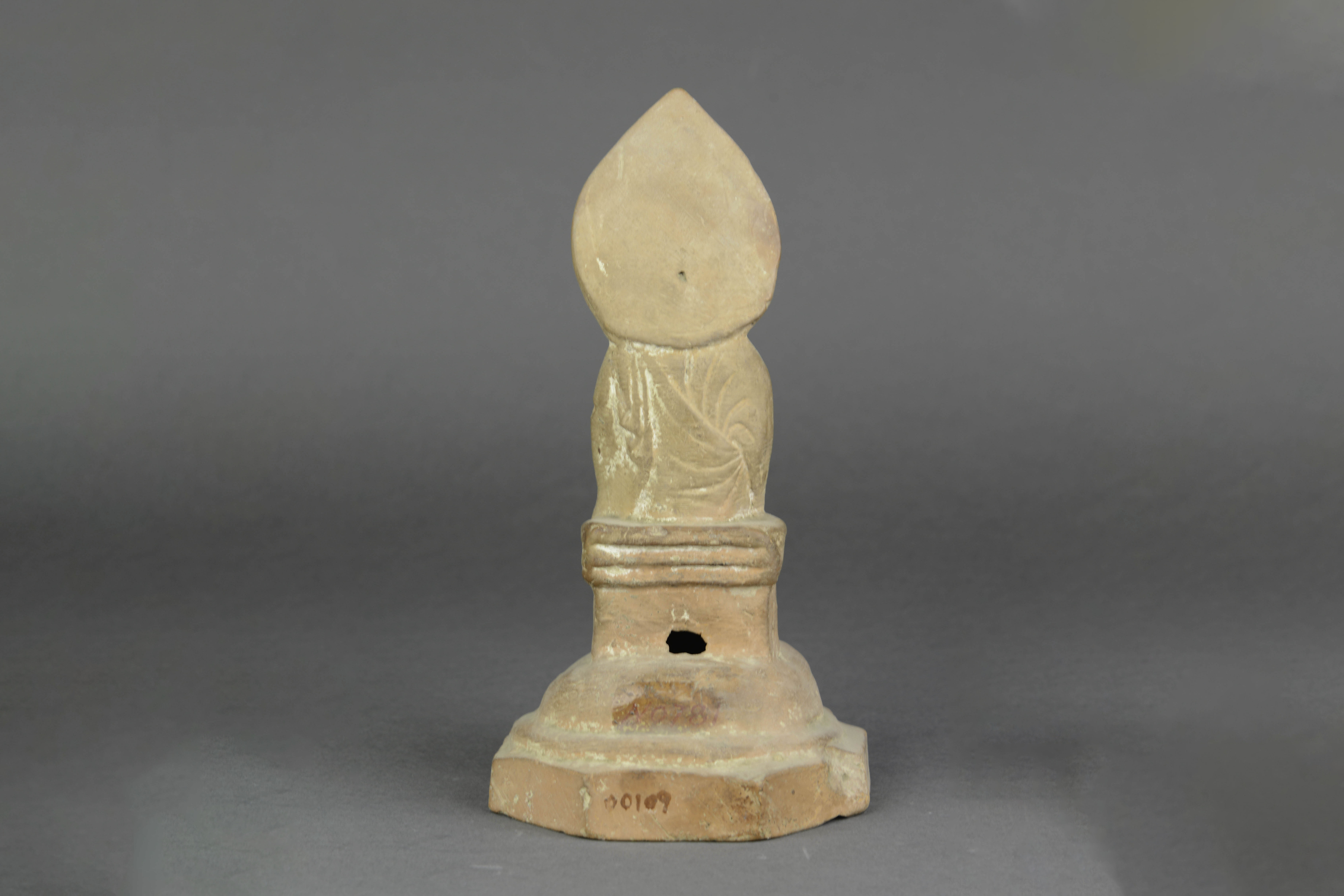 细泥红陶。佛呈坐姿,馒头状肉髻,发髻平展,面相长方形,眉弯曲,目微闭,隆鼻,厚唇,脑后有桃形头光,长颈,溜肩,内着交领衫,外着裹衣博带式袈裟,左臂下垂,手扶膝上,右臂上举,手扶肩上,跣足,坐床方形,下有上圆下方八角形须弥座。