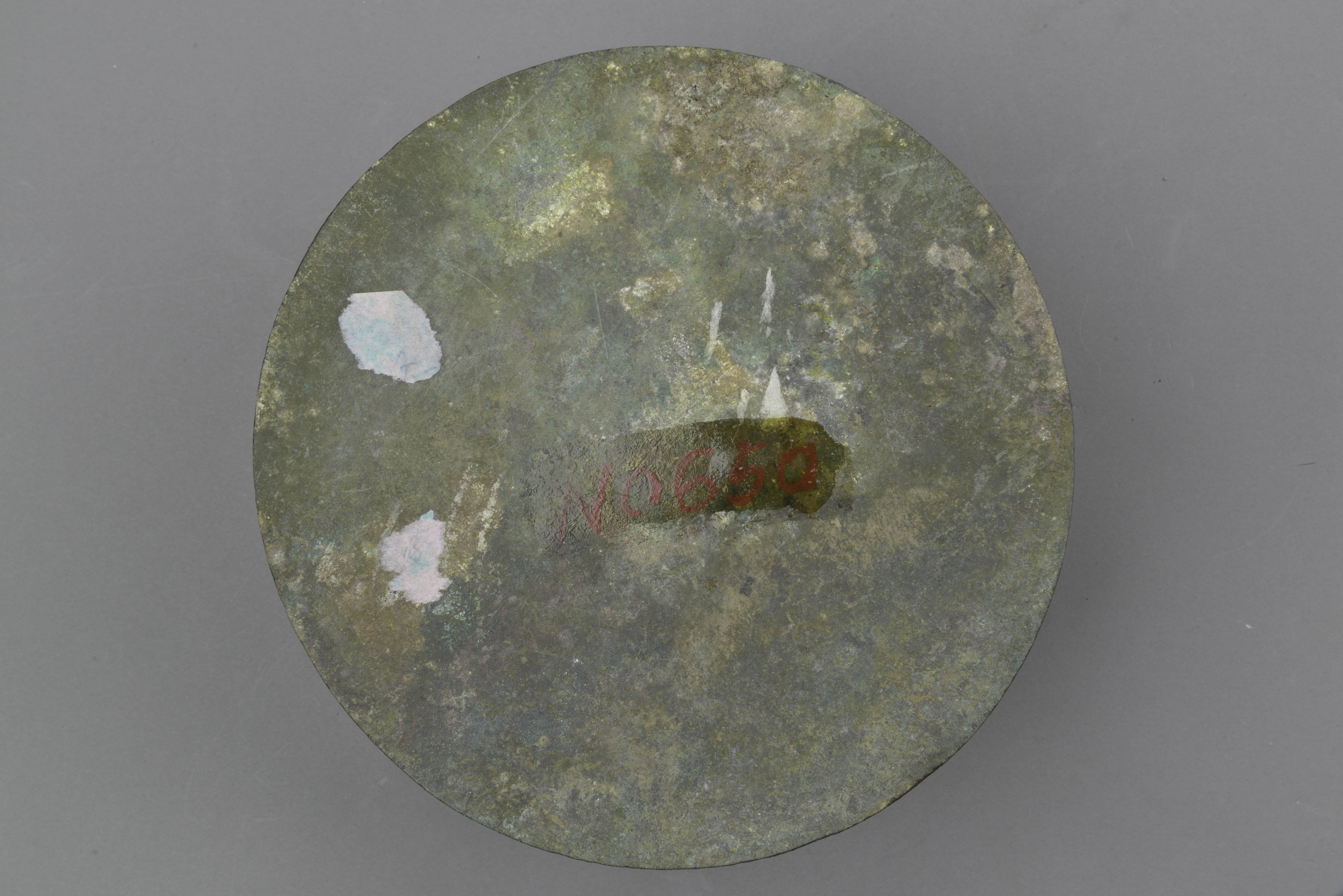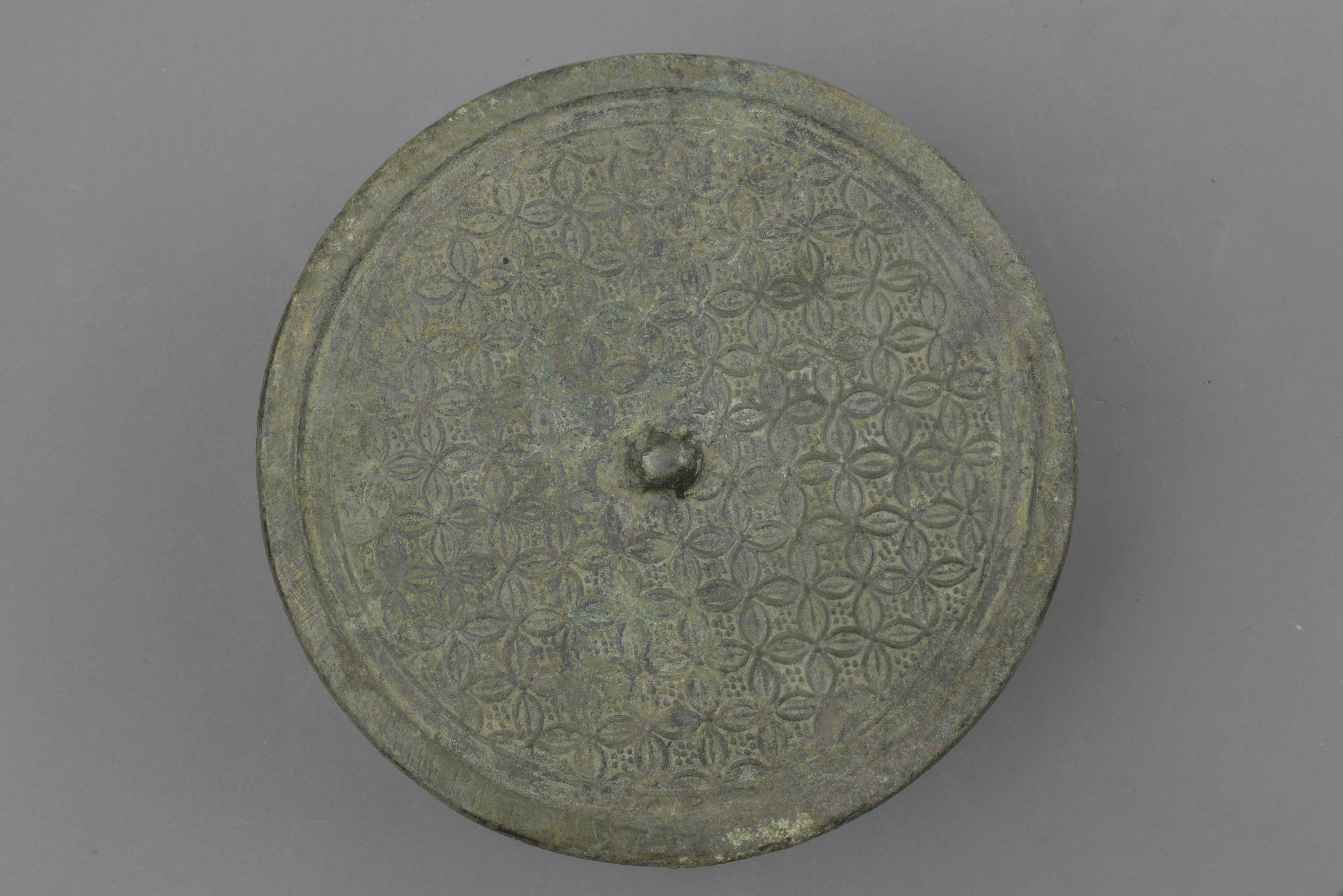 圆形,圆钮,钮外满饰连钱纹,钱孔中有小花瓣,素缘。