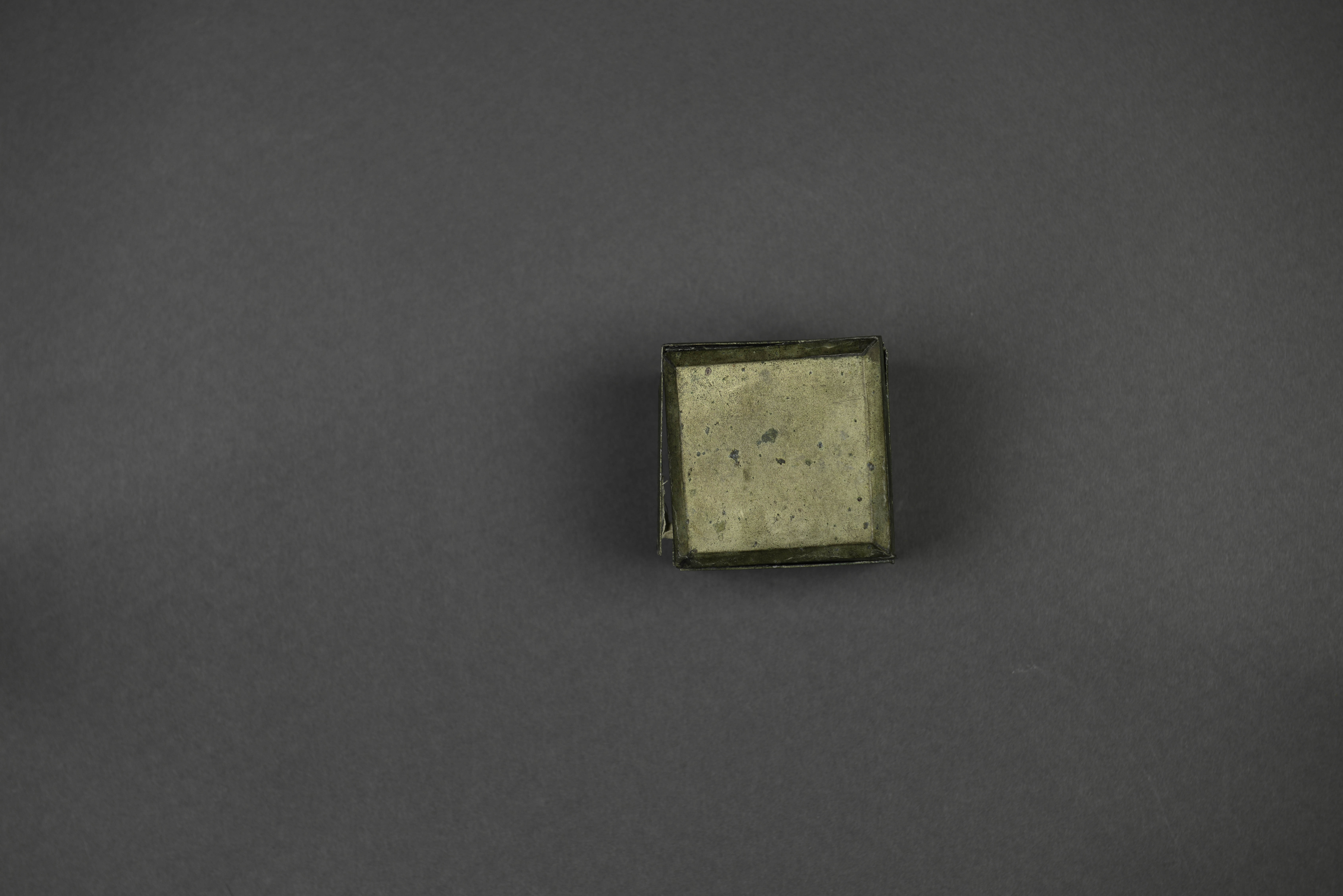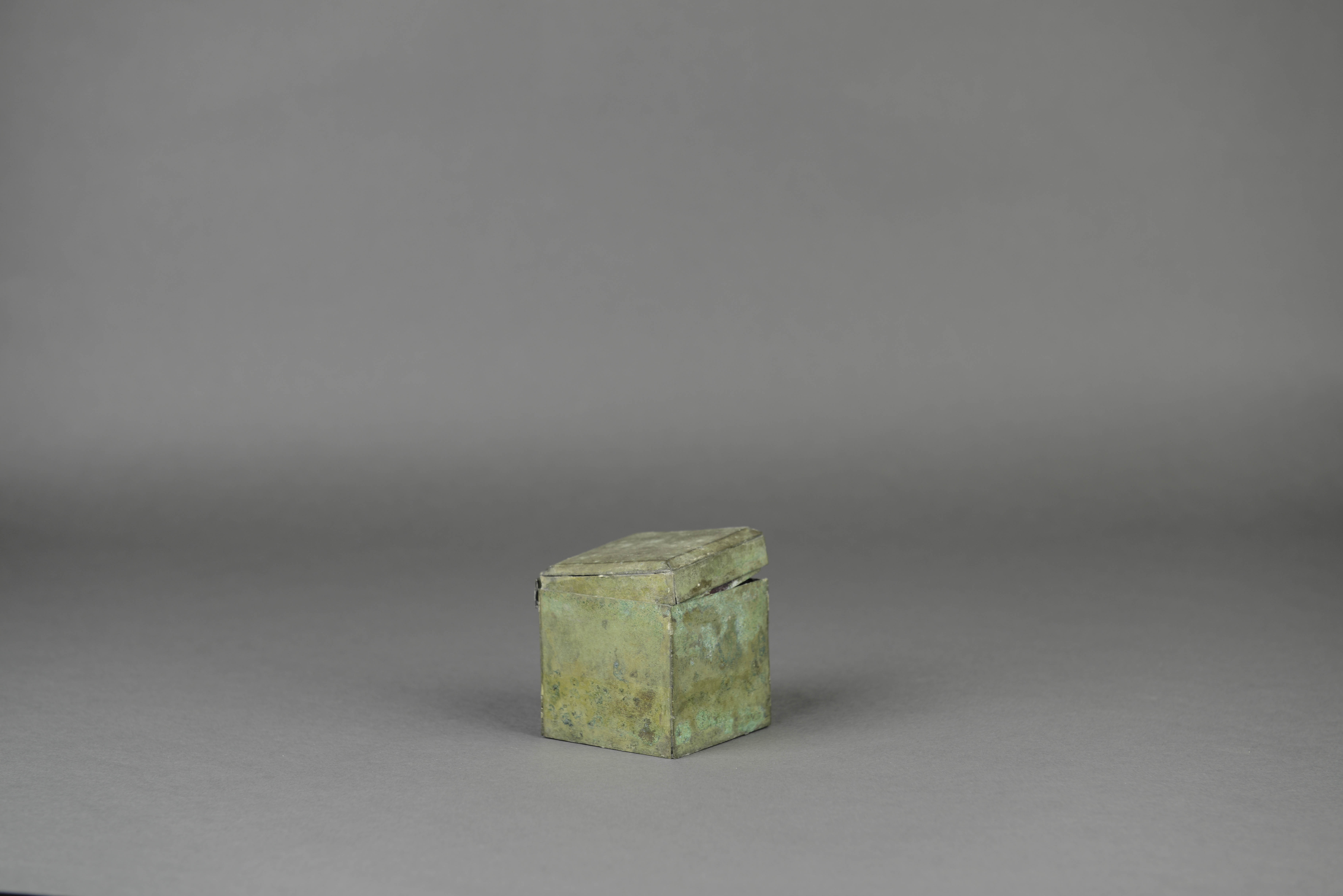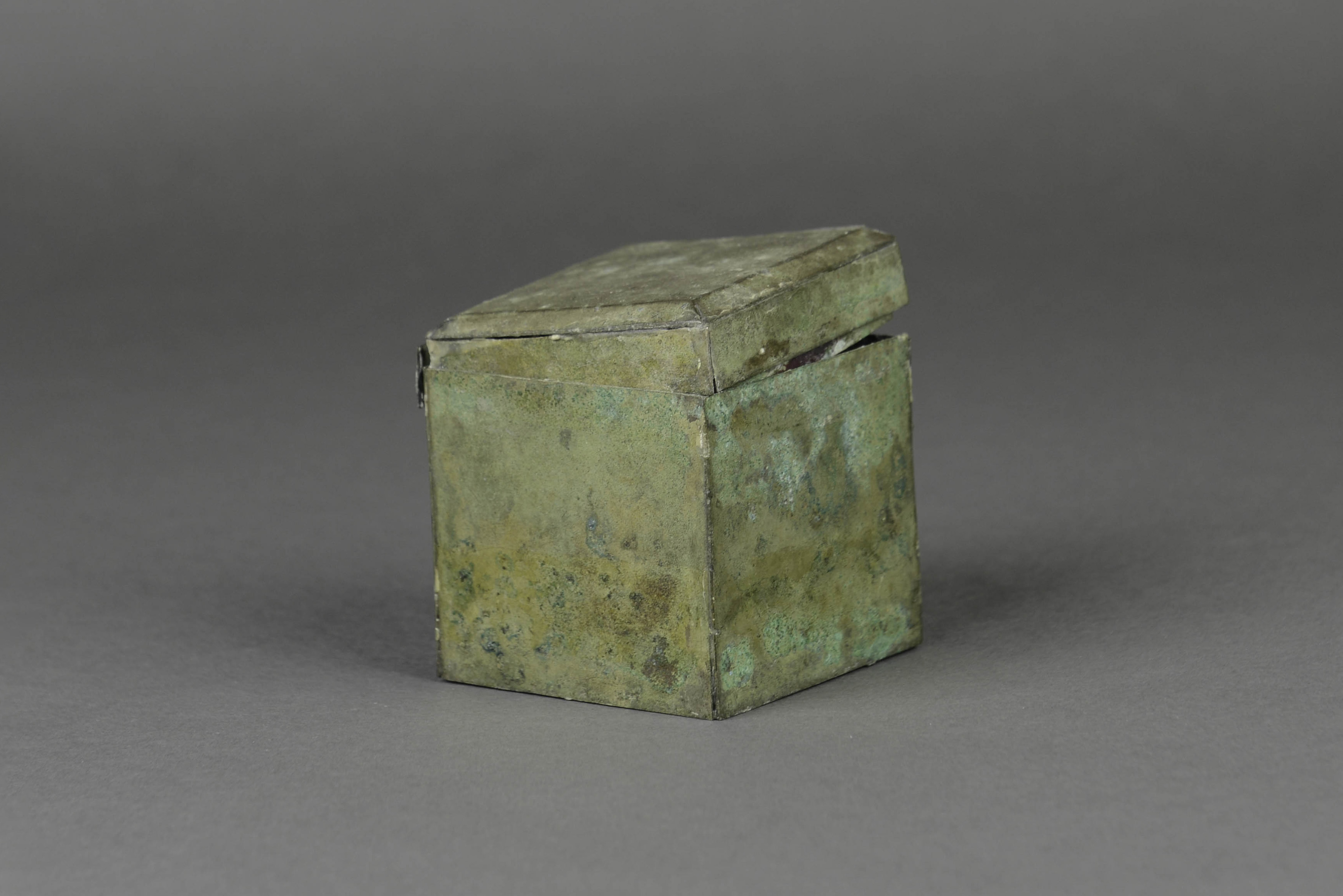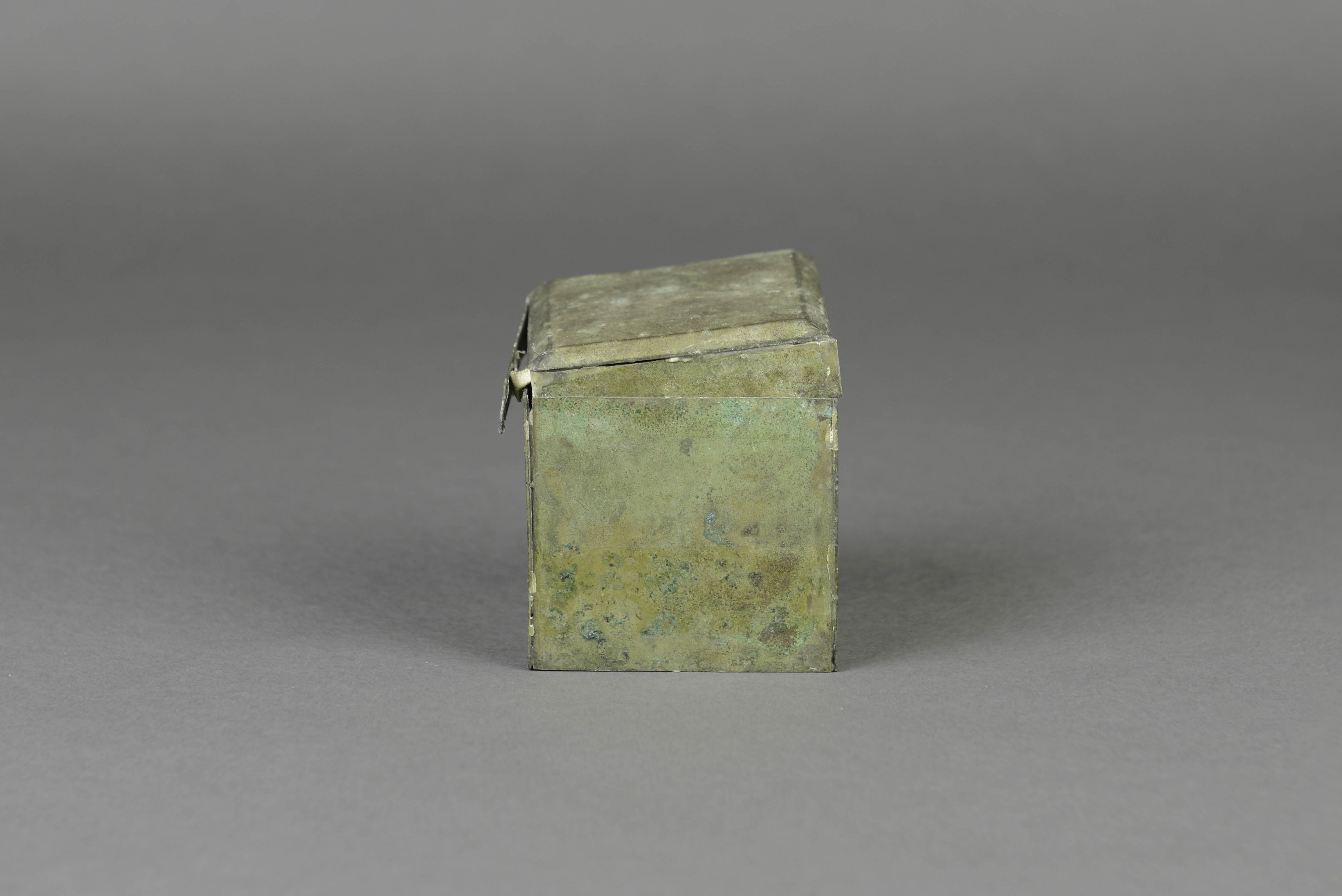 正方形盝顶,子母口,函身呈方形,鎏金。