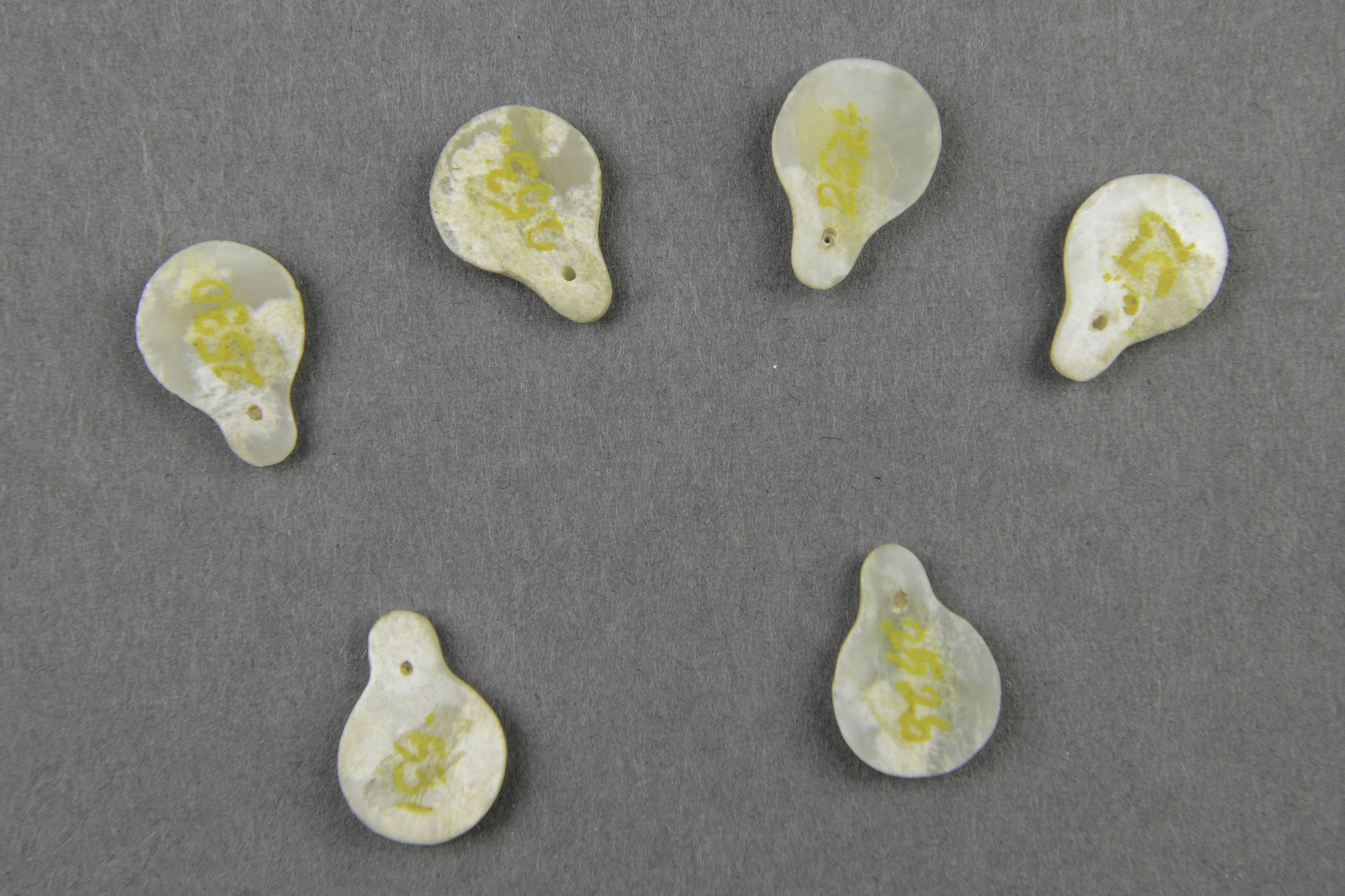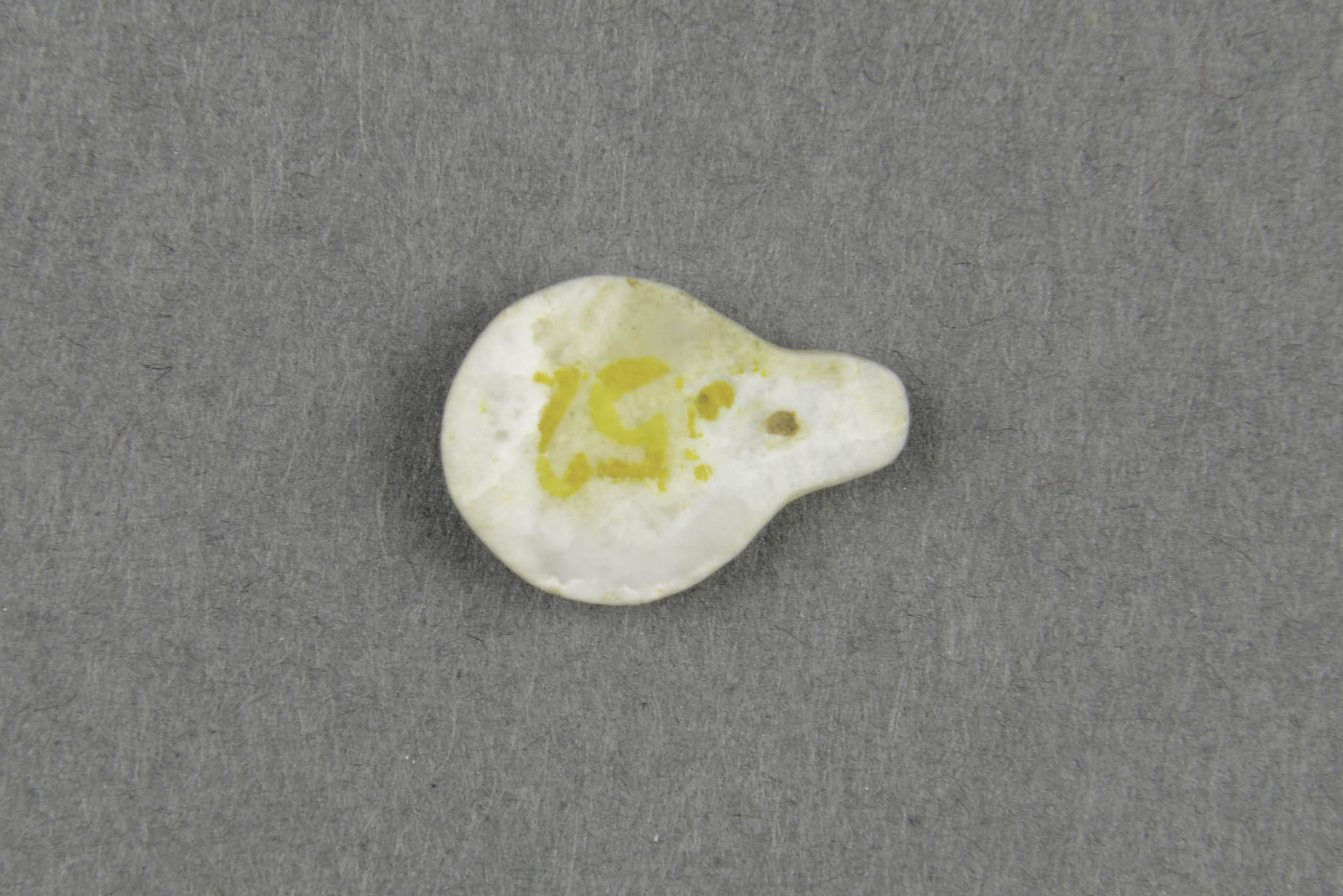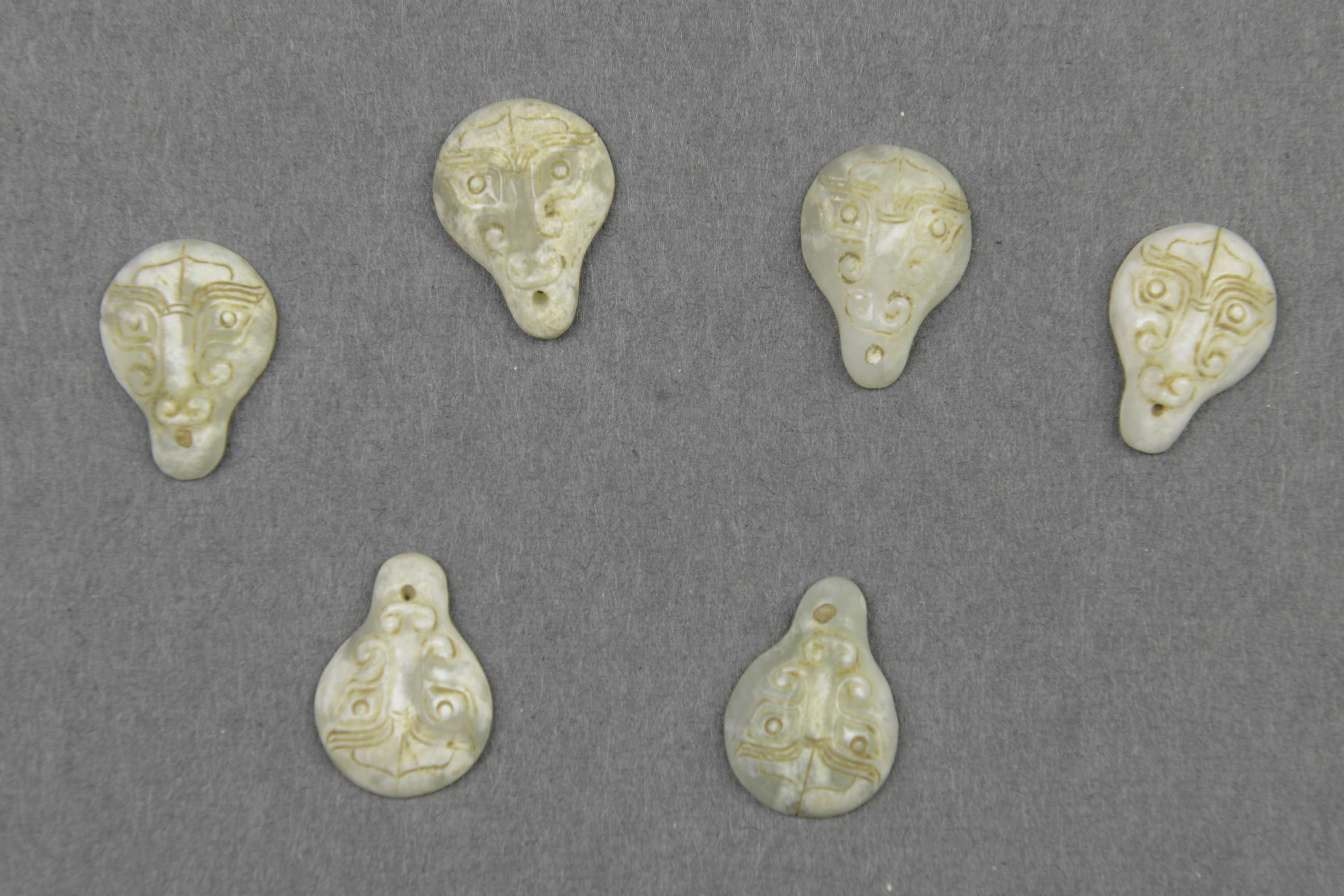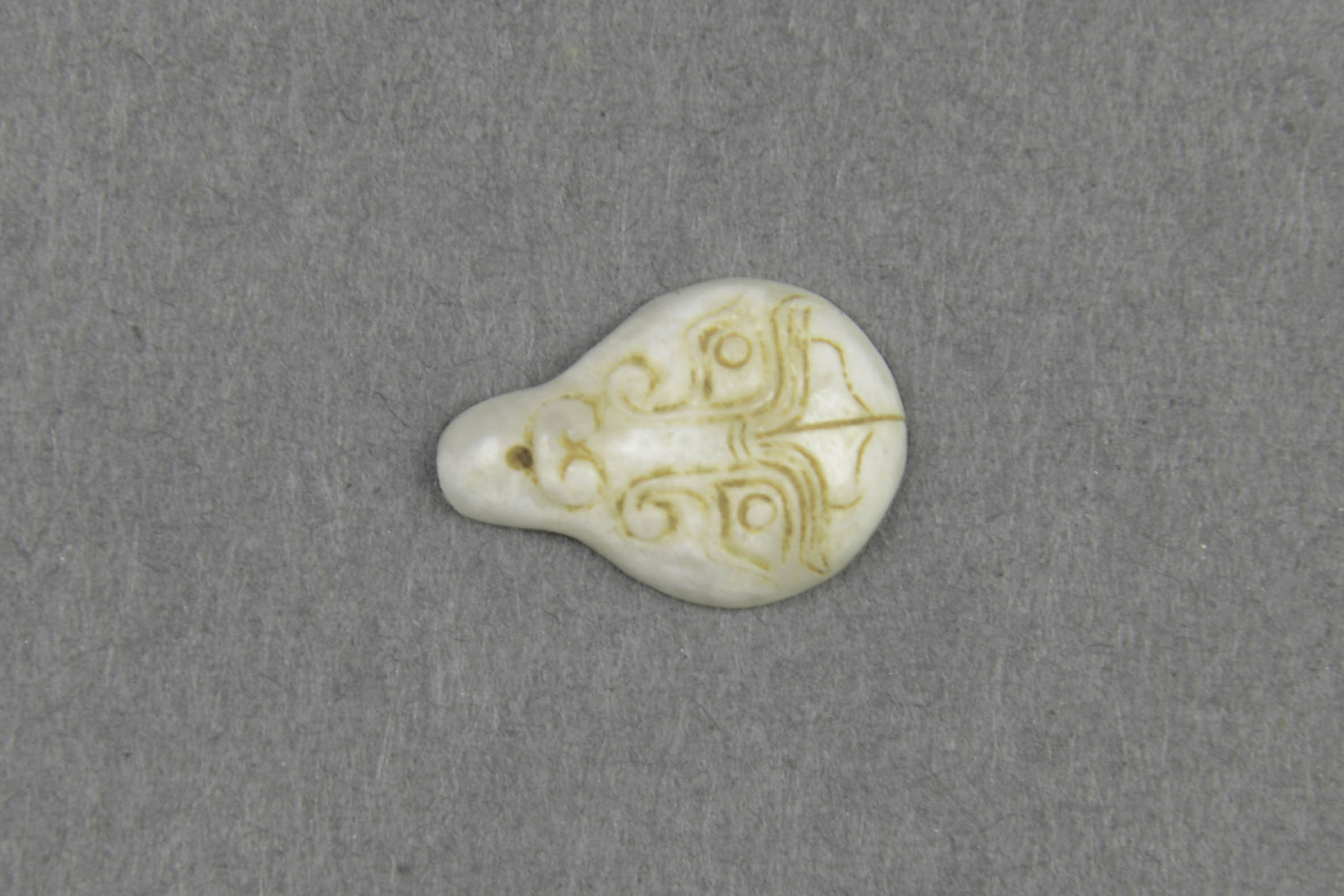 青白色独玉。器身上大下小呈瓢形,平背,隆面雕兽面纹,下端有一小穿孔,手法细腻,工艺精湛。