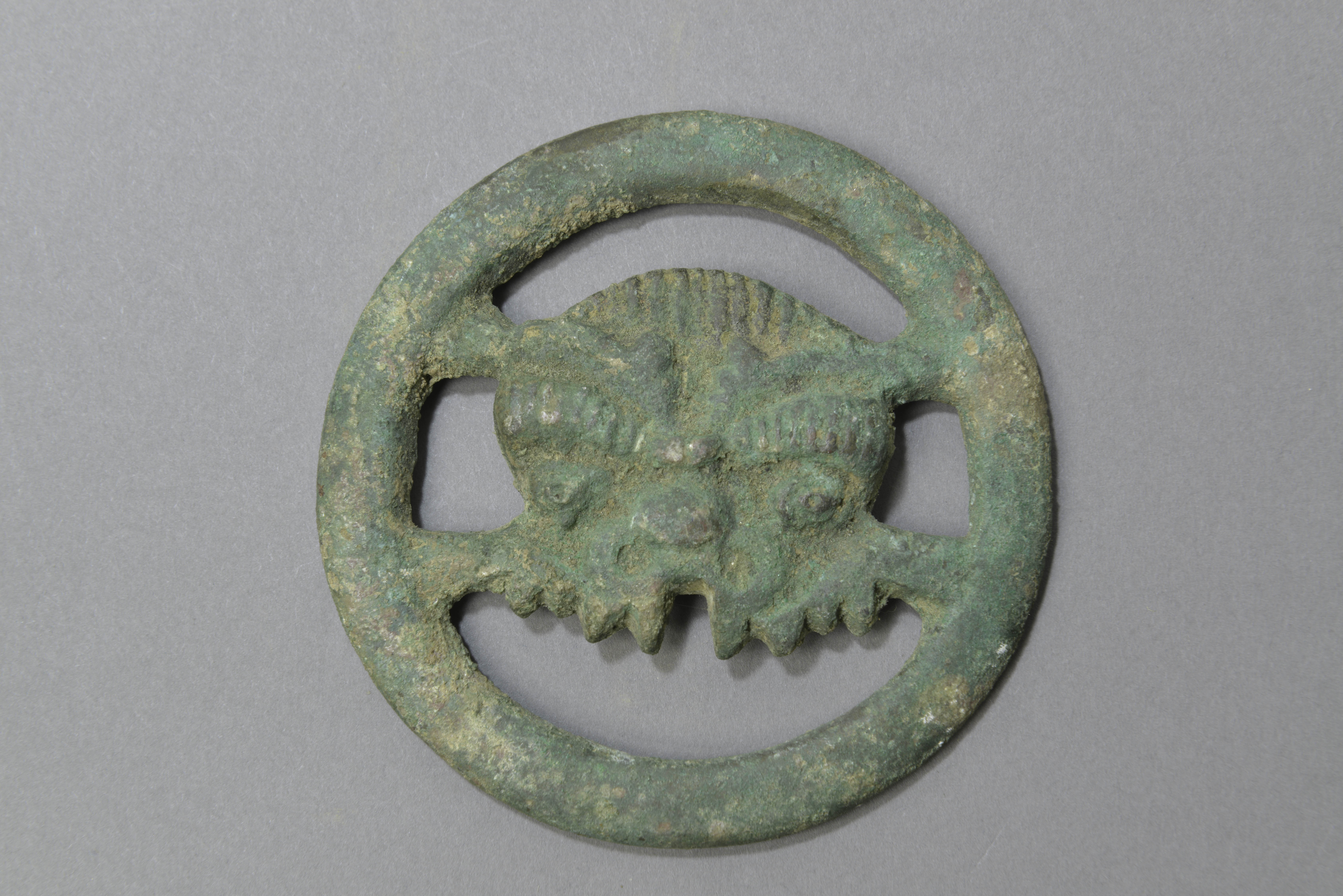 圆片状,中部镂空饰一兽面。粗眉瞠目,龇牙咧嘴。