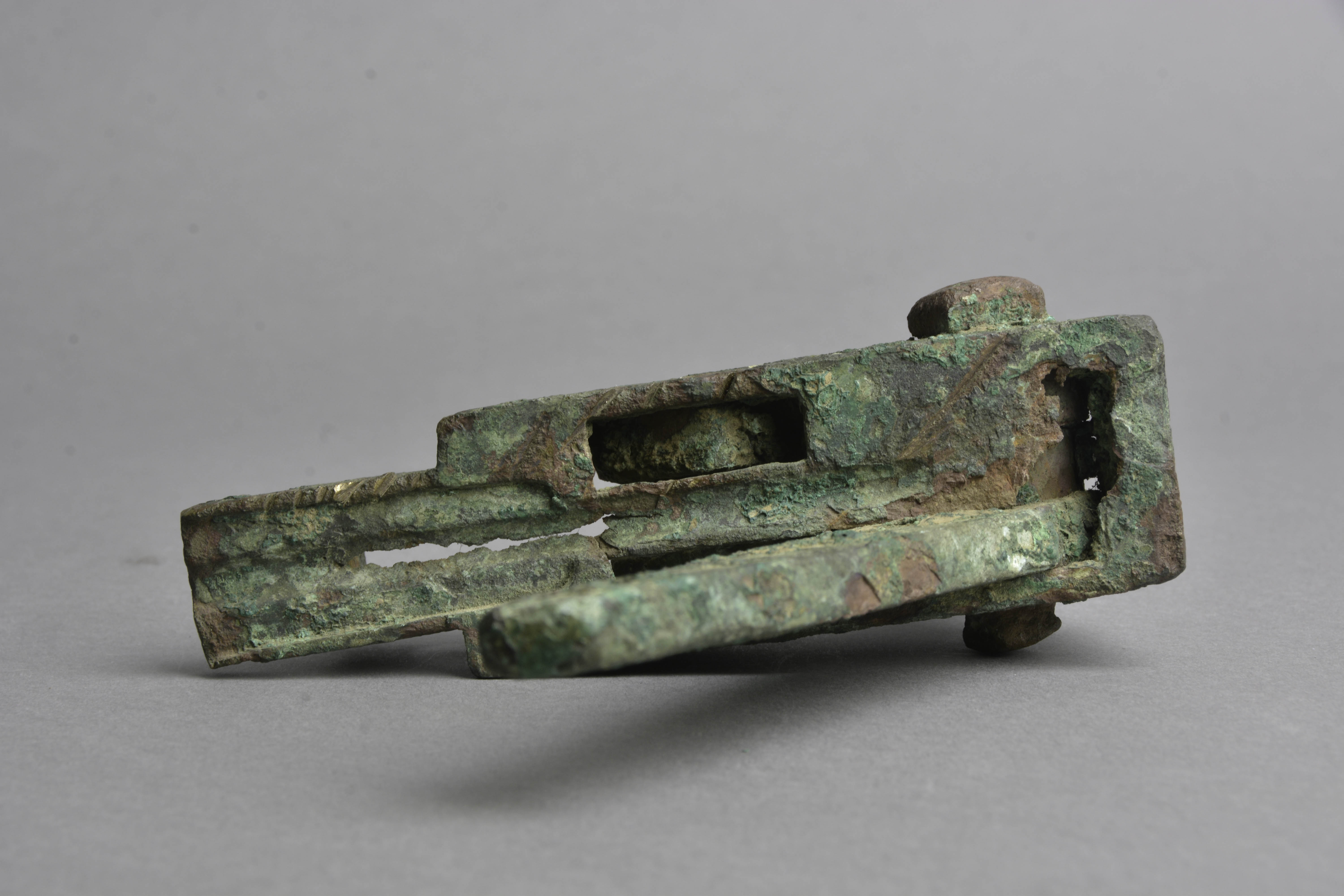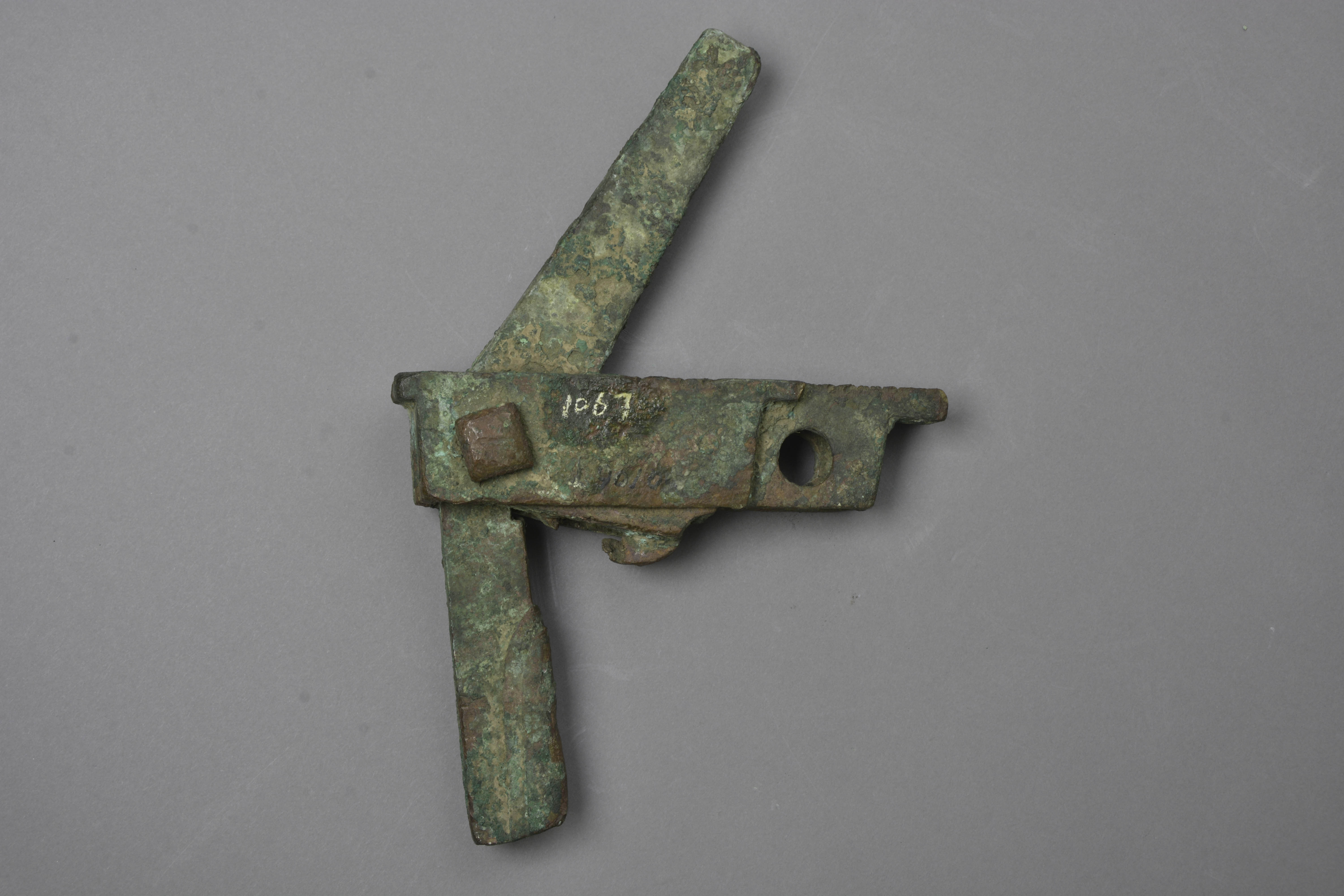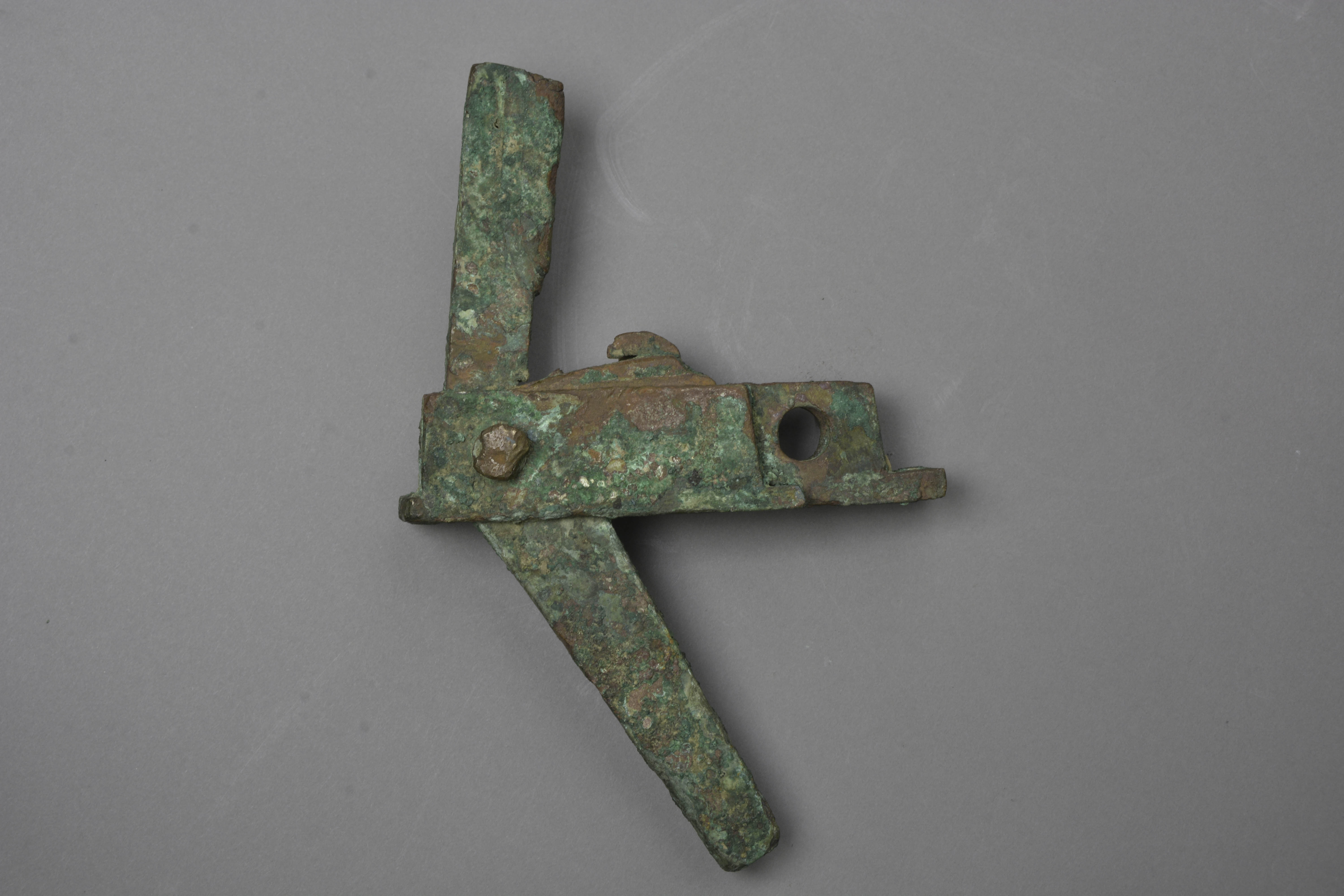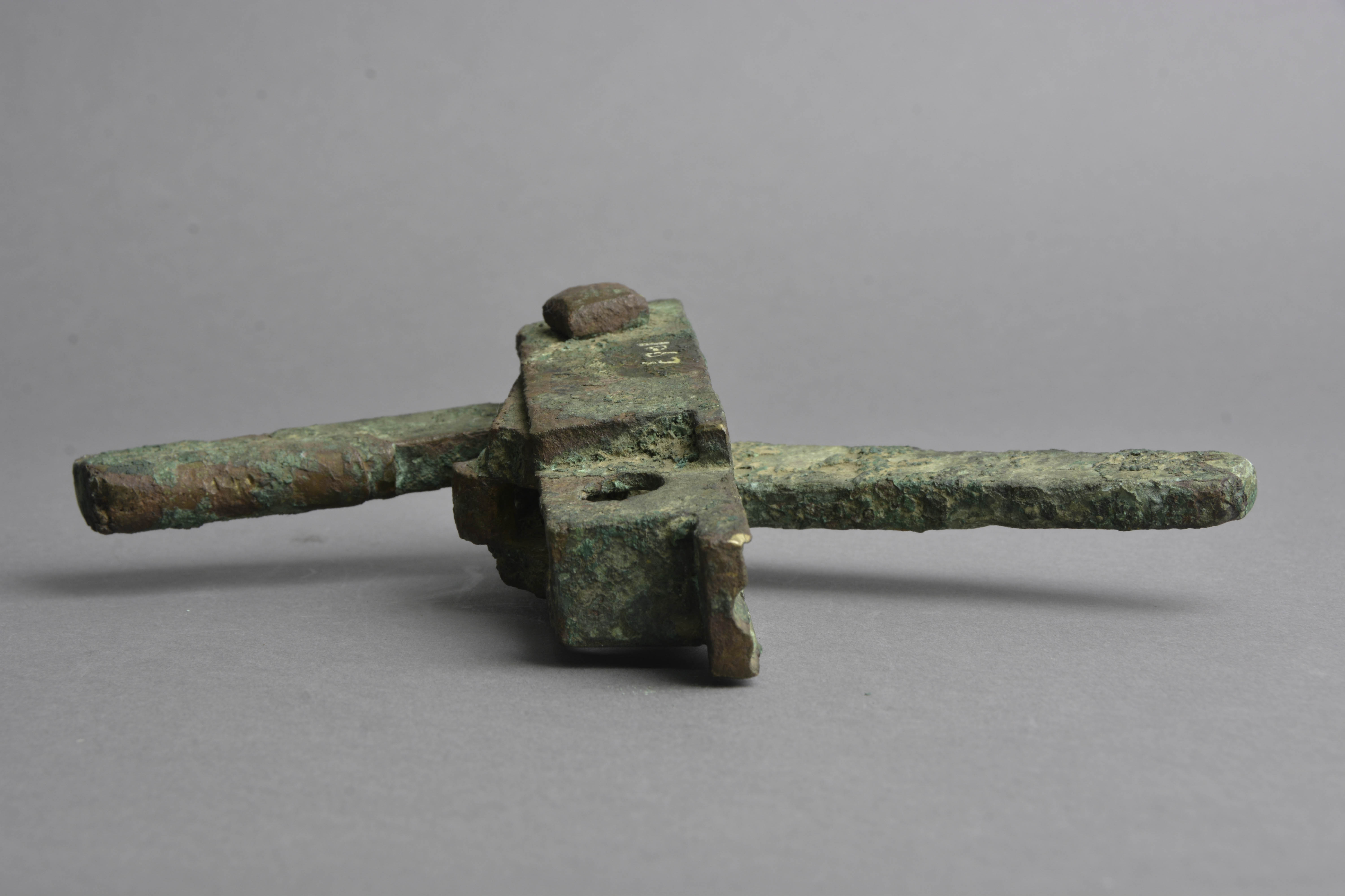 有郭,郭面中间设箭槽,侧面前后各有一横穿孔,以键将悬刀、望、牙、钩心等共穿。