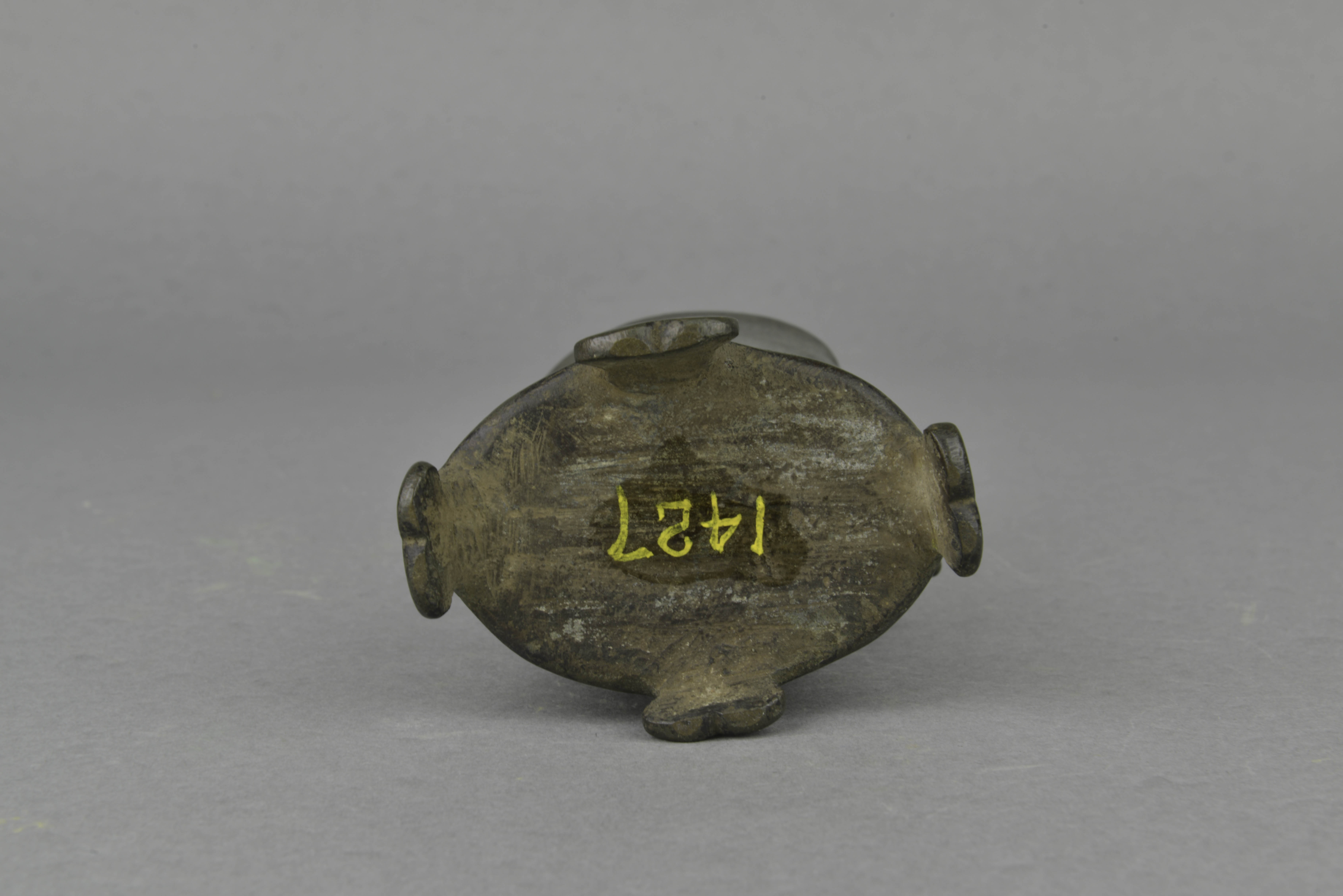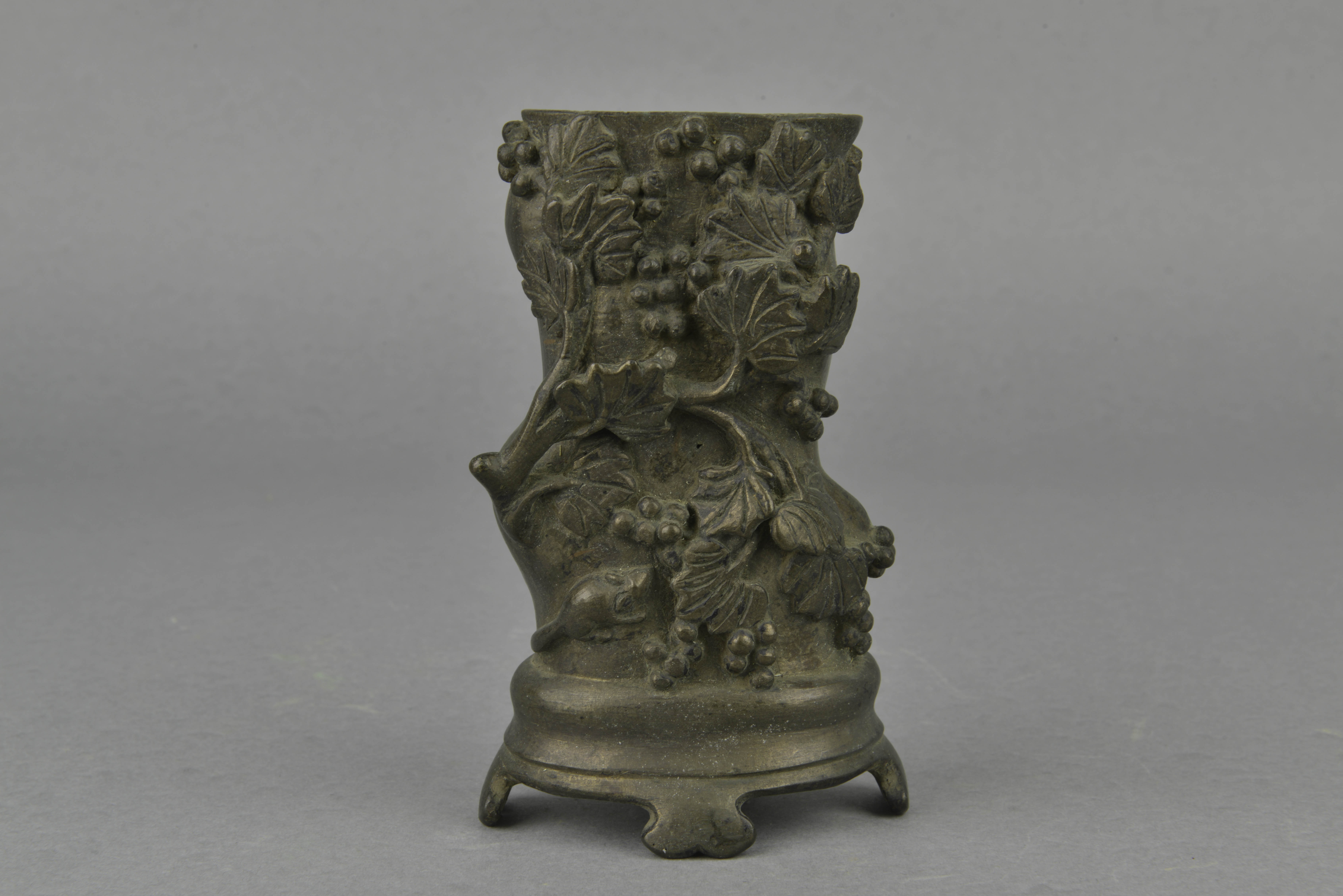 椭圆形口,器身呈枯枝形,四矮足。器身正面浮雕折枝葡萄及一松鼠。