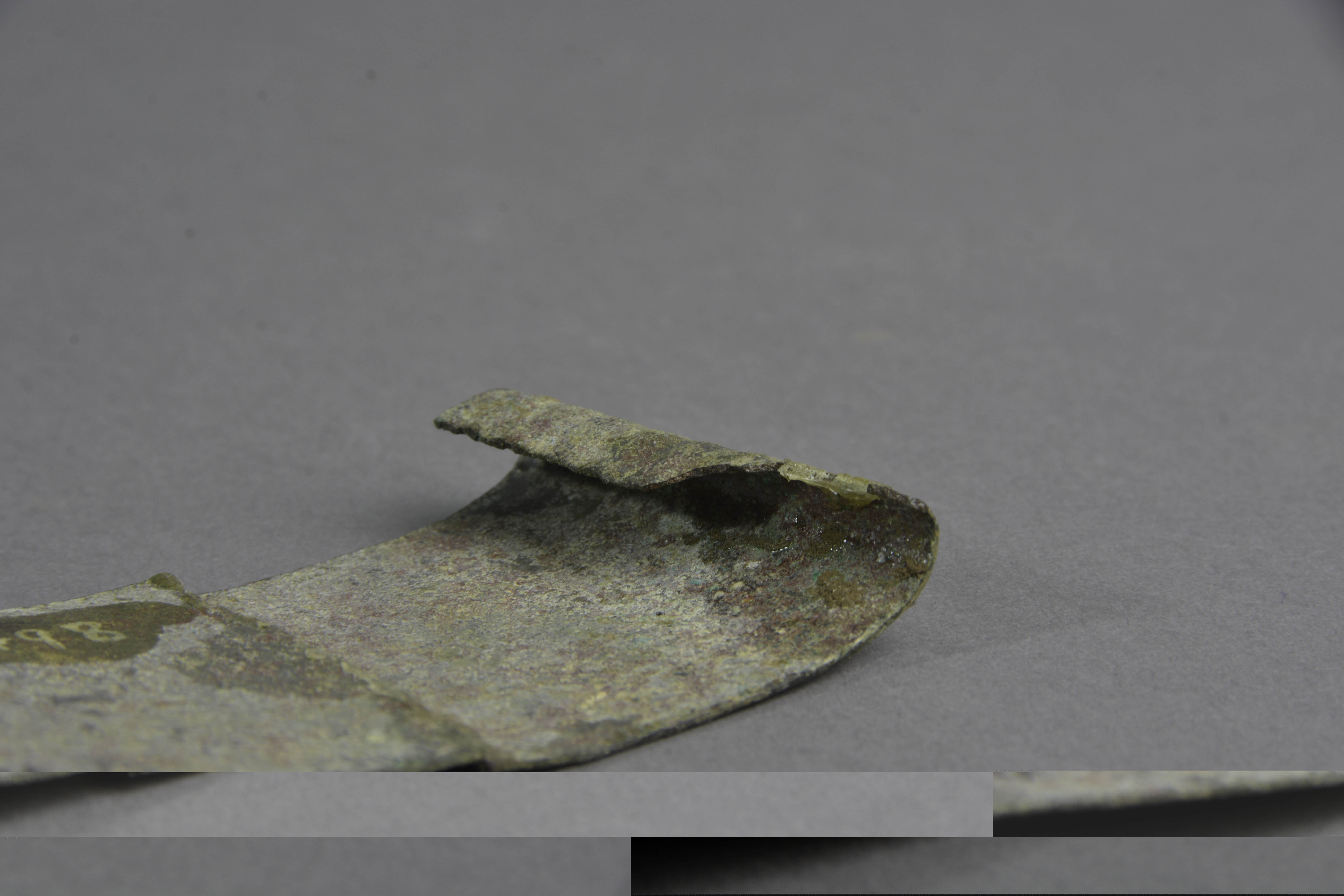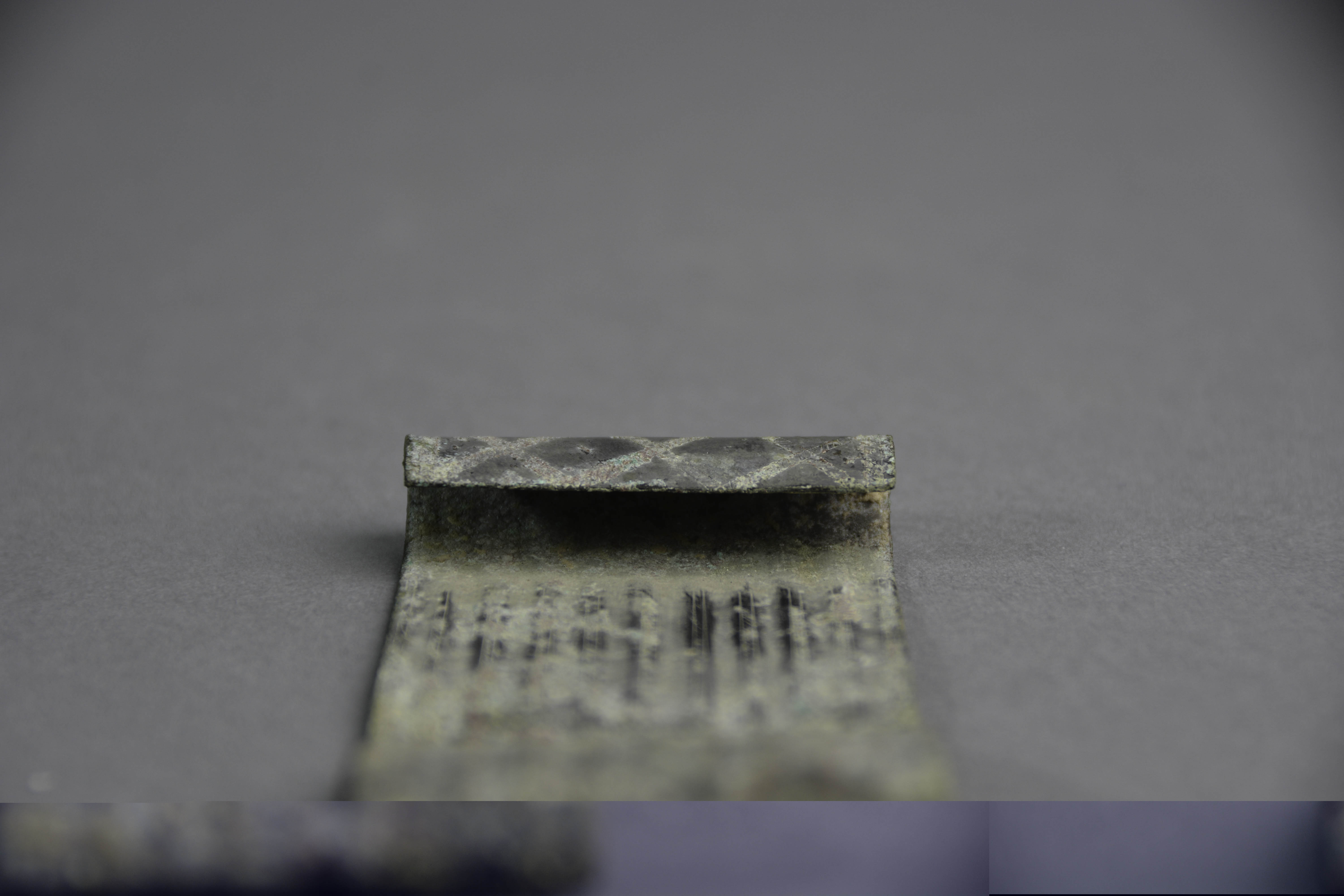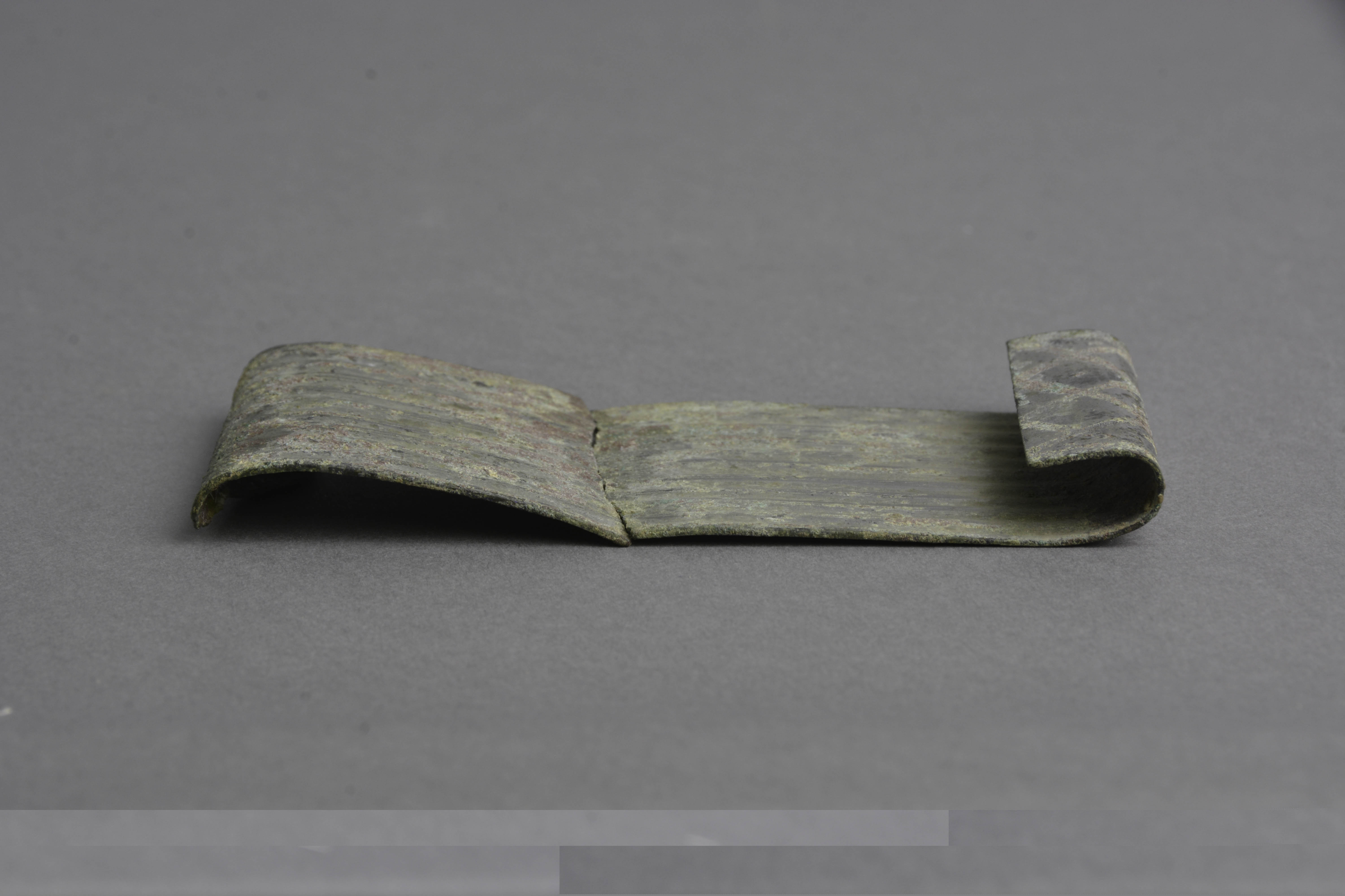 宽板两端上下卷曲呈“S”形。正面饰11道凸弦纹,弦纹内饰细斜线纹。