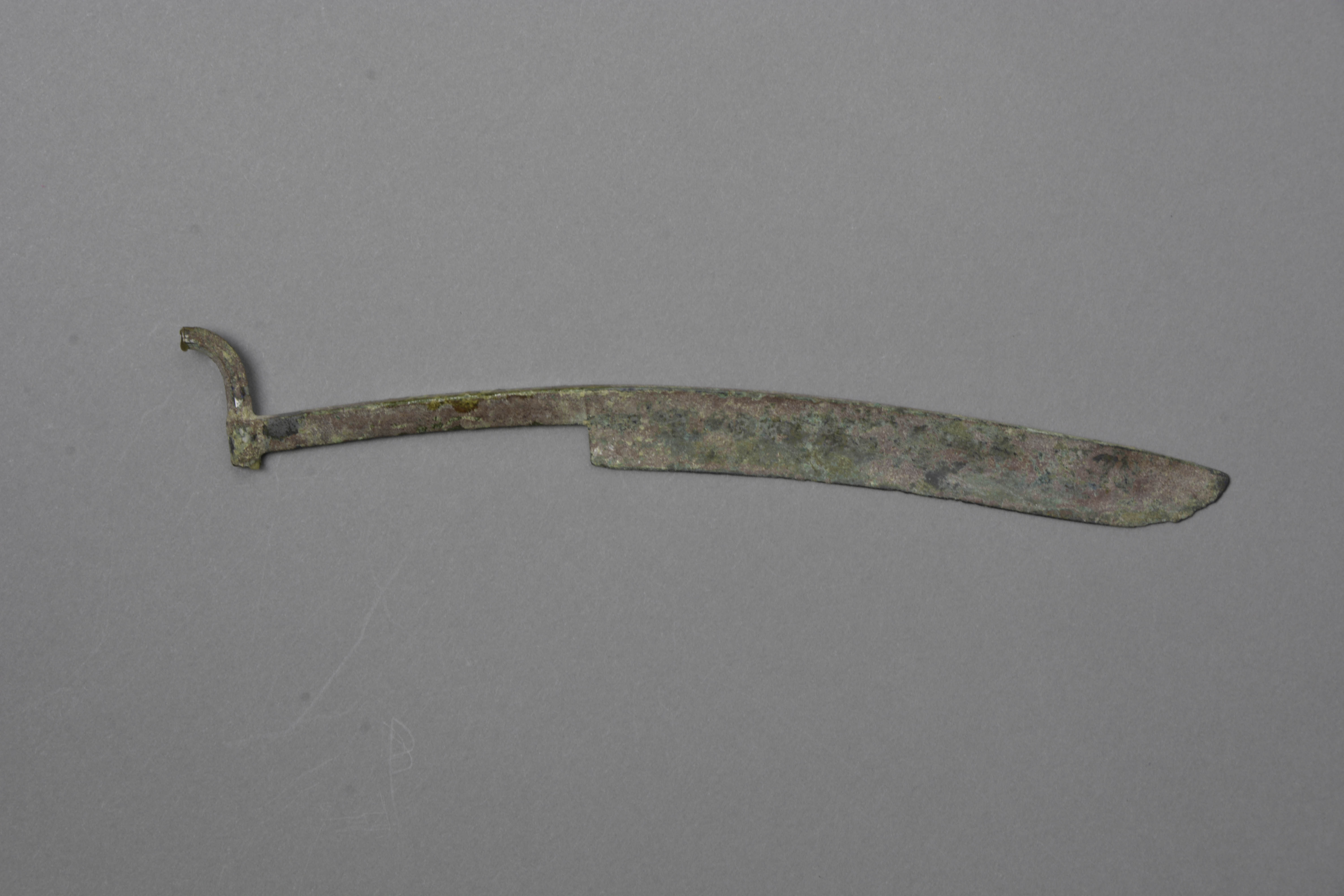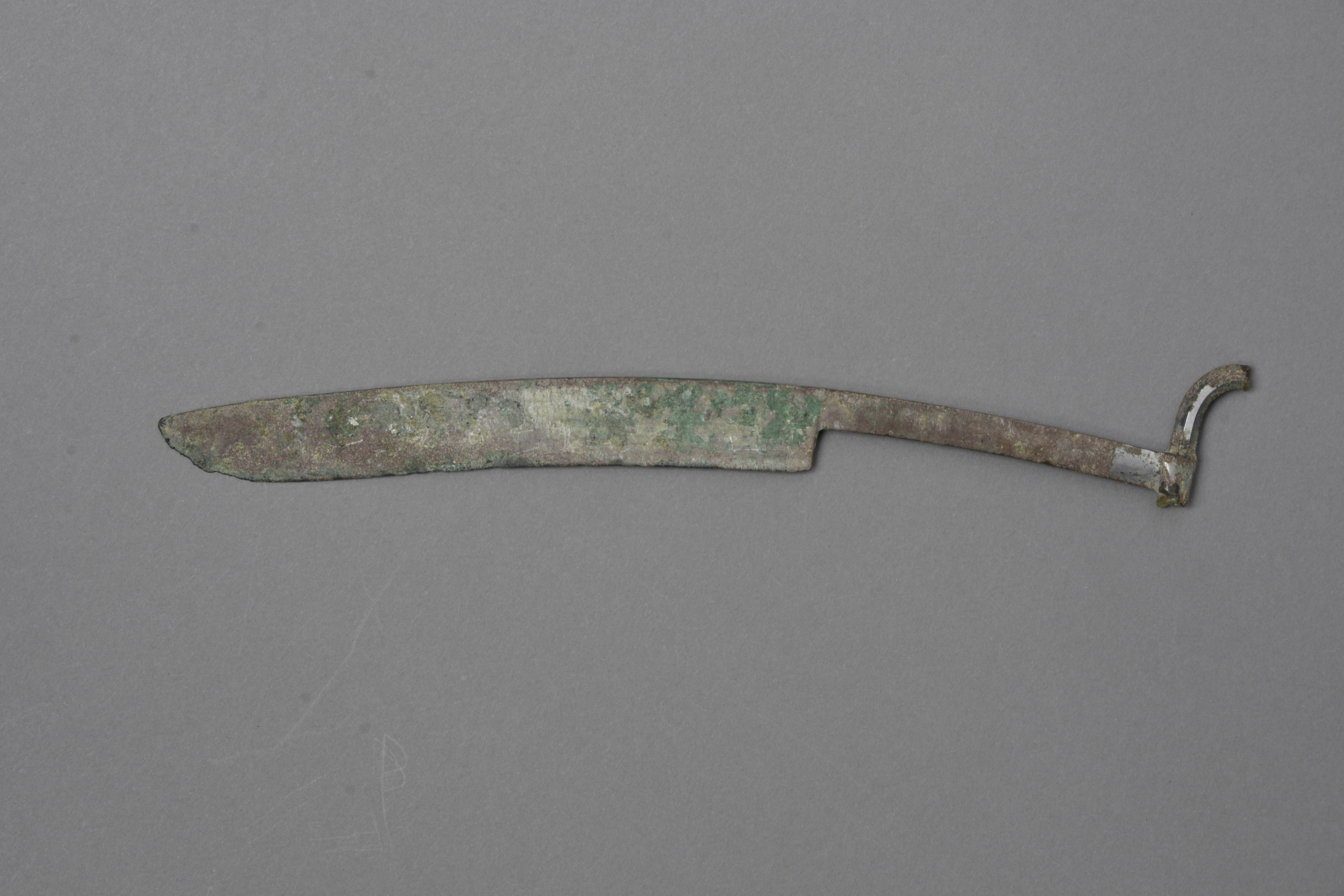 扁长条弧形,细条柄,柄端有一环首。刃面锋利。