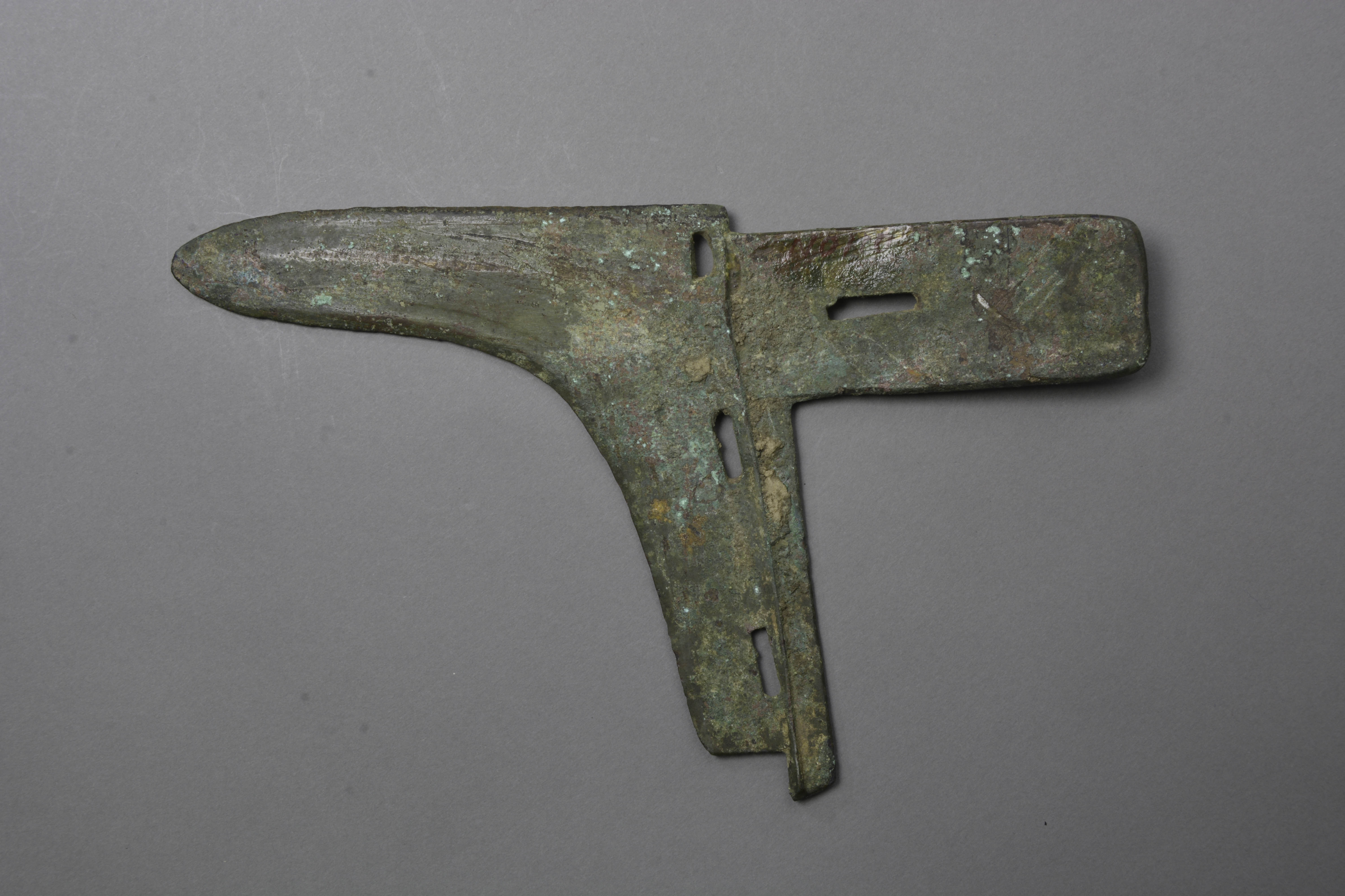 短援,中部起脊,长胡,下阑,阑侧三穿,长方形内,上一横穿。