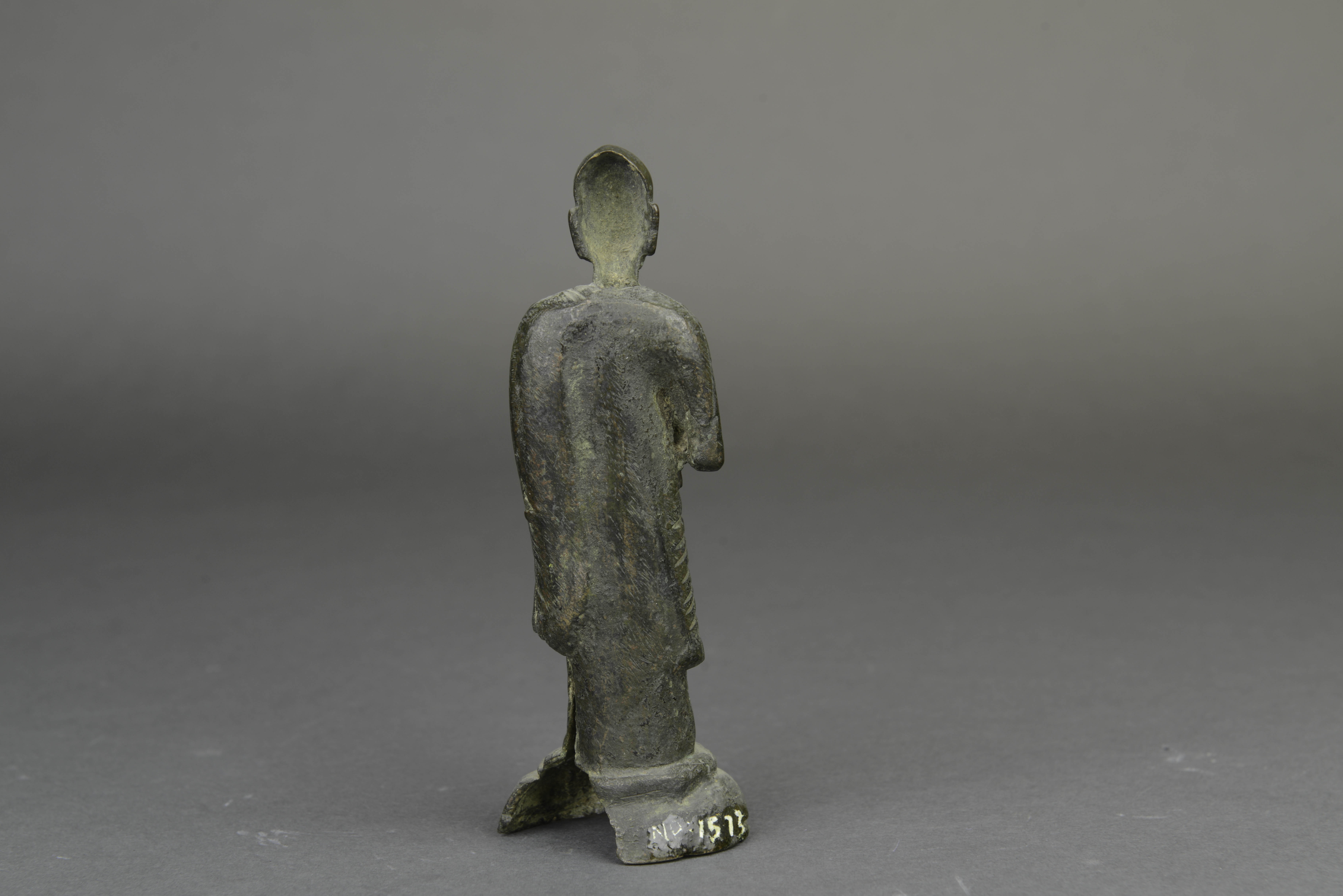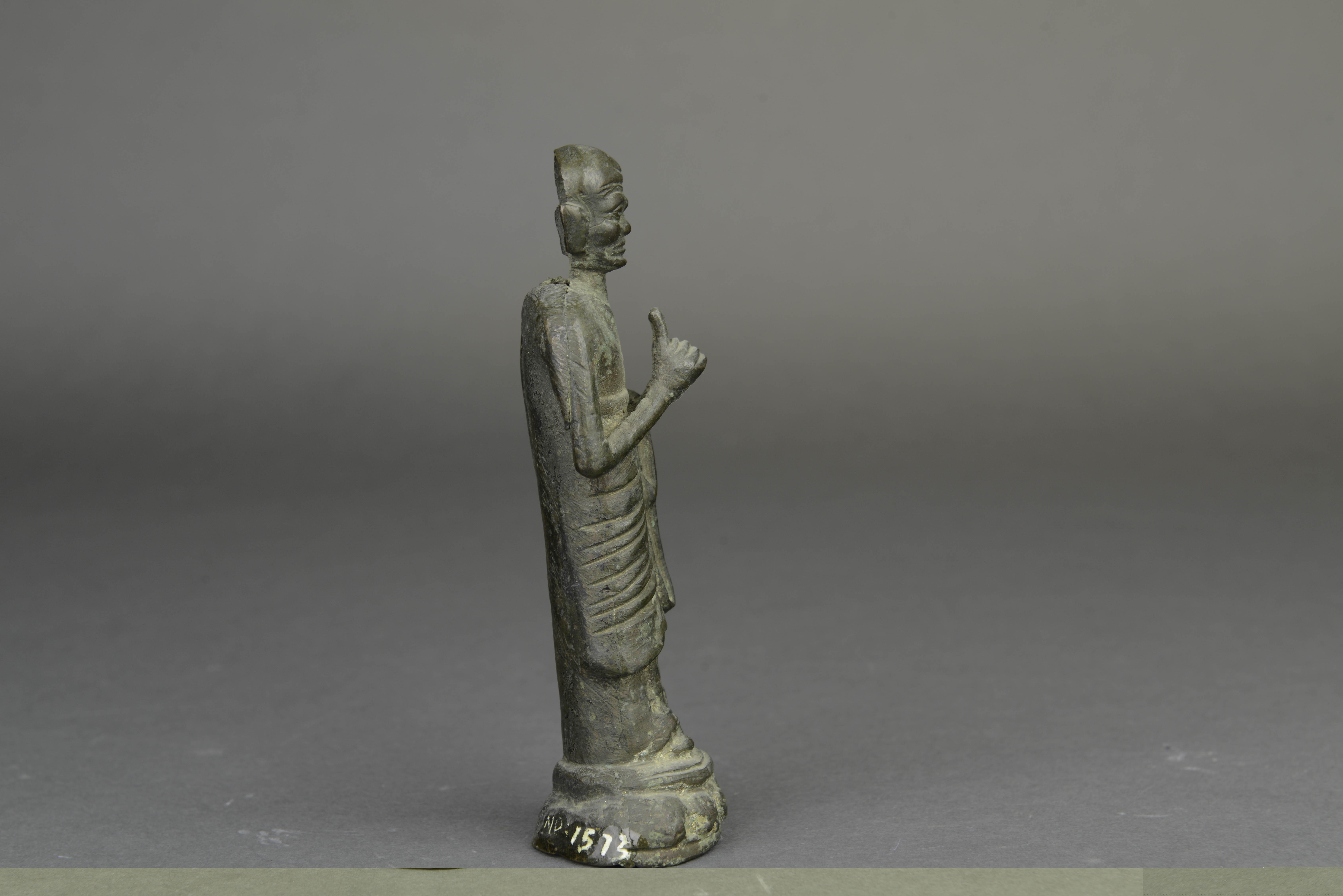 面相丰硕,细眉,双目微睁,直鼻小口,僧衣外披袈裟,胸部打结。双手合十于胸前,跣足立于俯莲座之上。