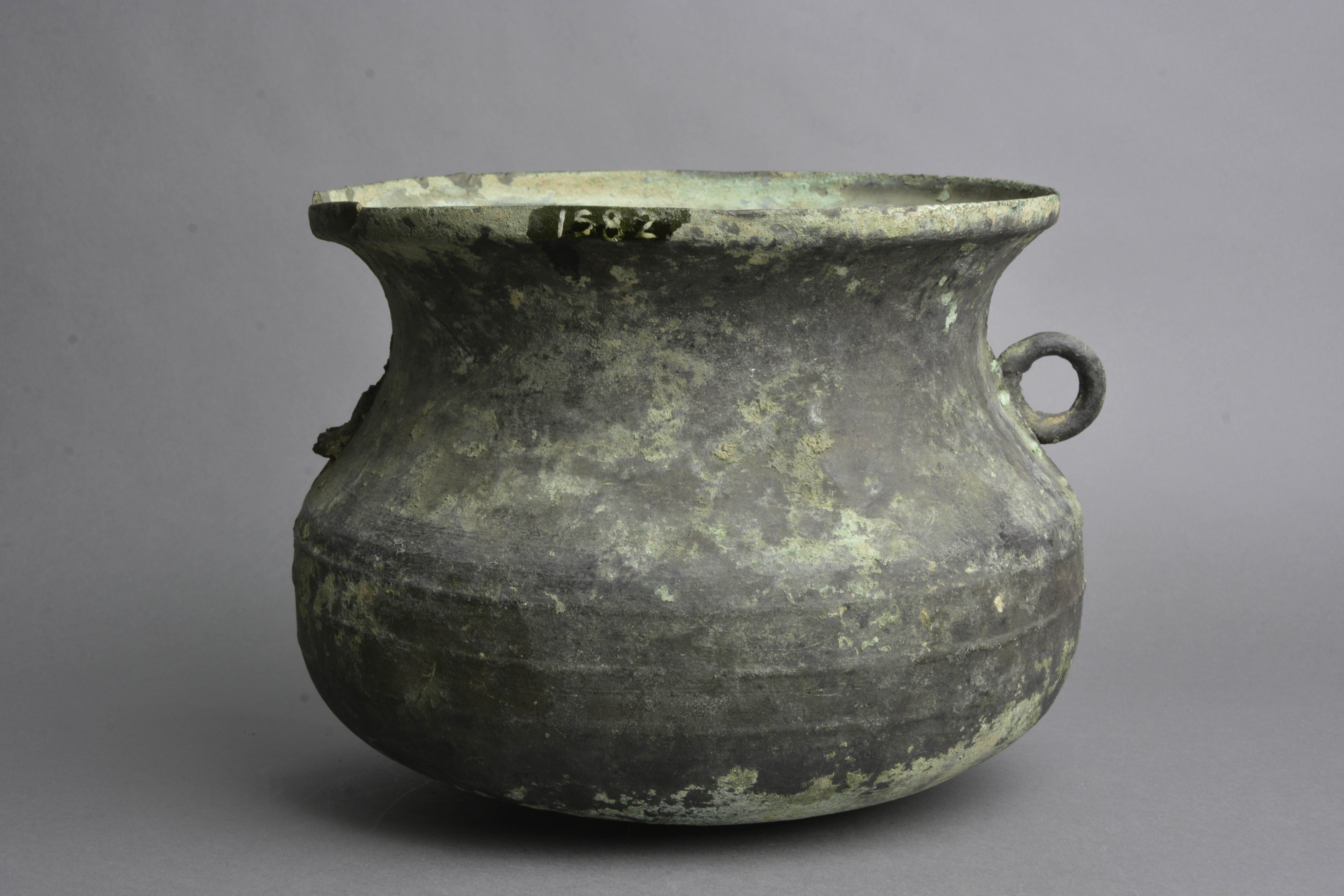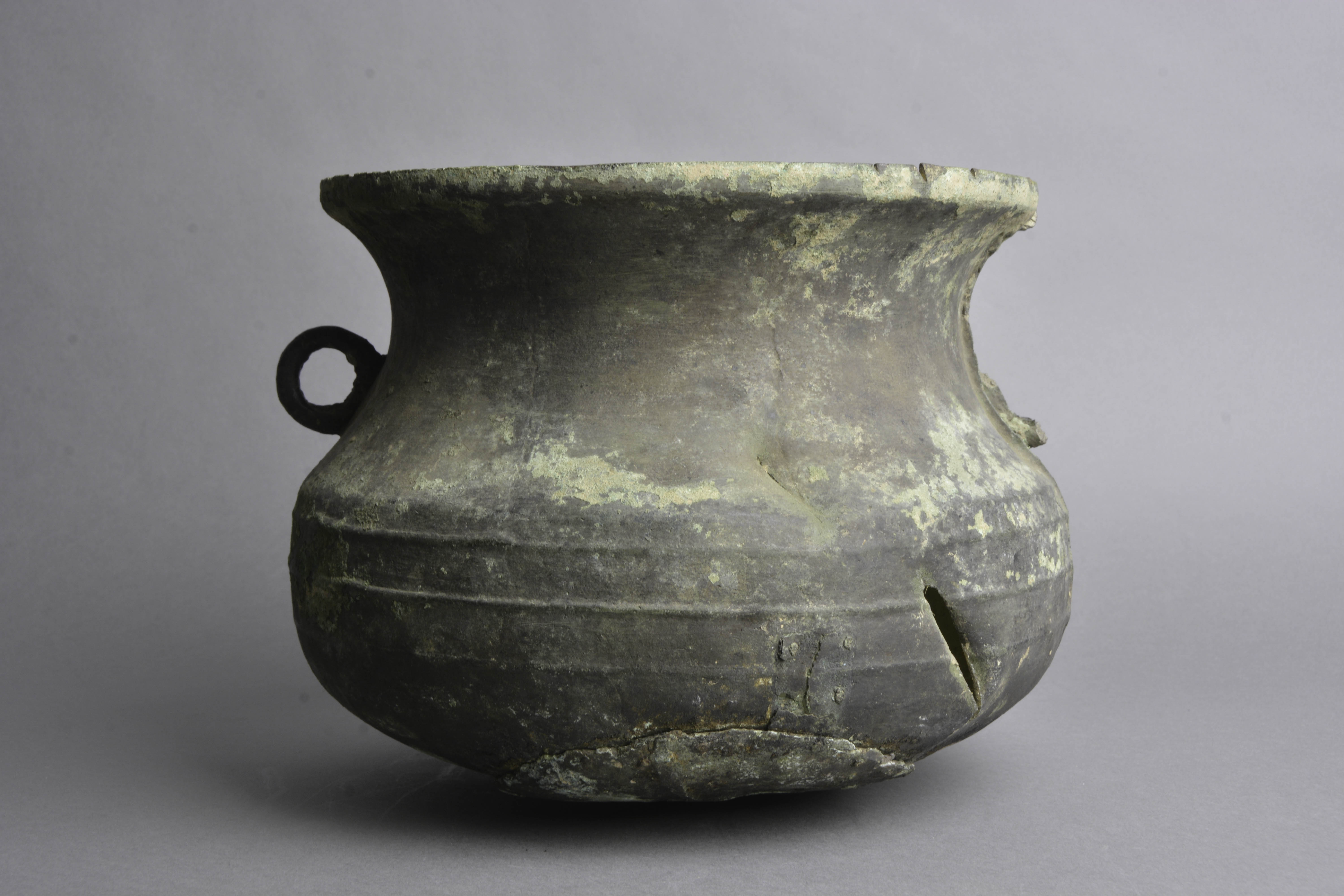 直口,束颈,圆鼓腹,圜底近平。颈部附对称环形耳,腹部饰凸弦纹三周。