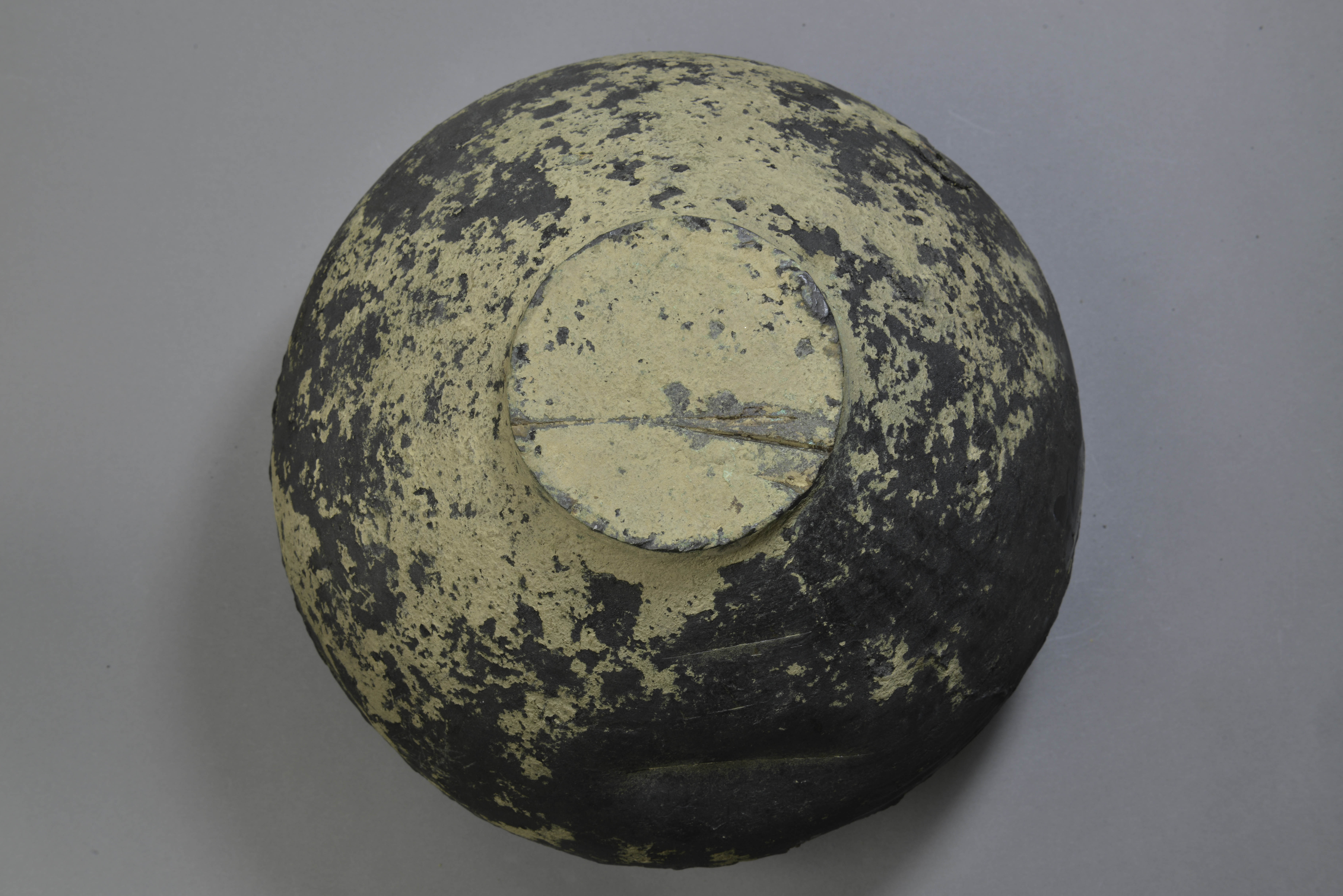 敛口,深斜弧腹,小平底,腹上一周细凸棱纹。