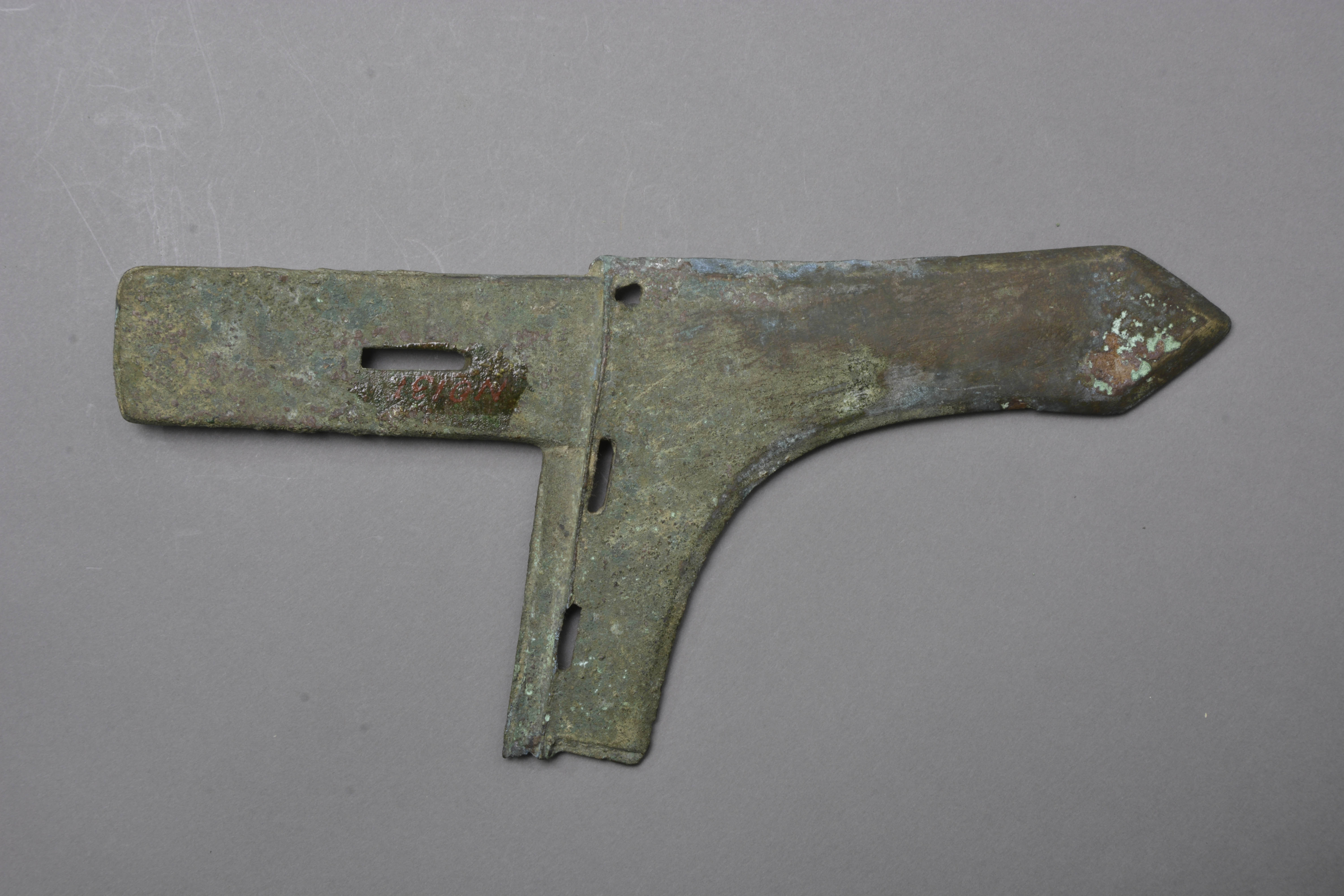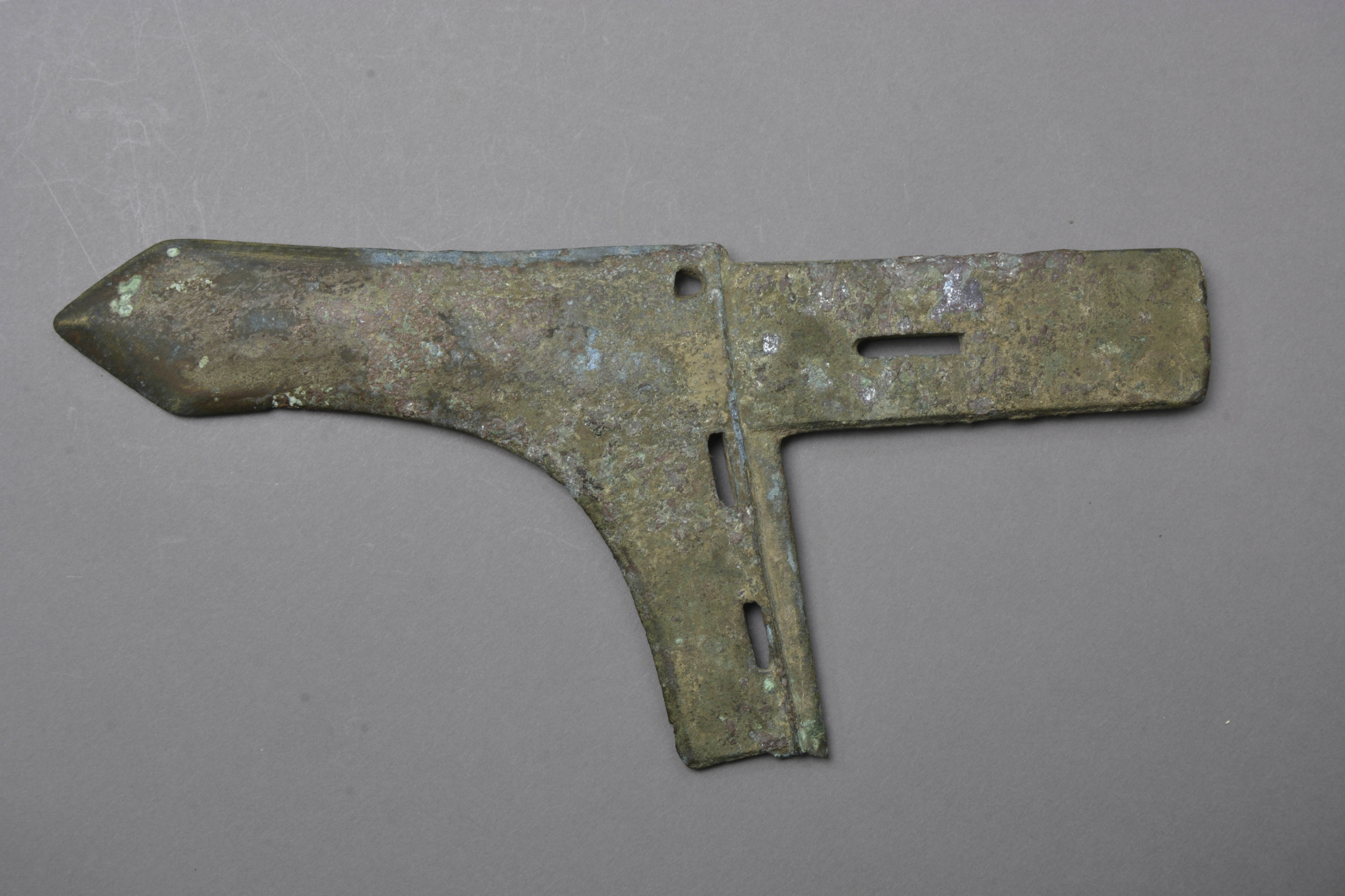 援微上扬,锋呈等腰三角形。中长胡,下阑,阑侧三穿,长方形内,内上一长方形穿。