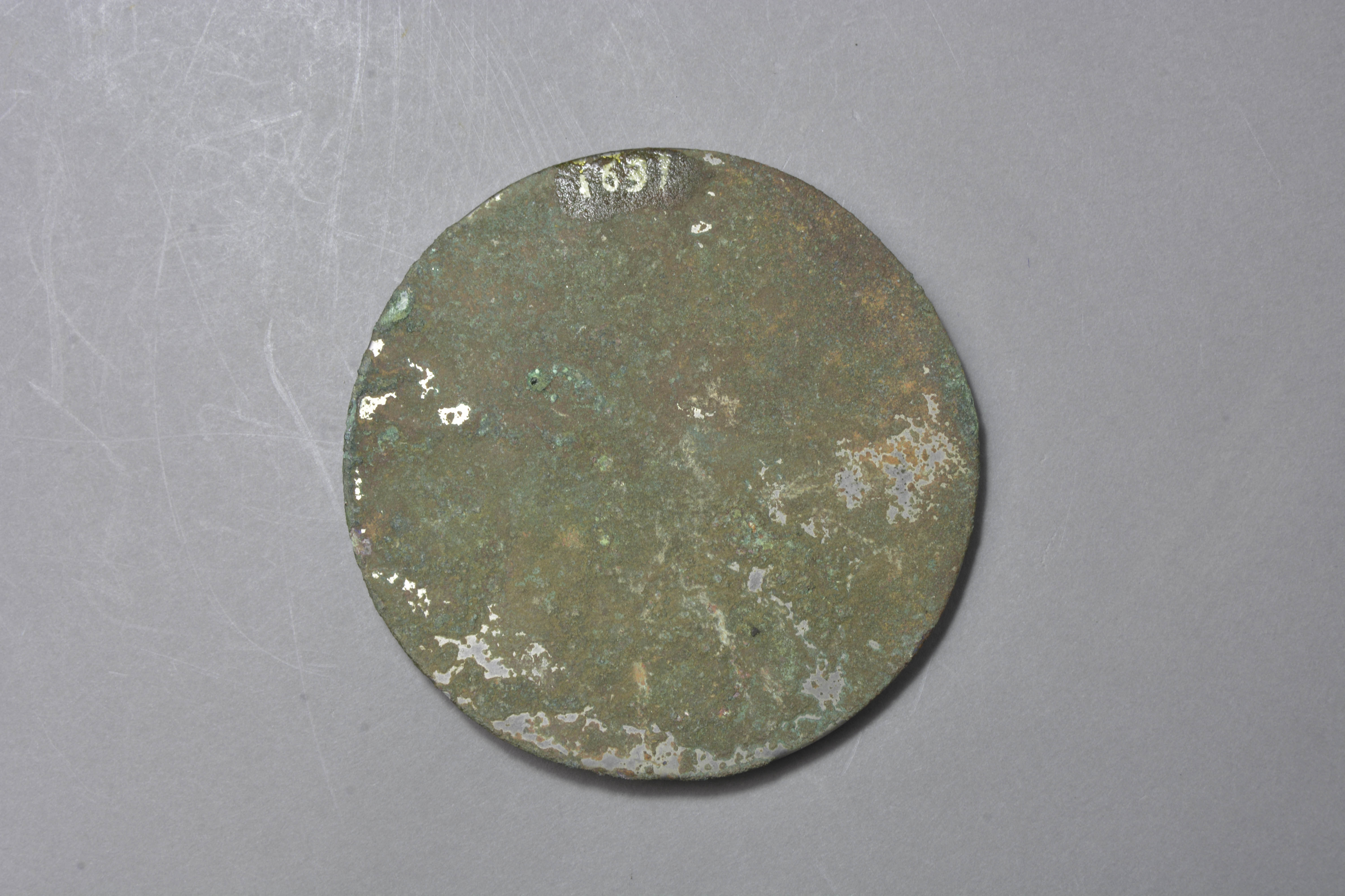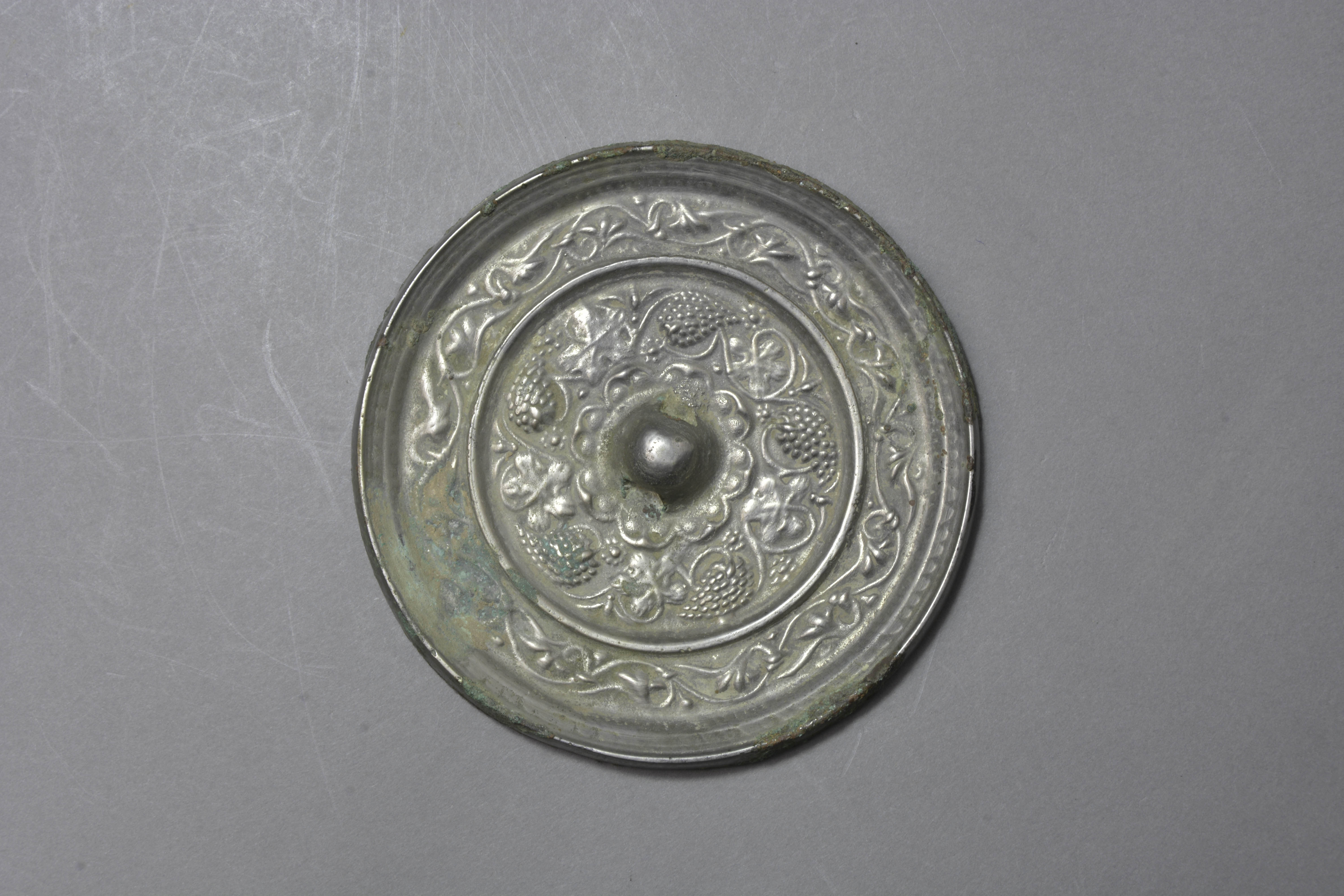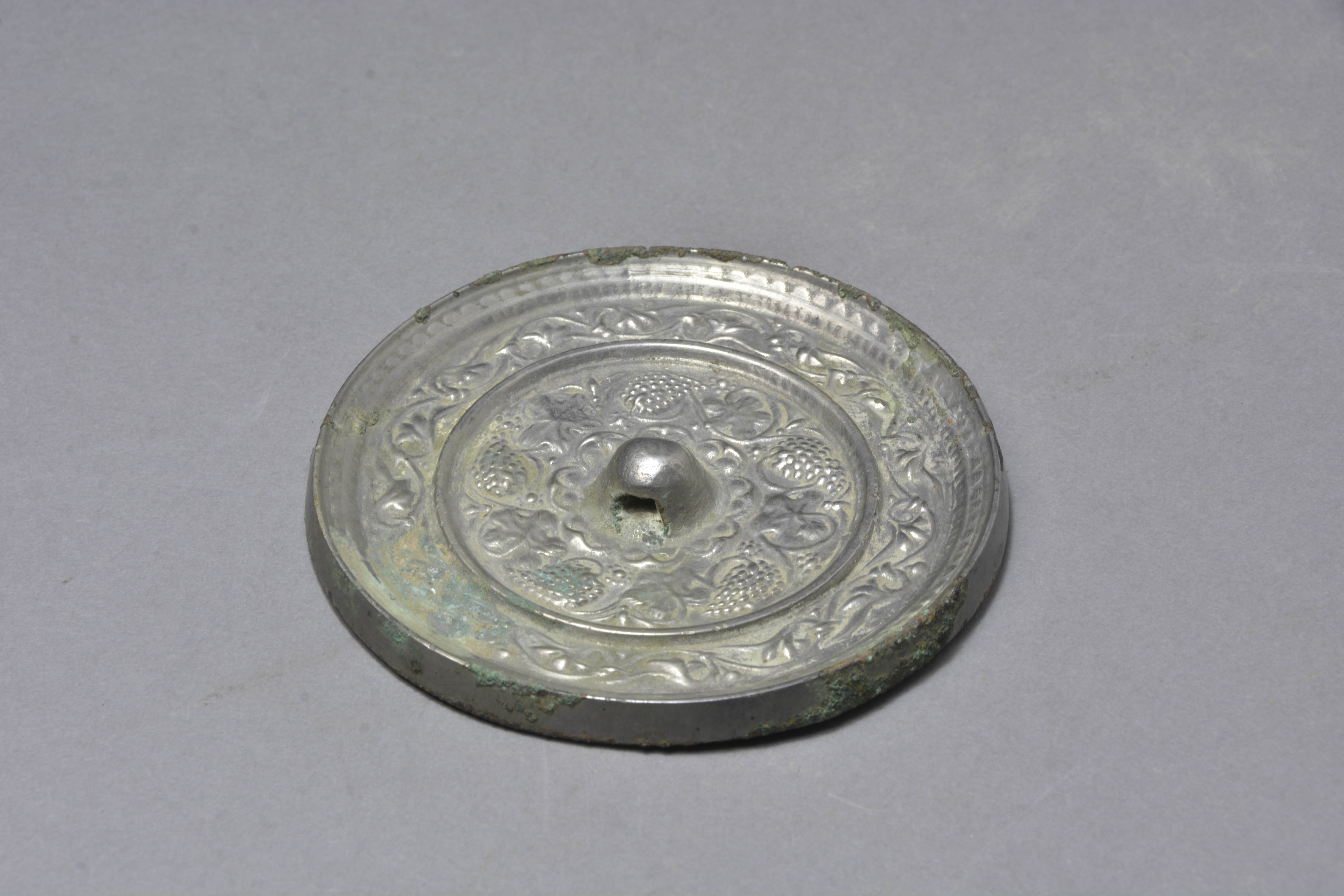 圆形,圆钮,八花瓣钮座。一周凸棱将镜背分为内外两区。内区环绕五串缠枝葡萄,外区一周卷叶纹。点线纹缘。