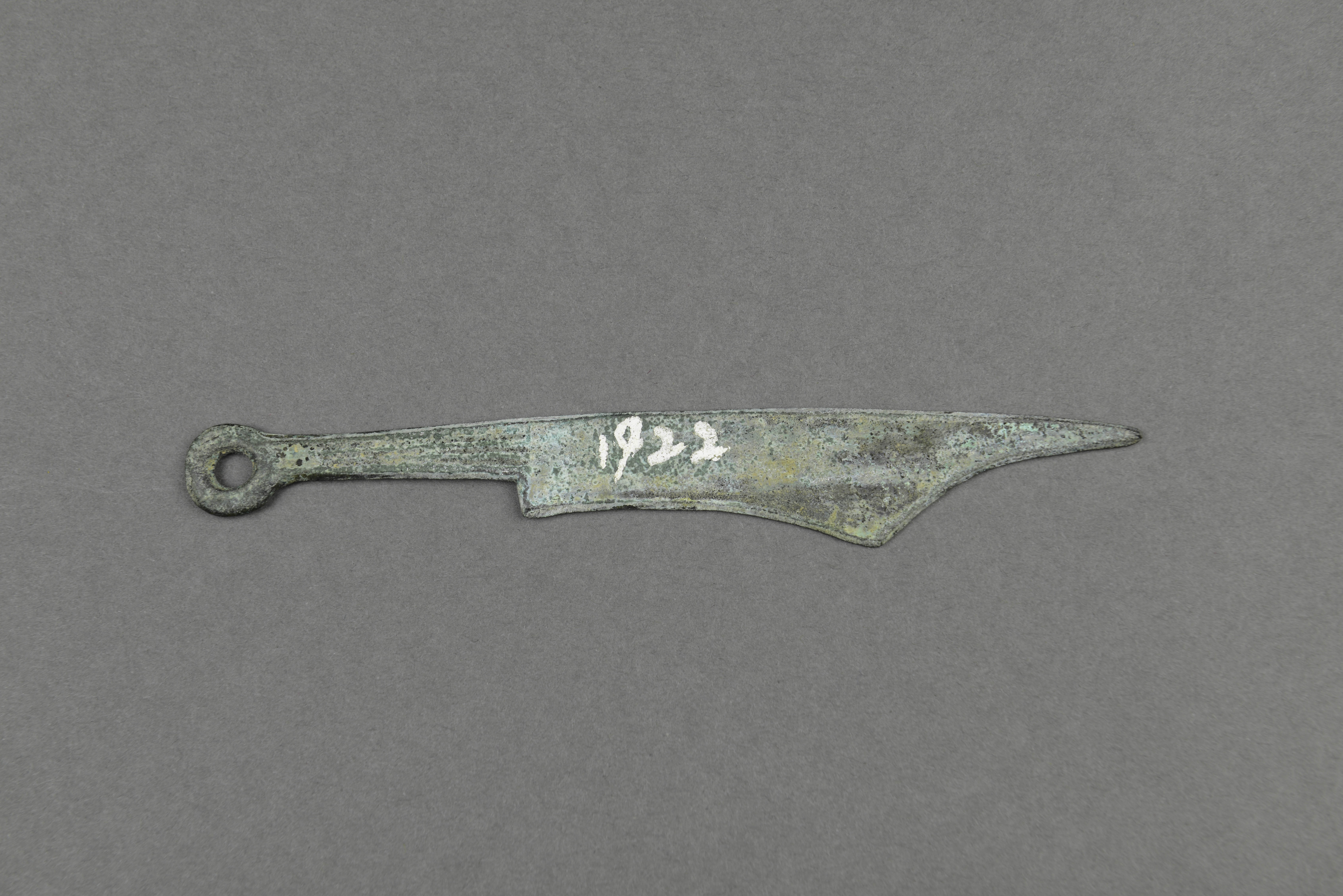 首部尖长,长柄,柄端作环状。面文为“一”字型符号。