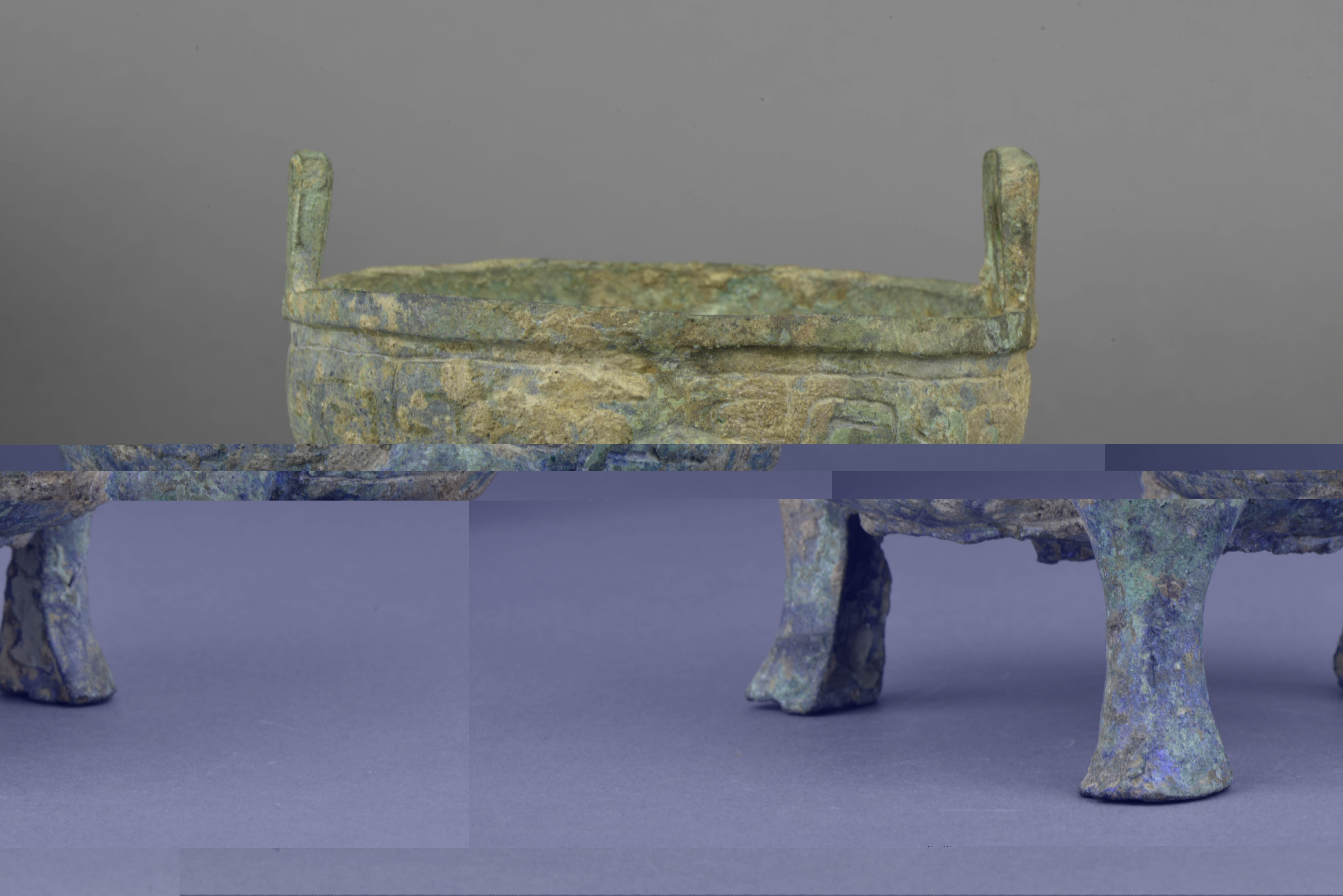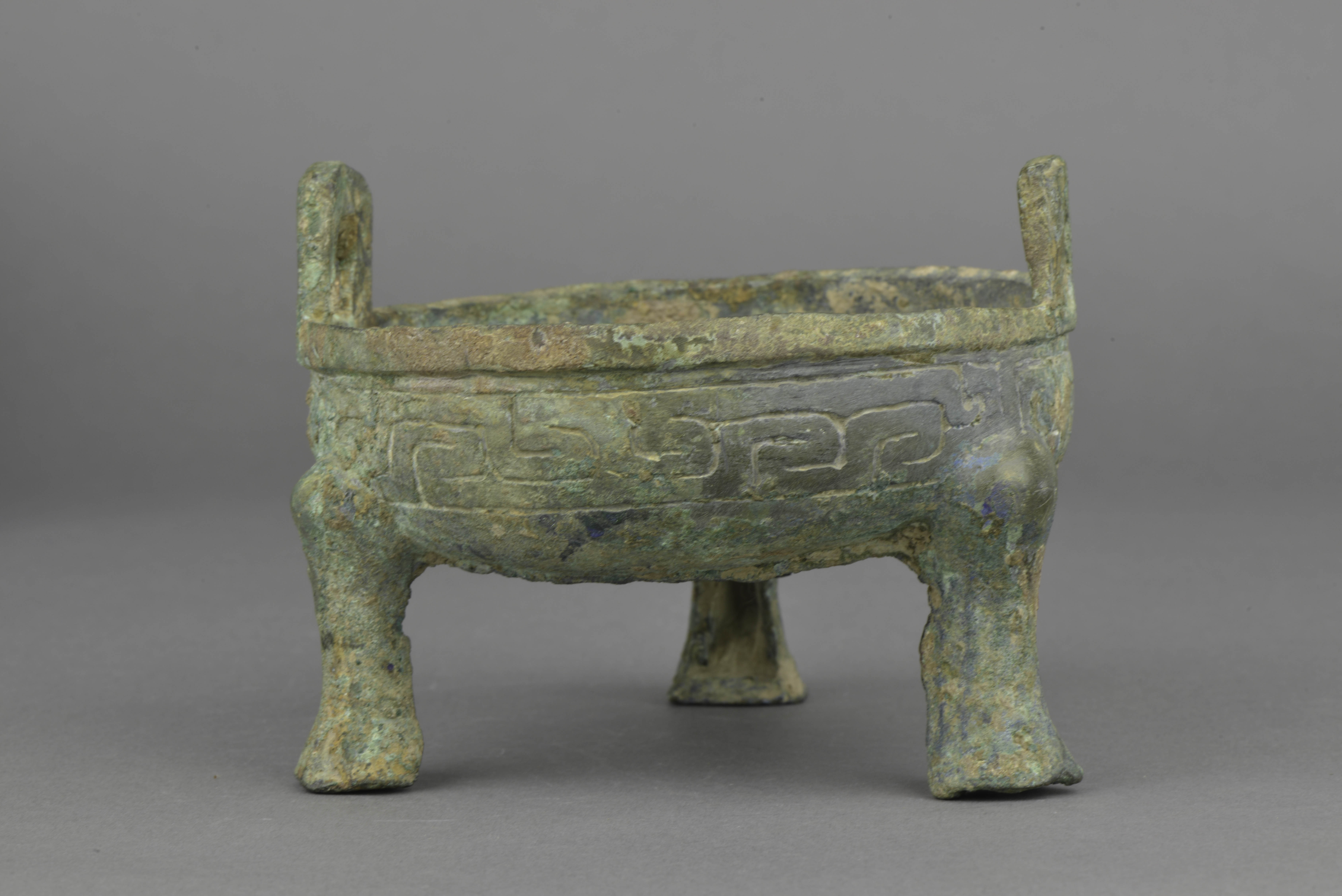 口微敛,窄平折沿,立耳,浅腹,平底,三蹄足。腹部饰变形云纹,底部有三角形范痕。