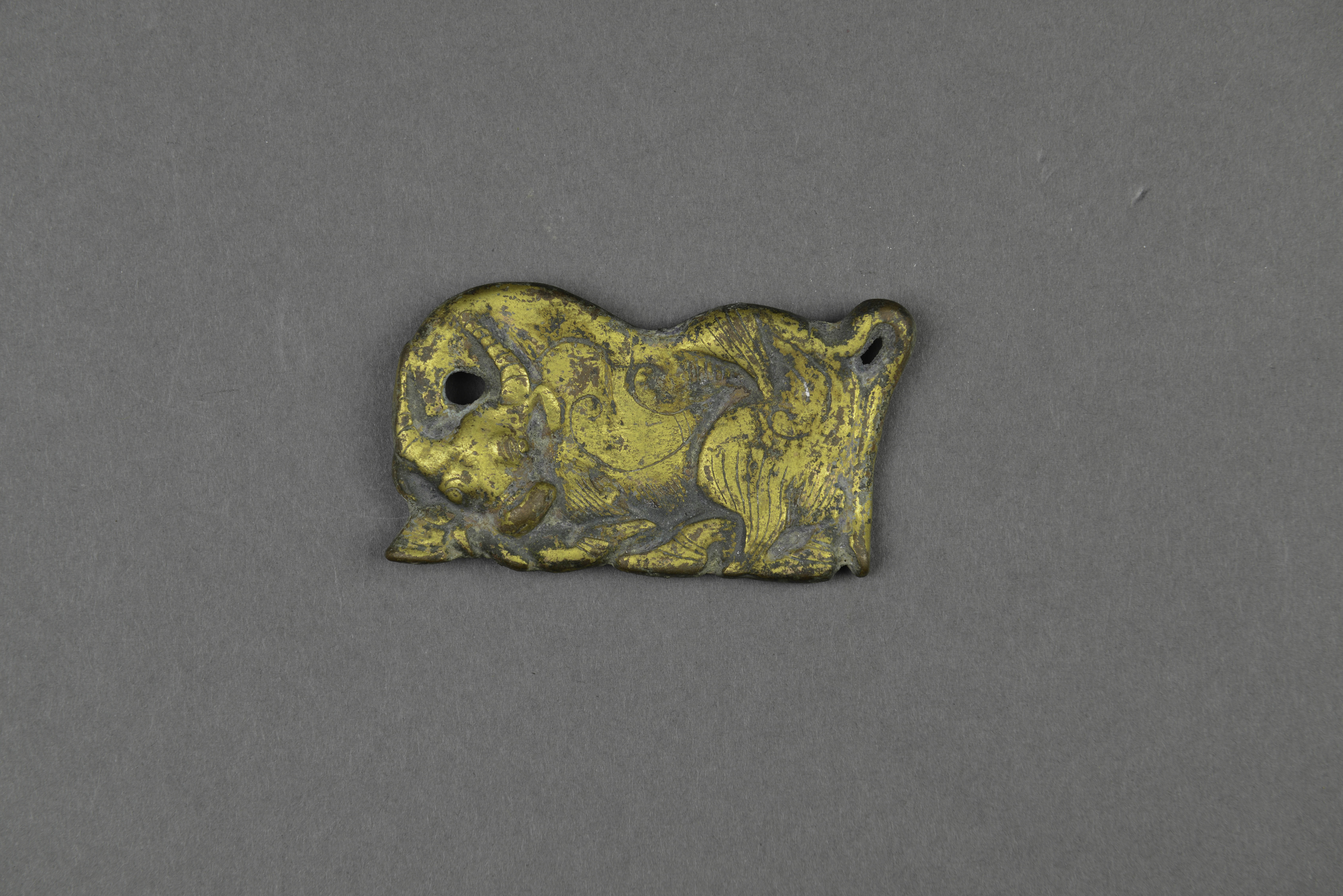 整体作卧牛状,牛四蹄盘曲,首枕于前蹄上,双角间有圆穿,尾部作条形穿,脊、腹、腿部以细线刻毛。正面鎏金,背面下凹,背面中部作两棱梁,有条形穿。牛体肥硕,睡态安祥。