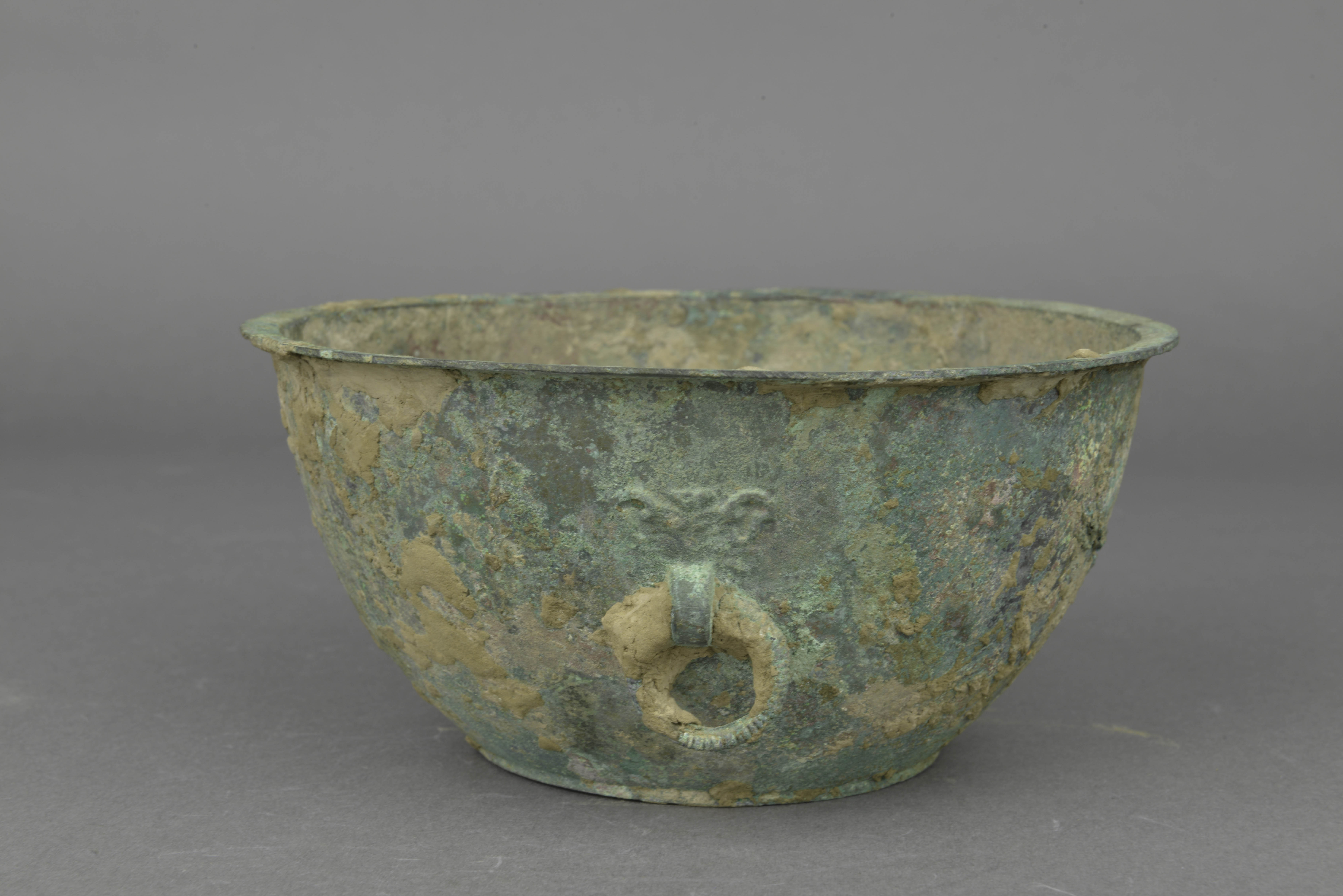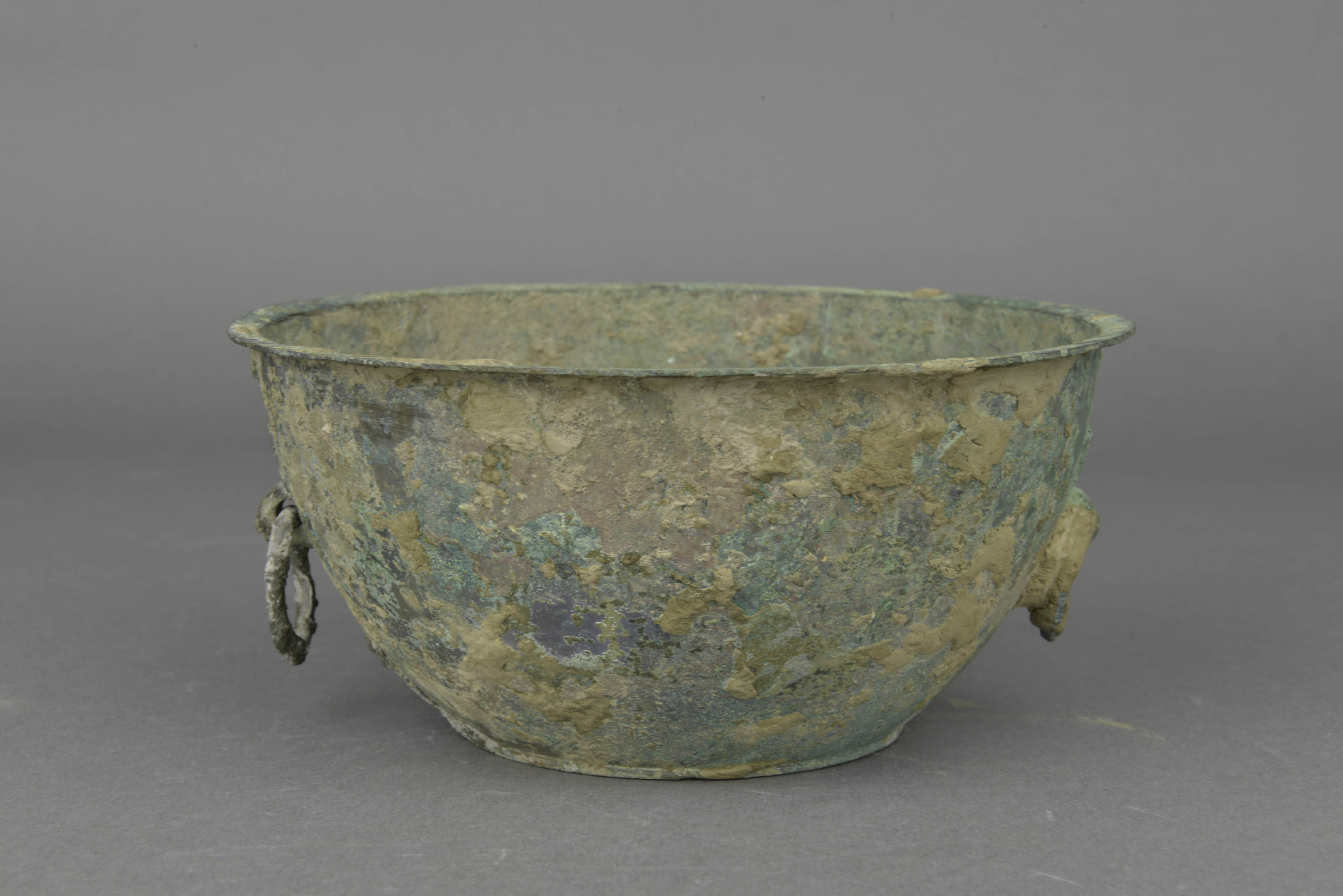 侈口,窄平折沿,弧腹内收,平底。腹部有对称的铺首衔环,底部边沿有一周凸棱。