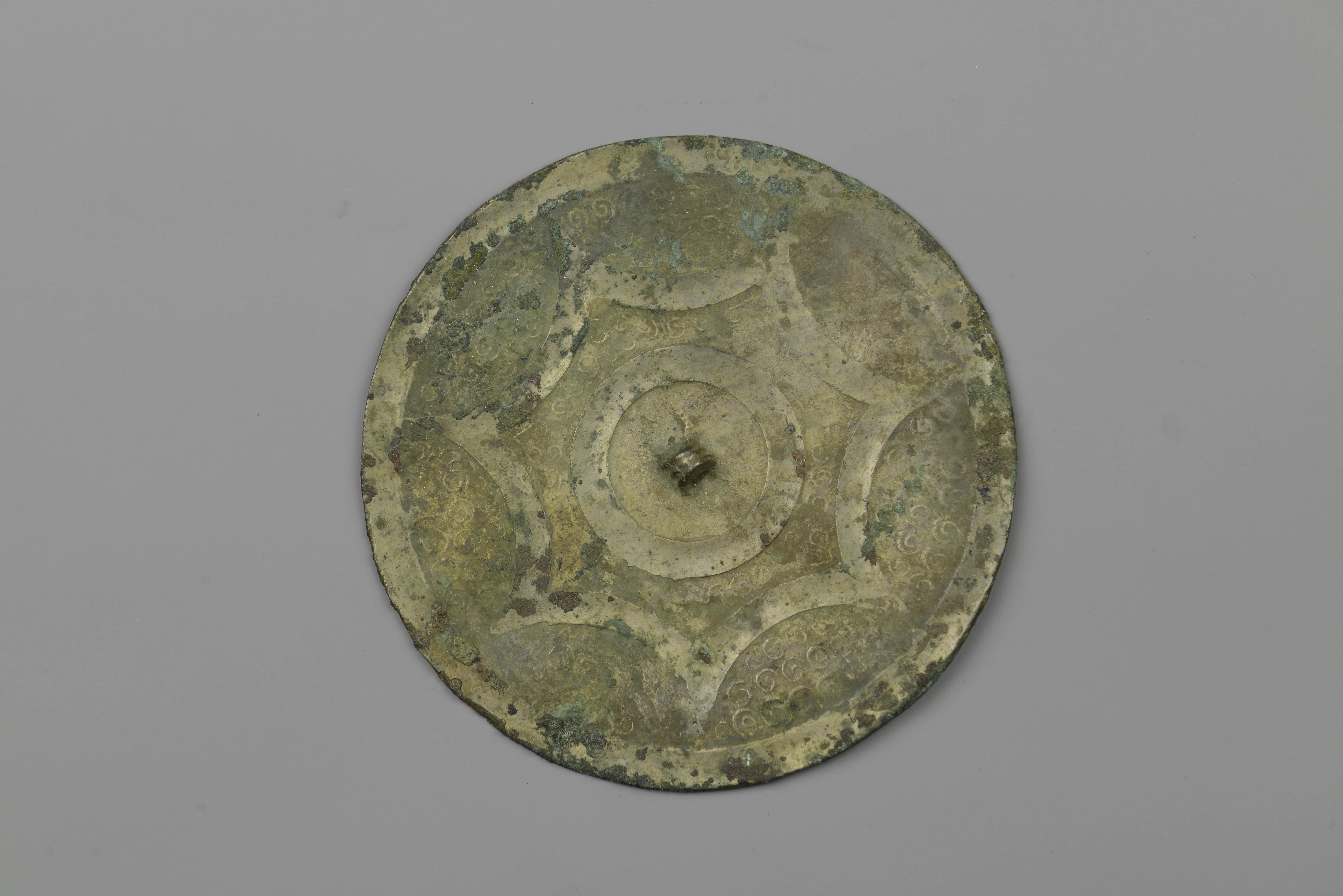 圆形,三弦钮,圆钮座。外圈一周凹面形环带。其外凹面宽条带连成的八内向连弧圈,连弧的外角直抵镜缘。素圈边。