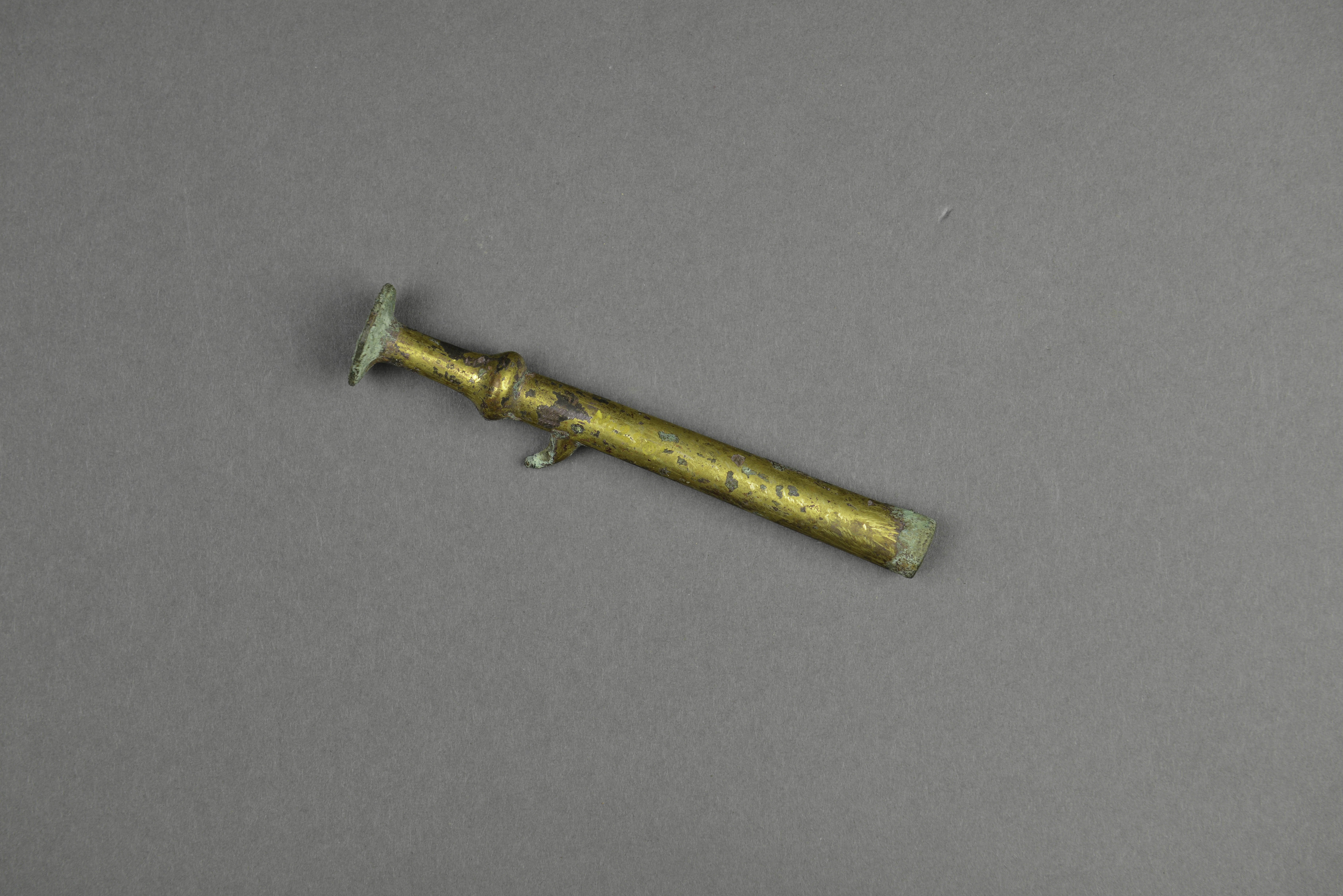 盖顶部较平,尾端呈管形。有銎,銎内有朽木痕。管侧伸出一倒勾,器身较长,鎏金。