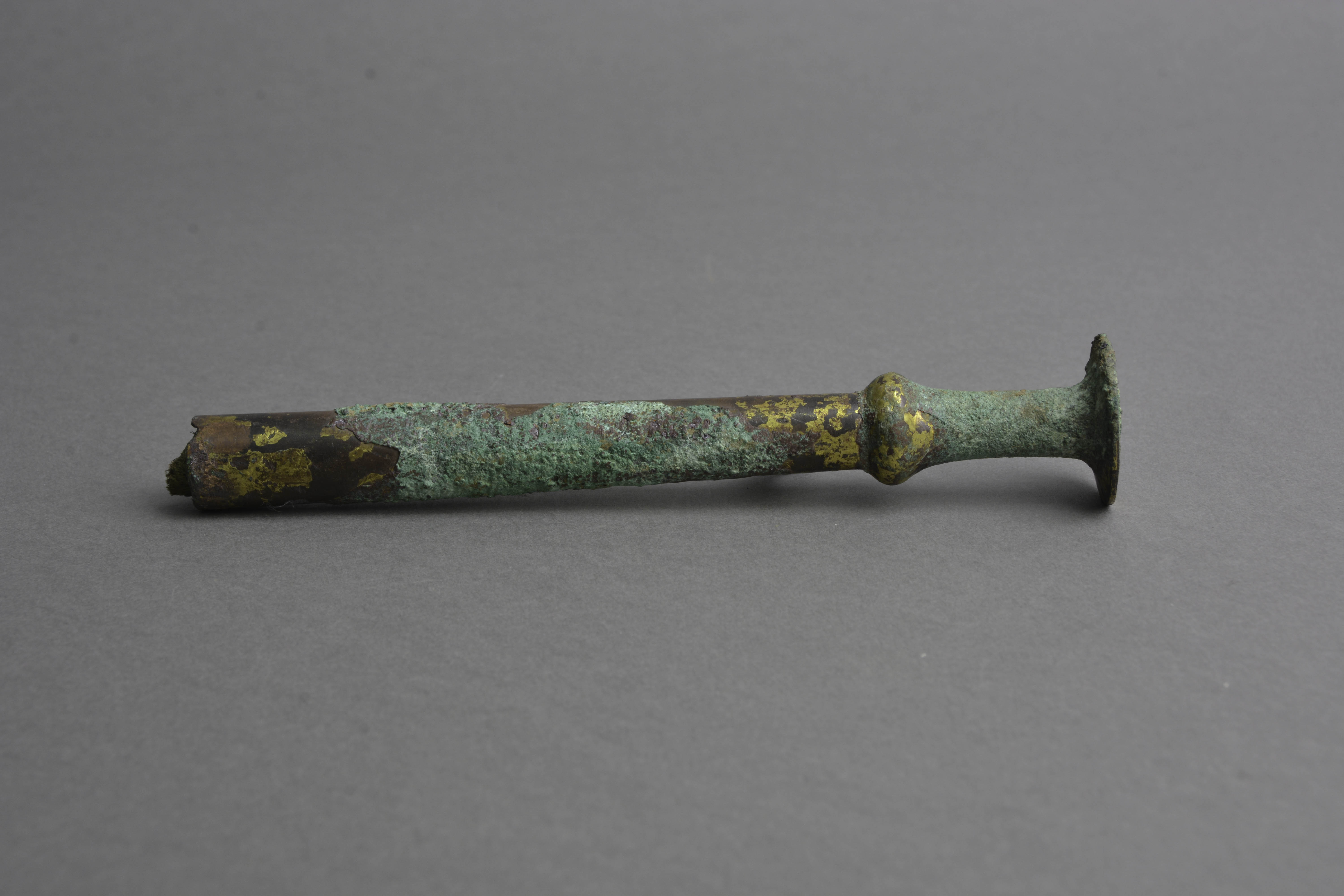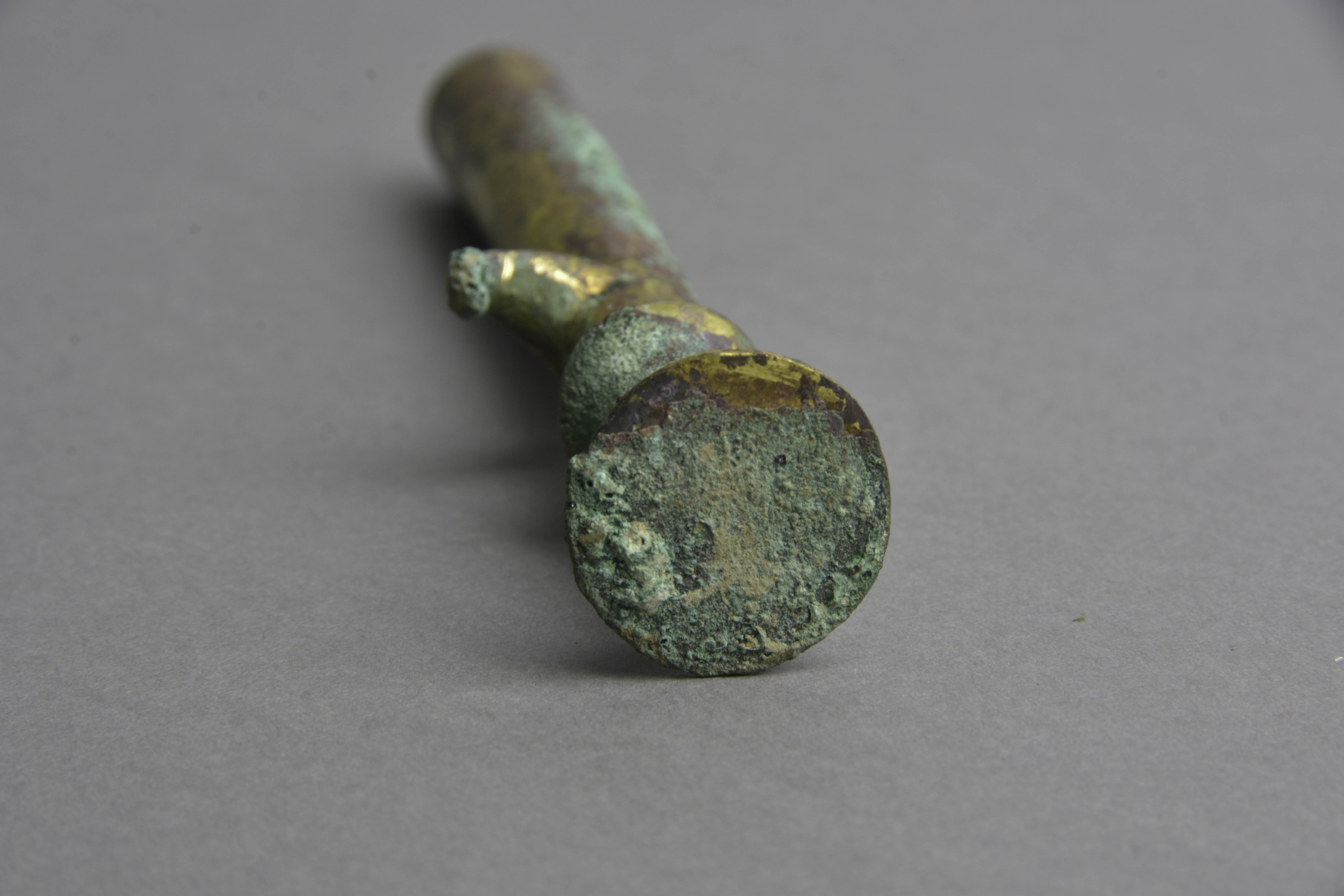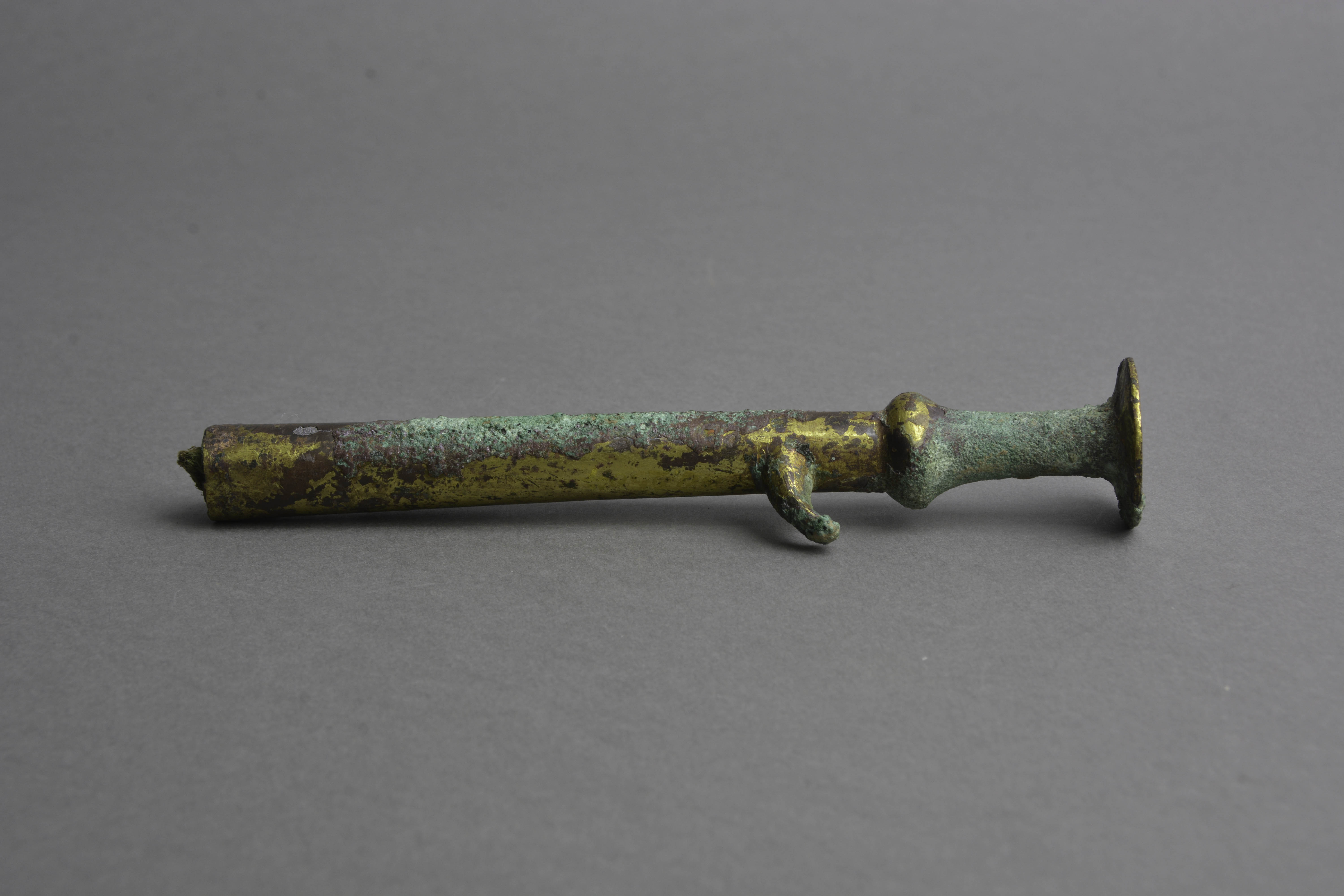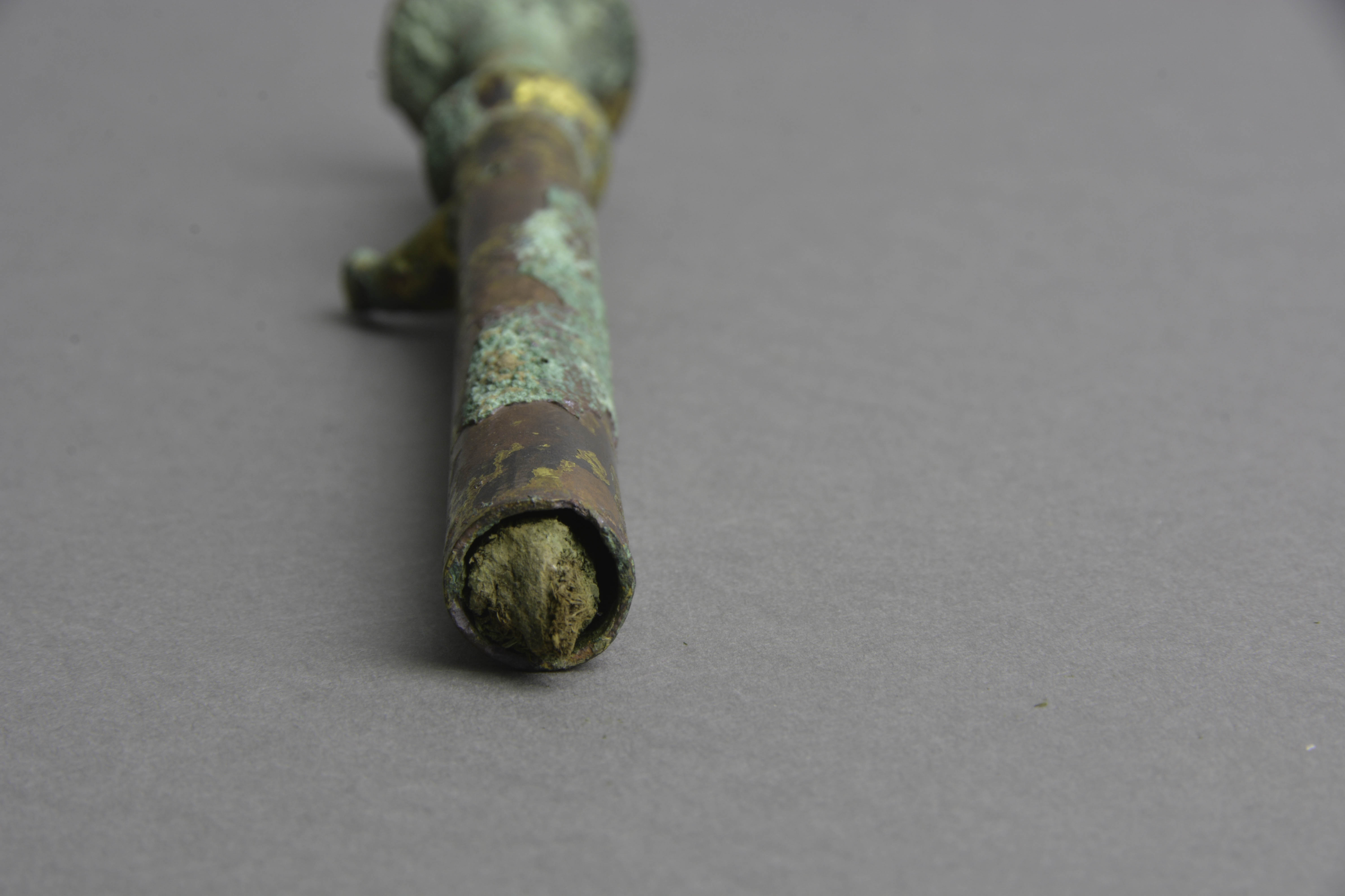盖顶部较平,尾端呈管形。有銎,銎内有朽木痕。管侧伸出一倒勾,器身较长,鎏金。