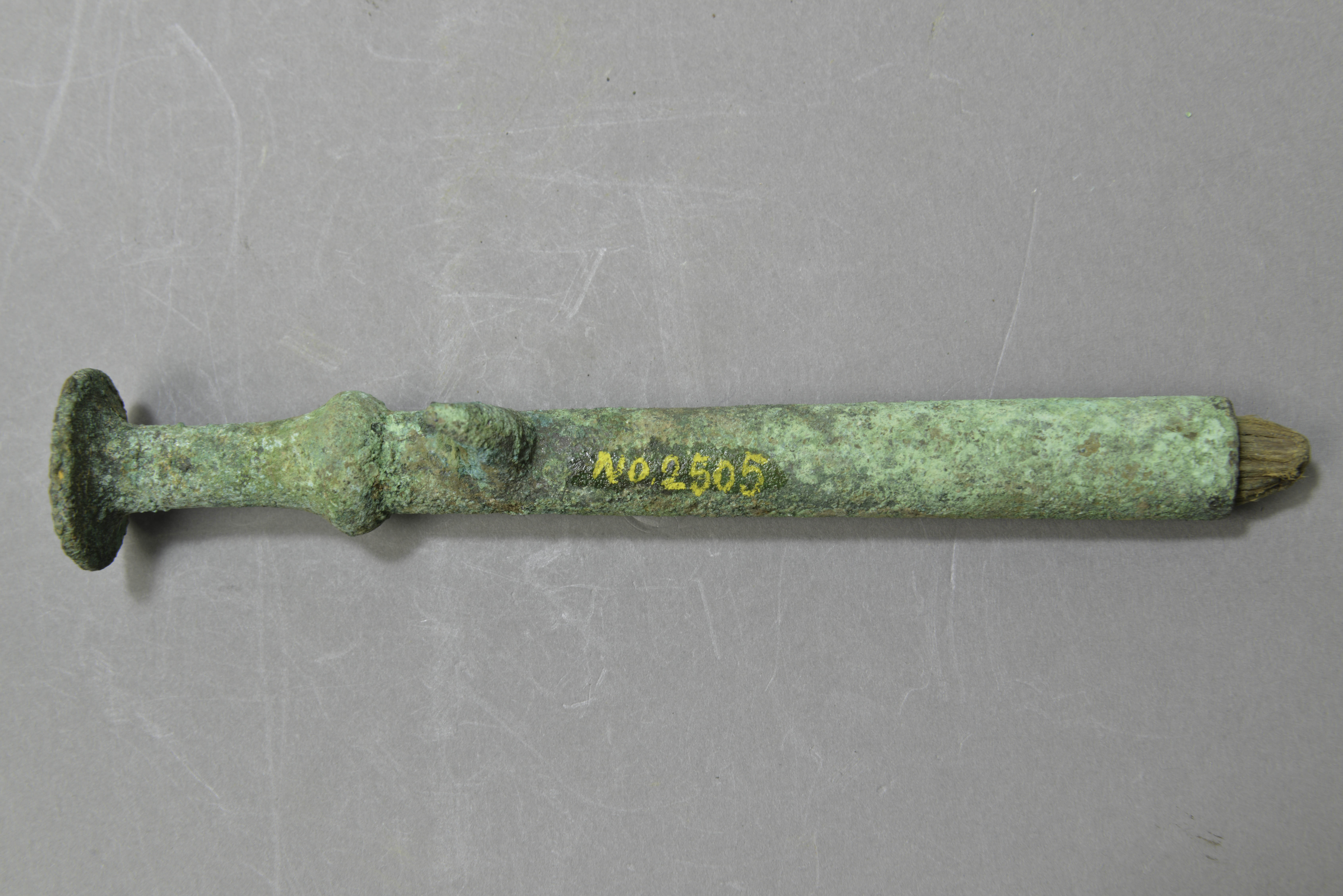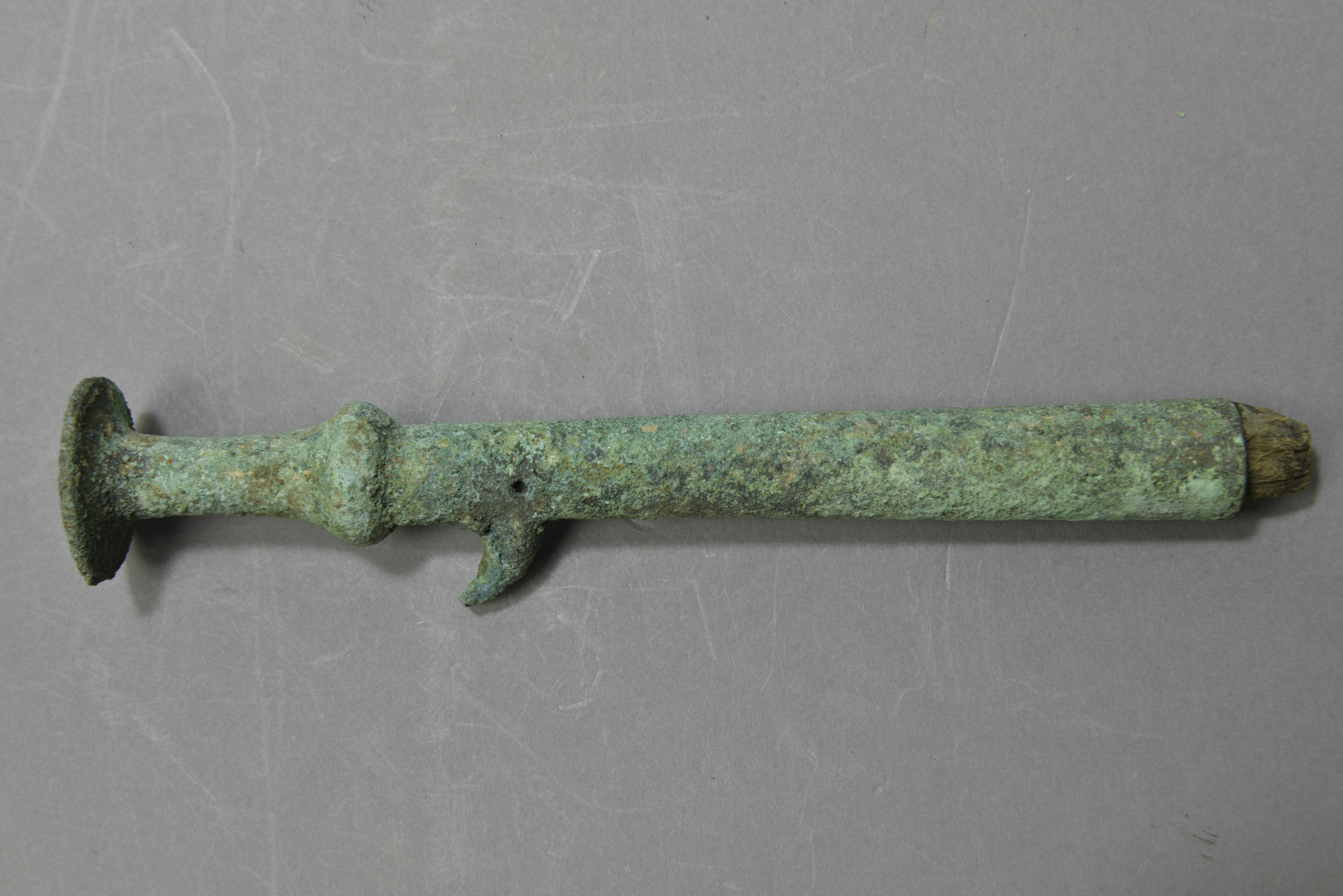 盖顶部较平,尾端呈管形。有銎,銎内有朽木痕。管侧伸出一倒勾,器身较长,鎏金。