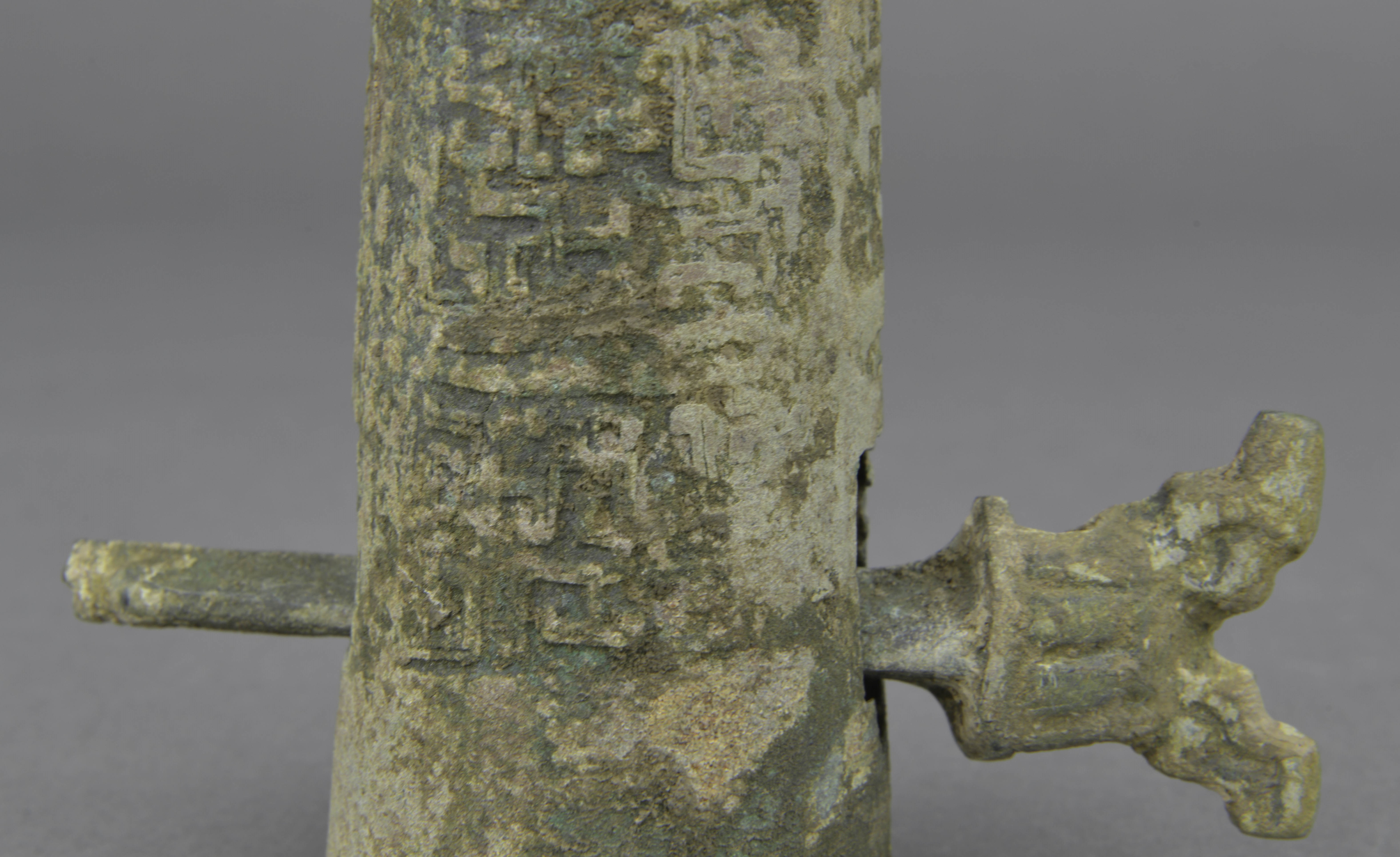 圆筒状,内端略粗,外端封顶,长方形辖孔。中部饰凸弦纹两周,内外端各饰窃曲纹。顶部饰凸弦纹。辖为兽面形辖首,兽耳下有圆穿,长方形辖身。