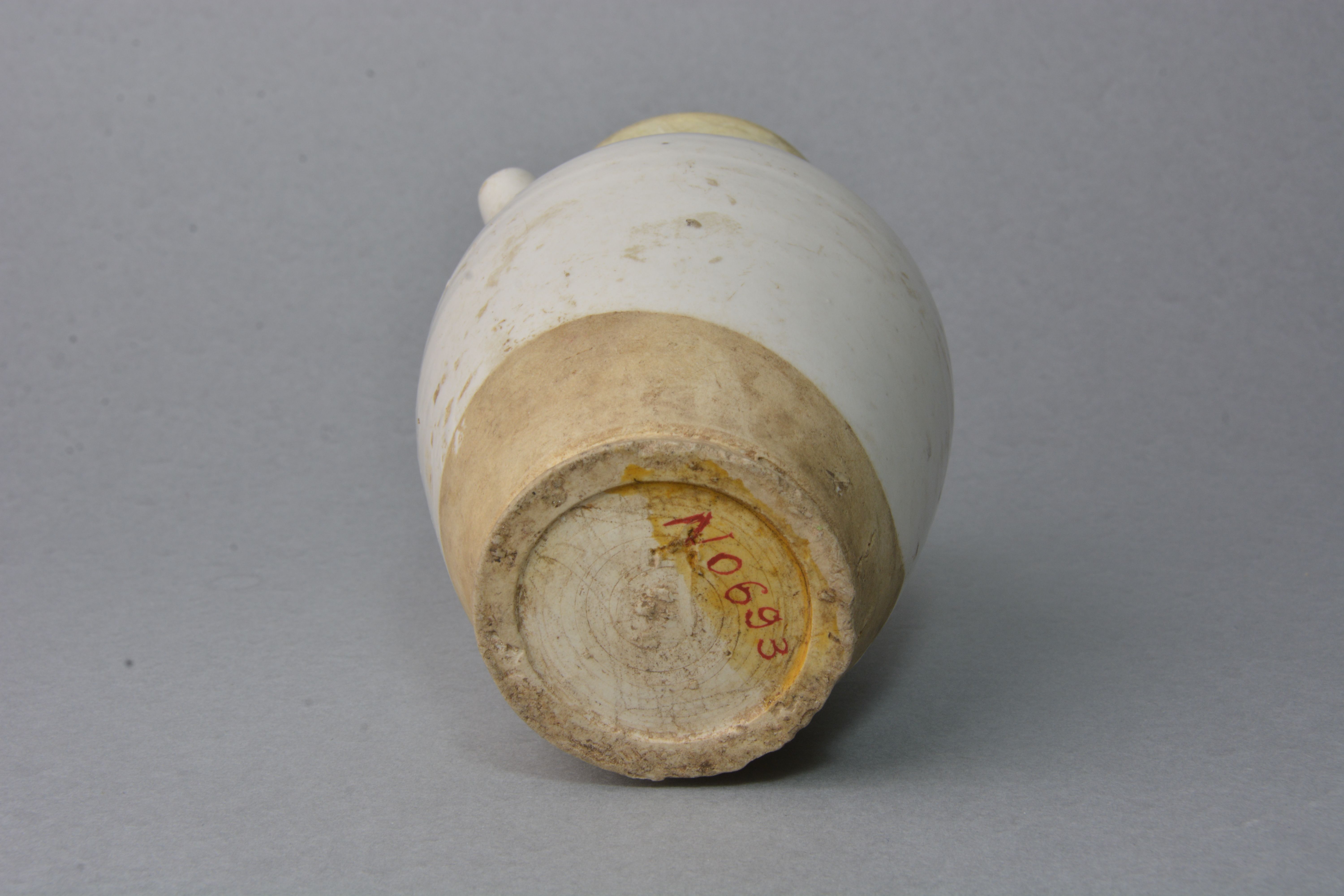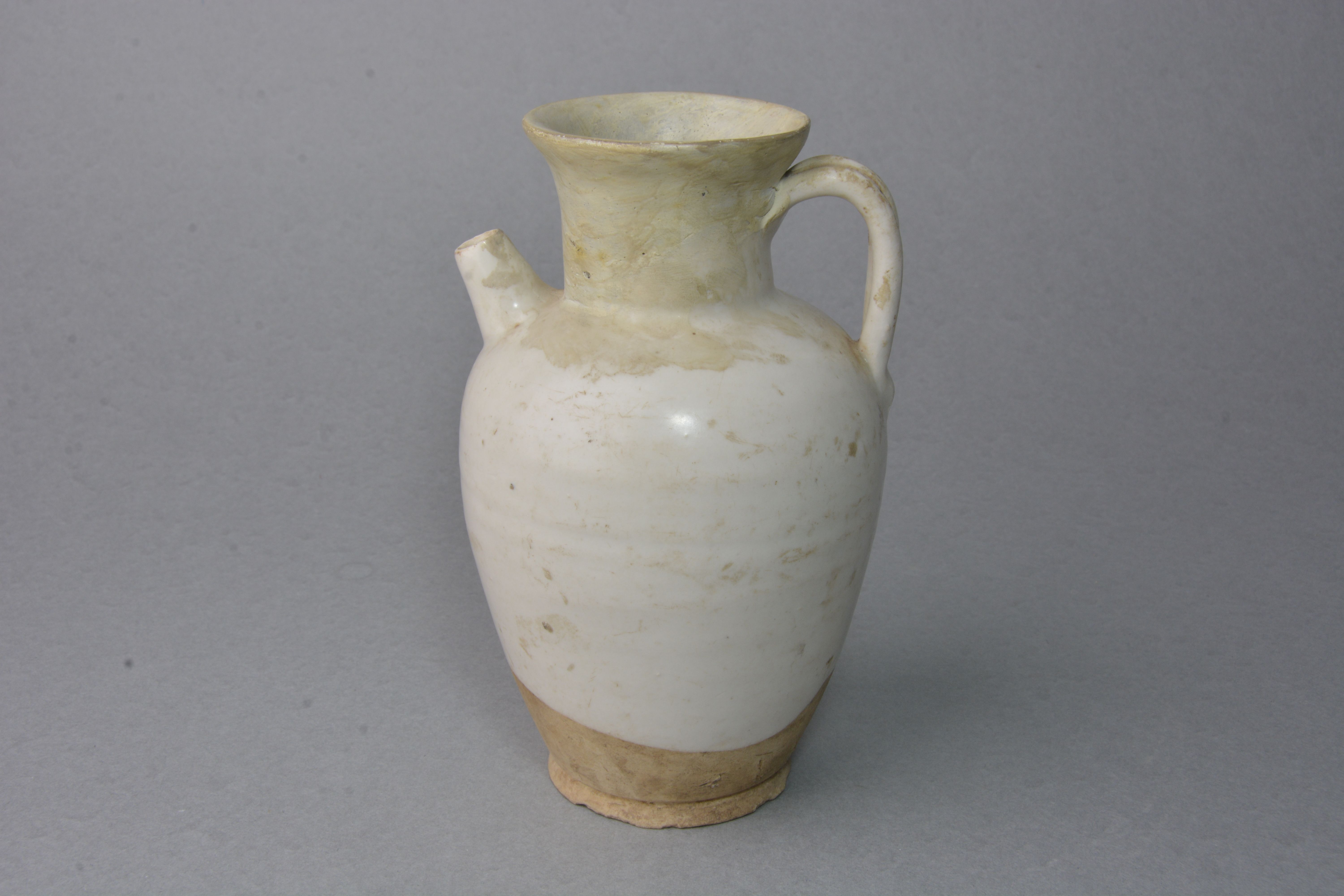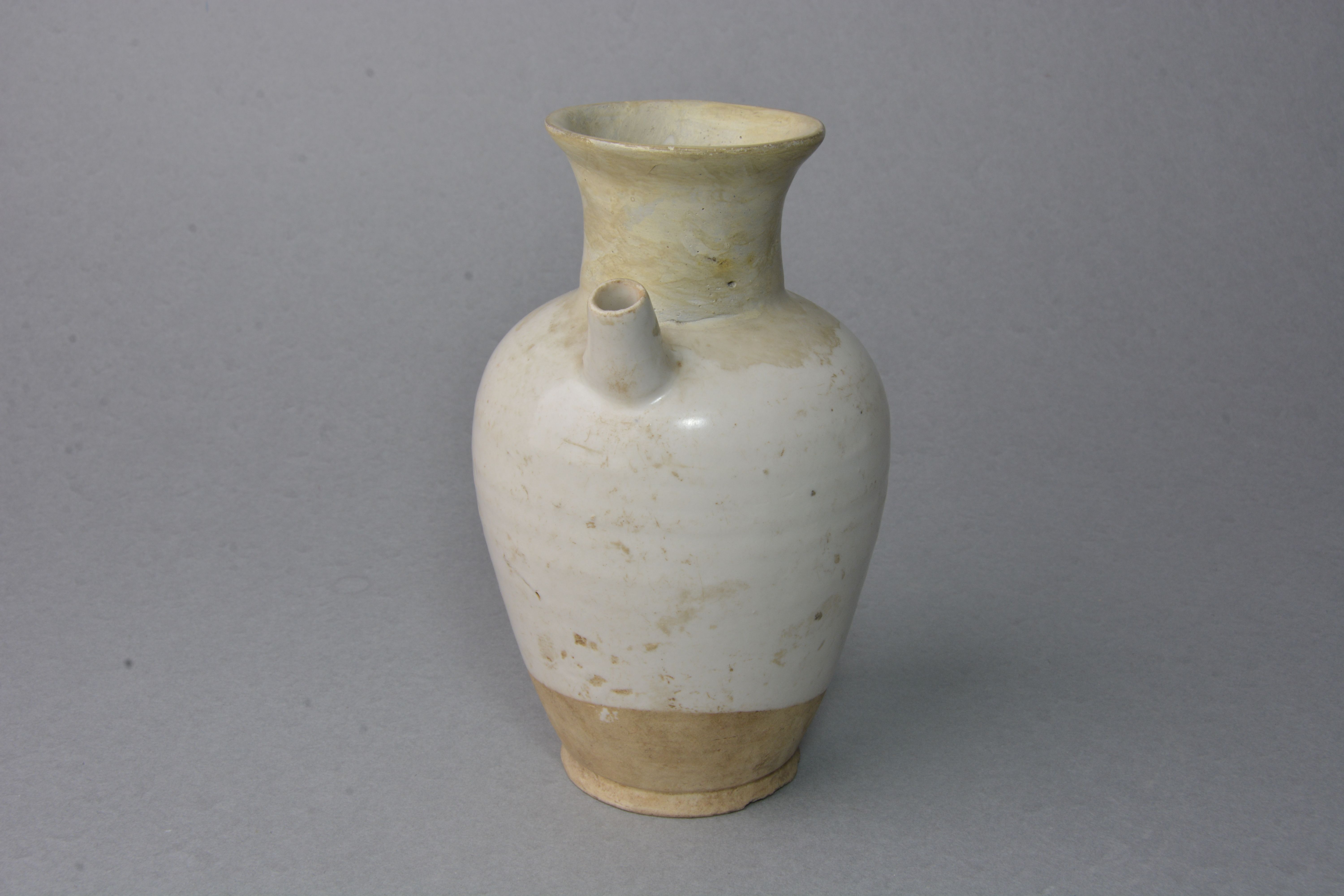 侈口,束颈,丰肩,肩部出管状短流,颈肩部作曲柄,环形底。施牙白色釉,下腹近足处及足圈刮釉。