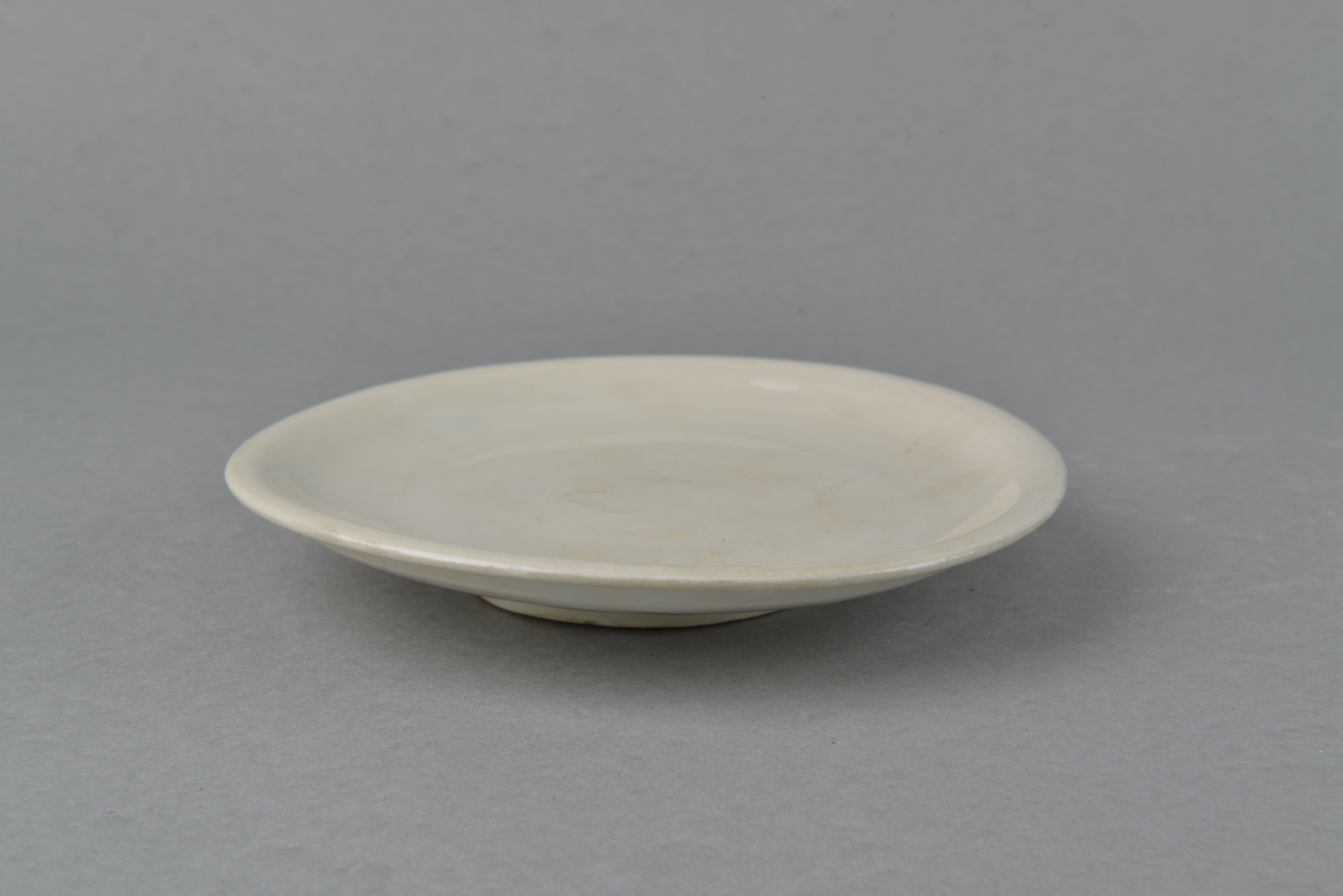 侈口,平沿,浅折腹,矮圈足,通体施白釉,光洁润泽,足圈刮釉。