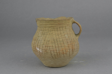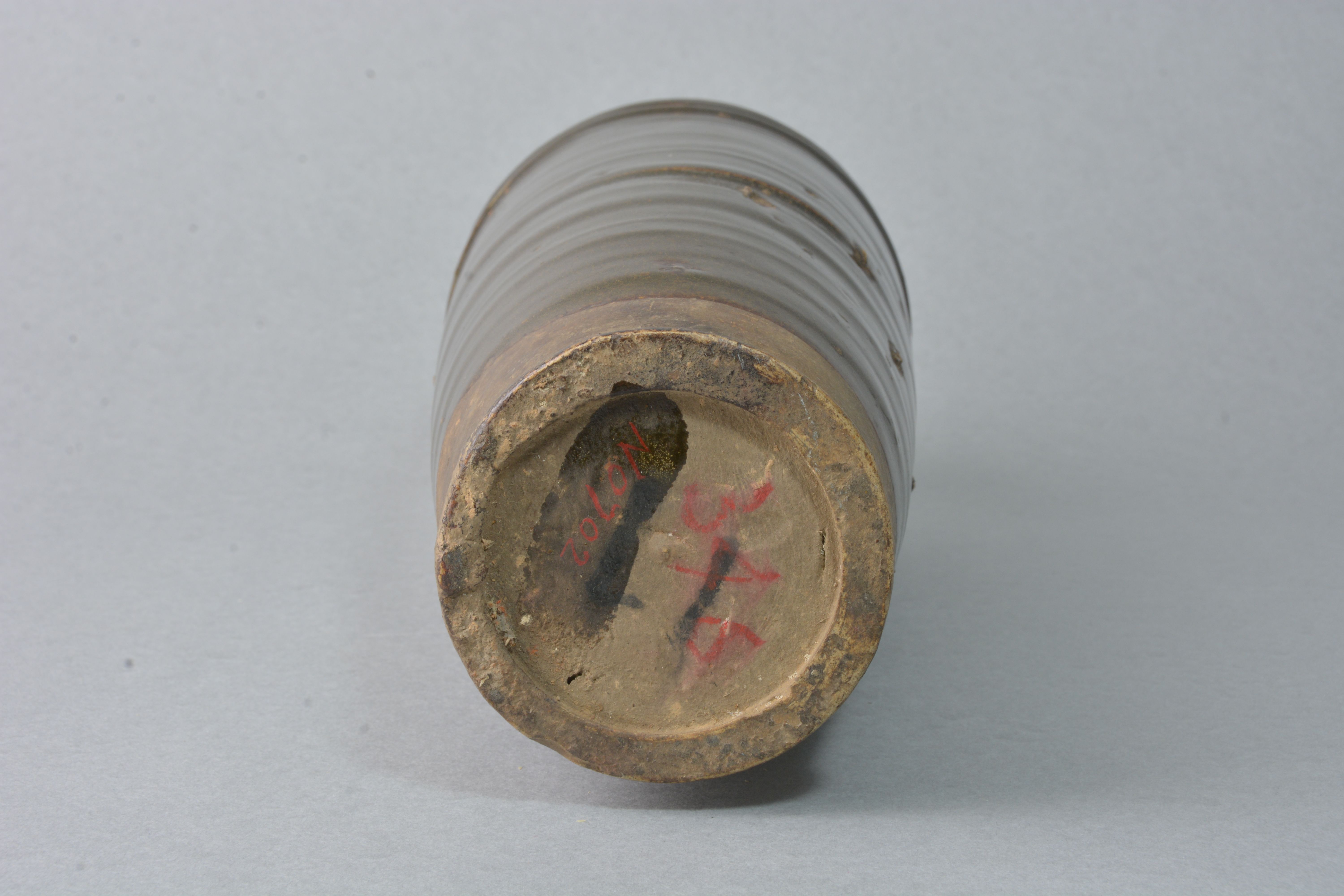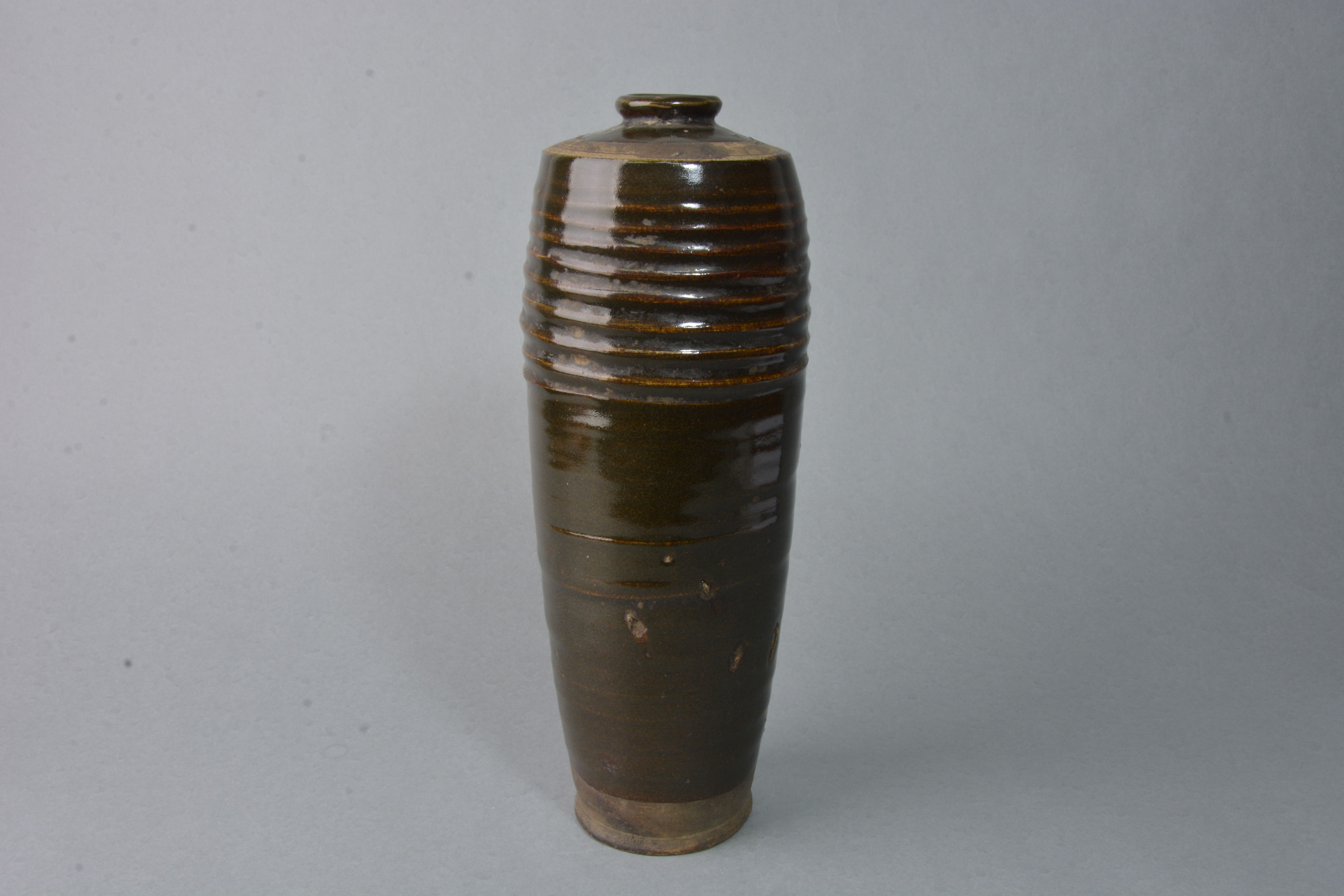 小唇口,折肩,腹部修长形似鸡腿,矮圈足,腹部饰瓦纹。施黑褐色酱釉,肩部刮釉一圈,腹部近足处及足部露胎。