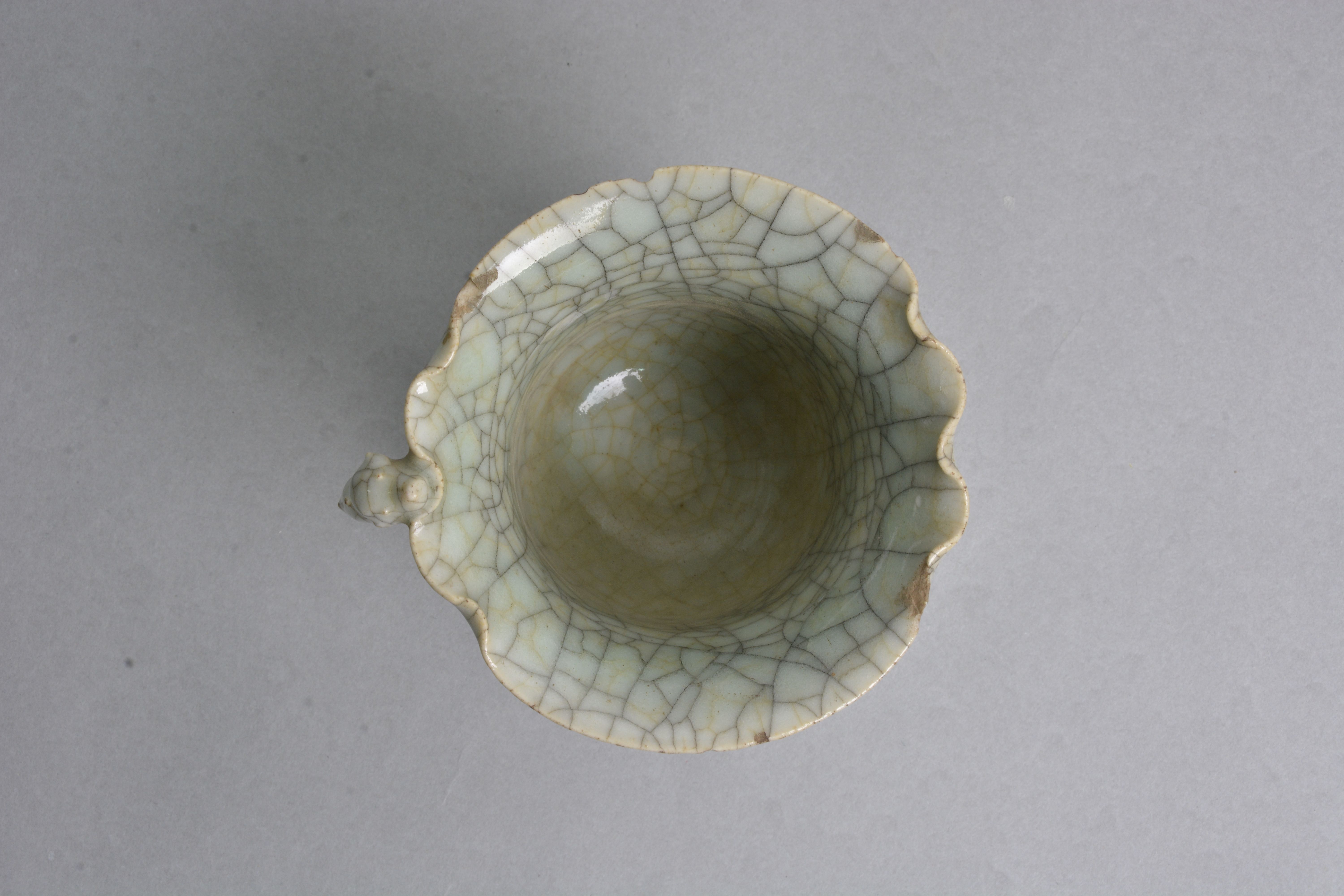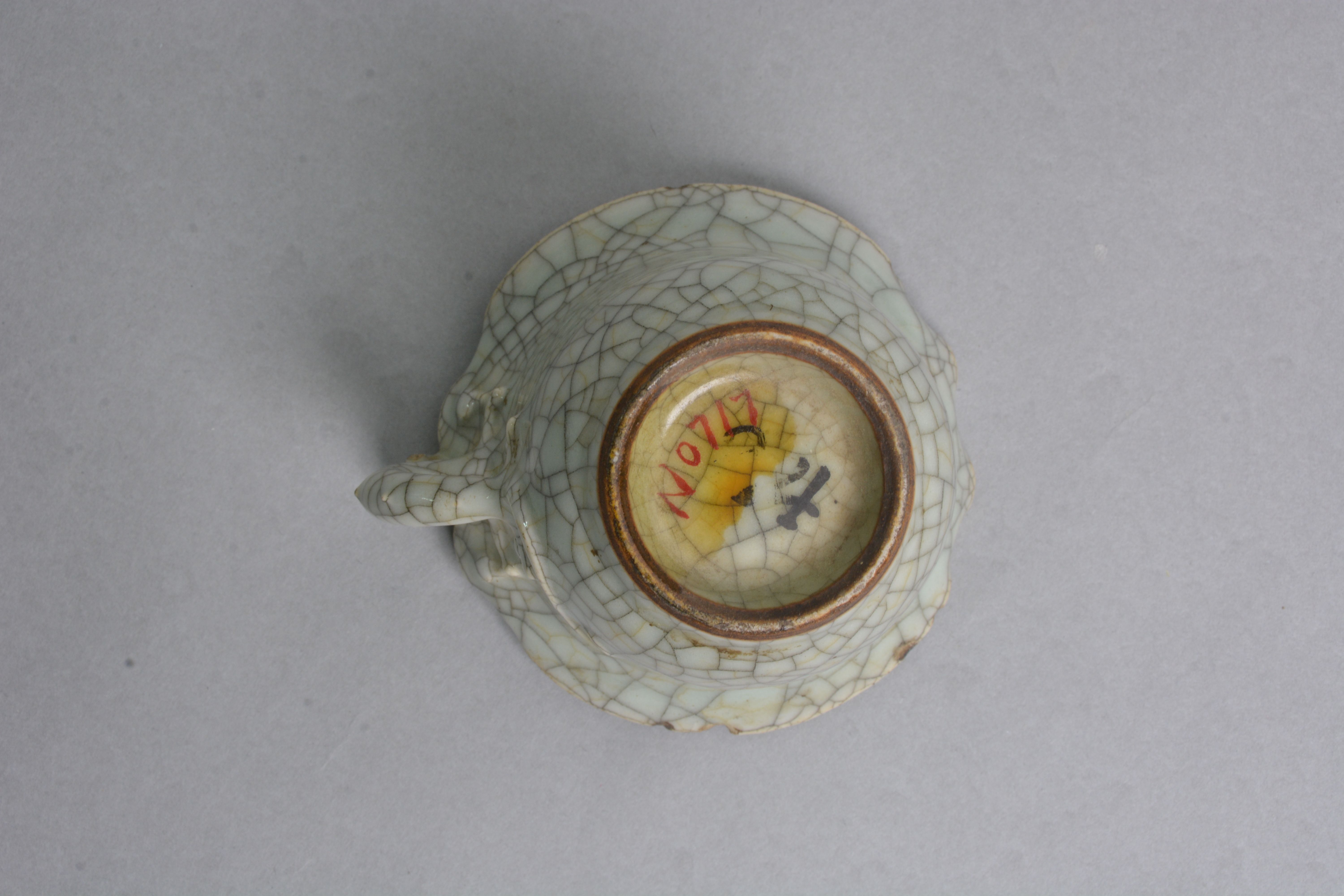 侈口,口沿左右两侧作“S”形花边,深腹,圈足,龙形执。通体施纹片青釉,足圈刮釉。