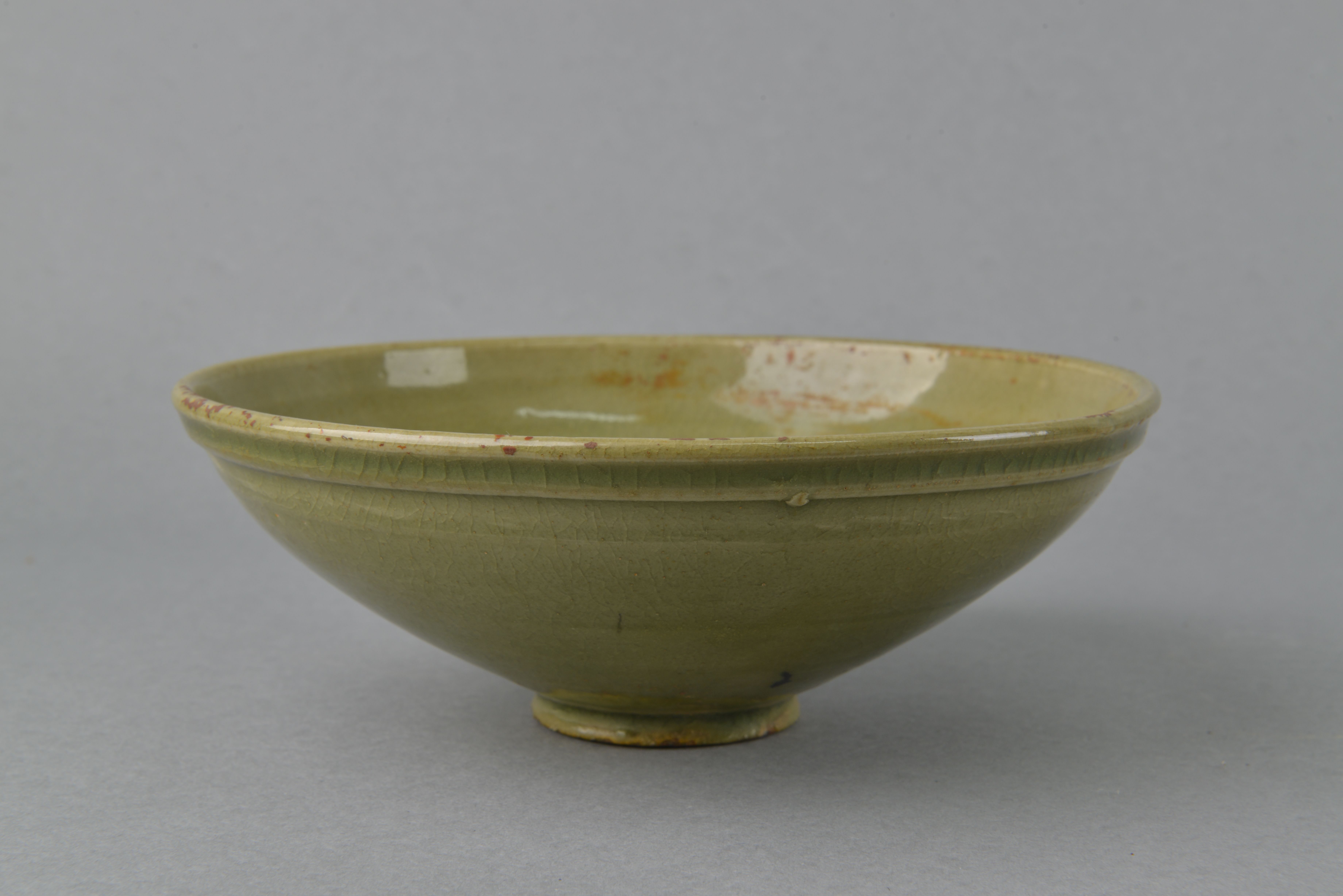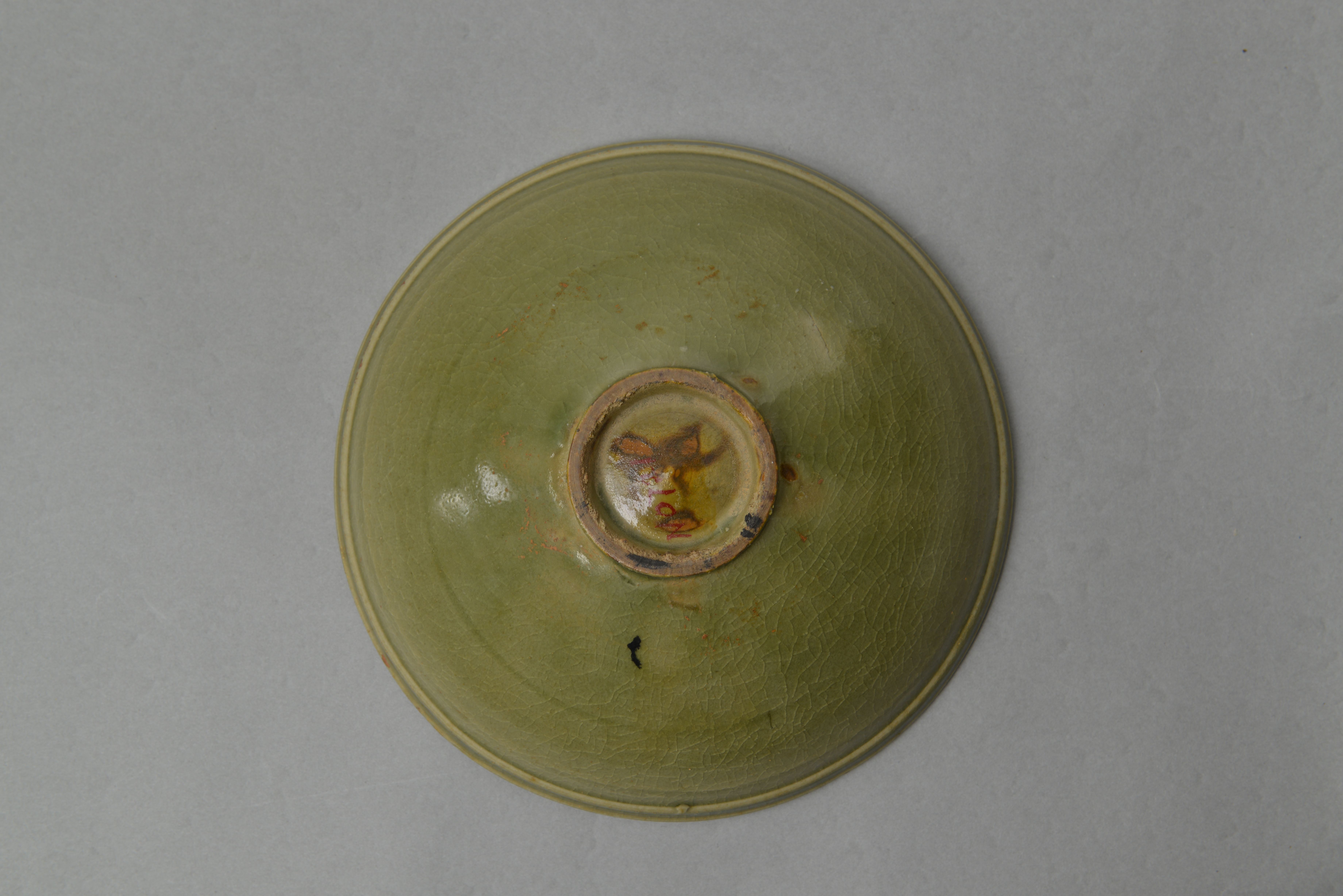 敞口,圆唇,口沿下作一周凸棱,弧腹,小圈足。内壁刻莲花纹,施青釉,有开片,足圈露胎。
