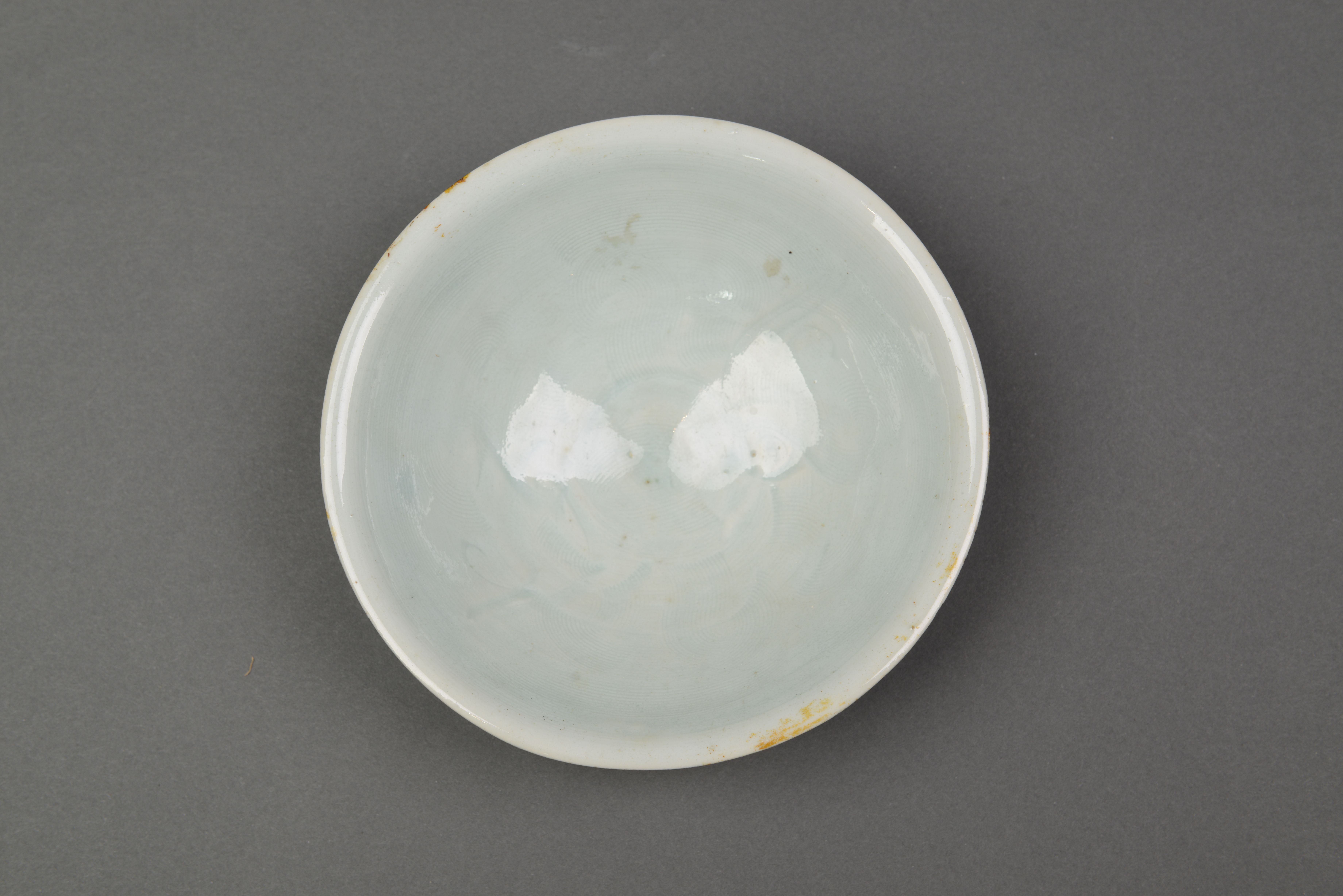 大撇口,斜腹微弧,小圈足。内壁饰篦划纹,刻双鱼纹,线条流敞,刀法犀利。青白釉晶莹润泽,质感如玉,足底露胎。