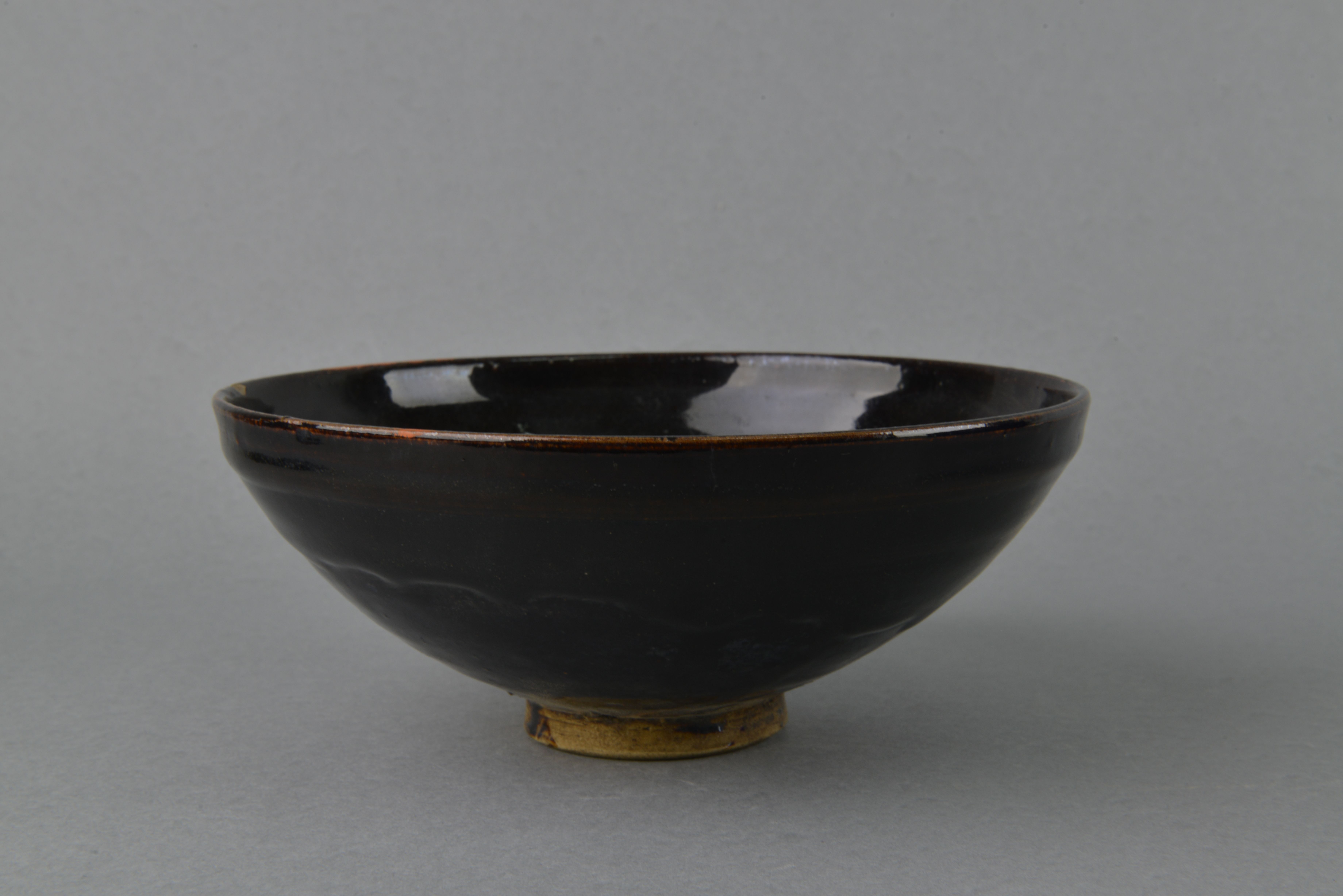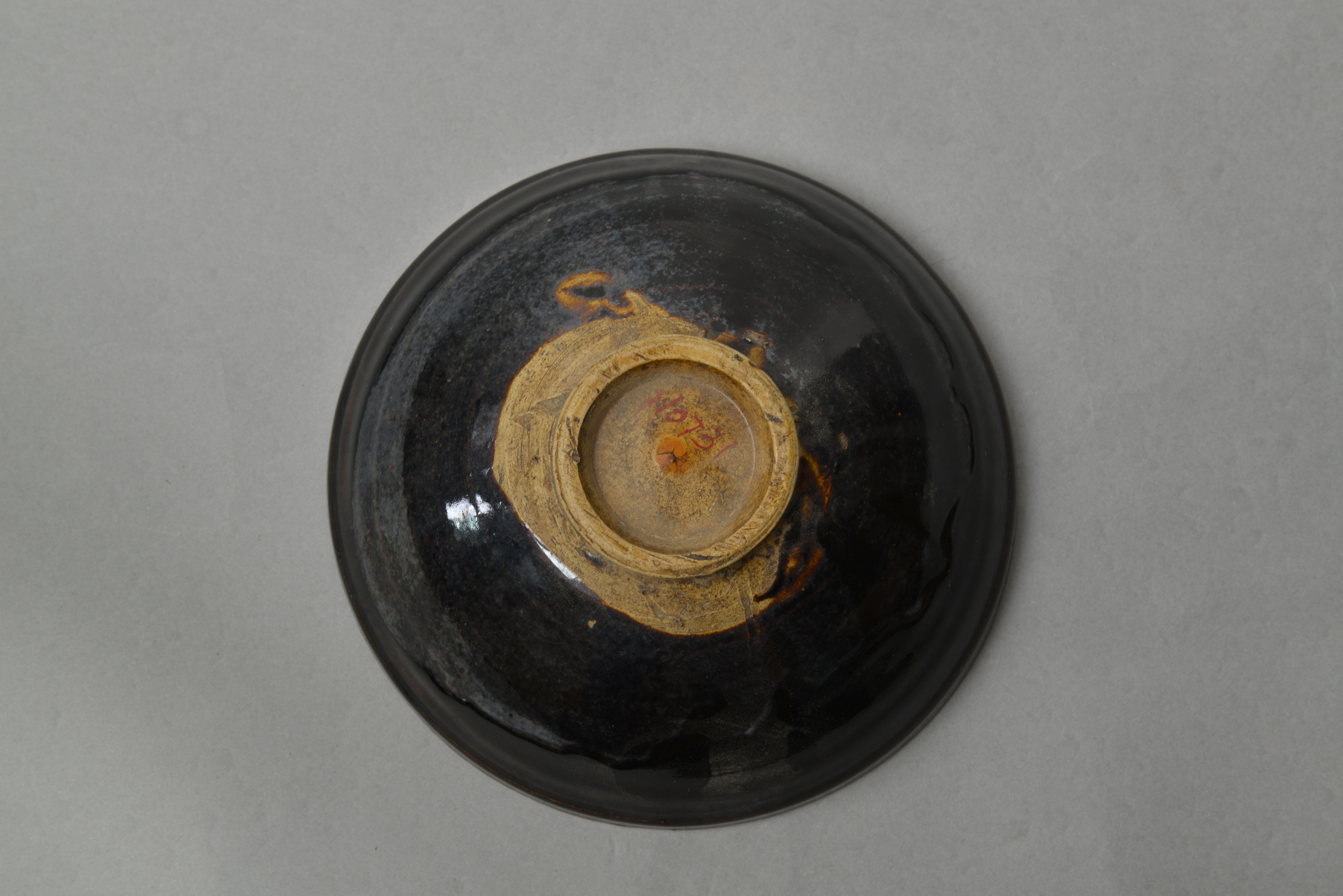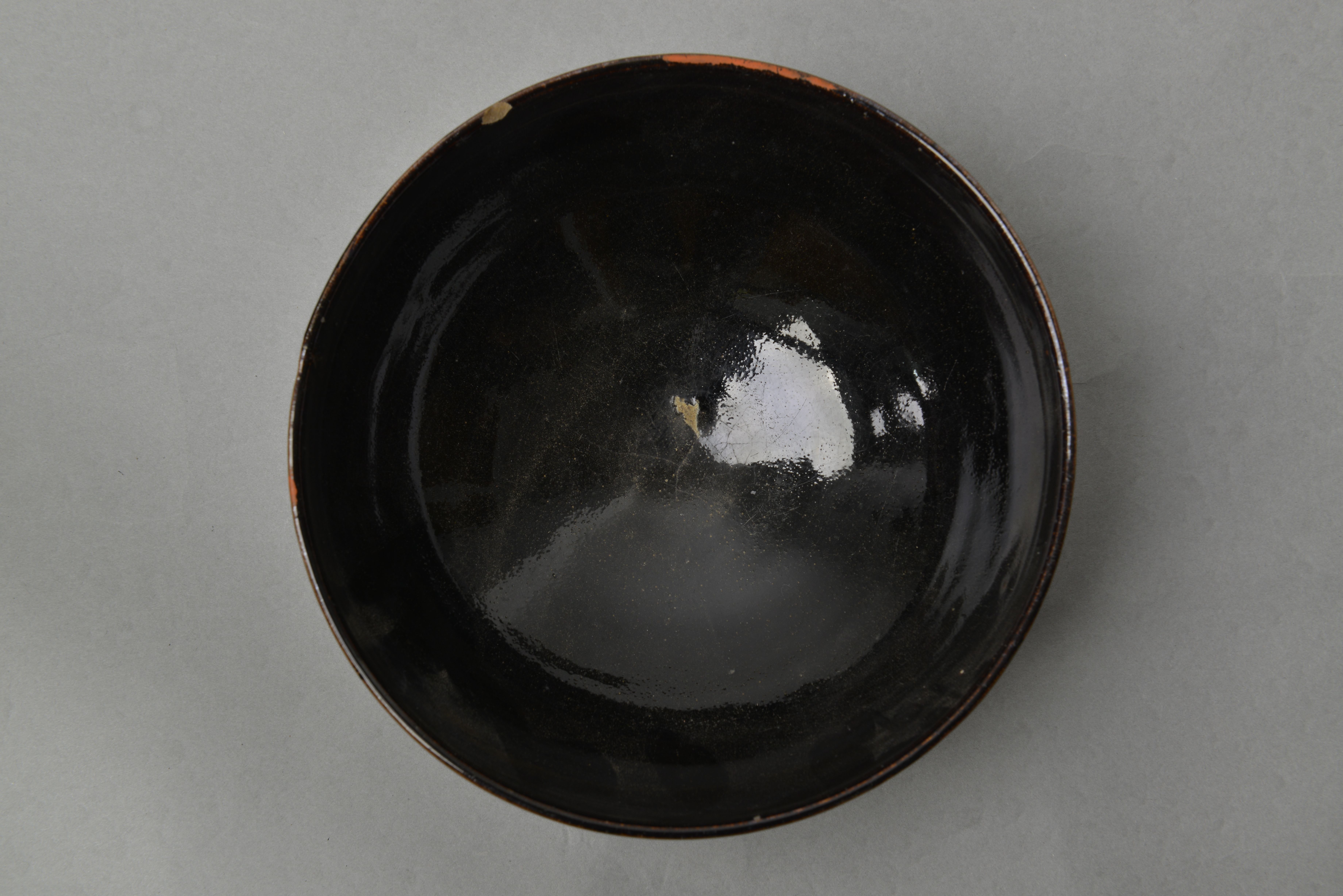 敞口,口沿外作一周凸棱,斜弧腹,圈足,脐底。施黑釉,近足处刮釉,圈足露胎。