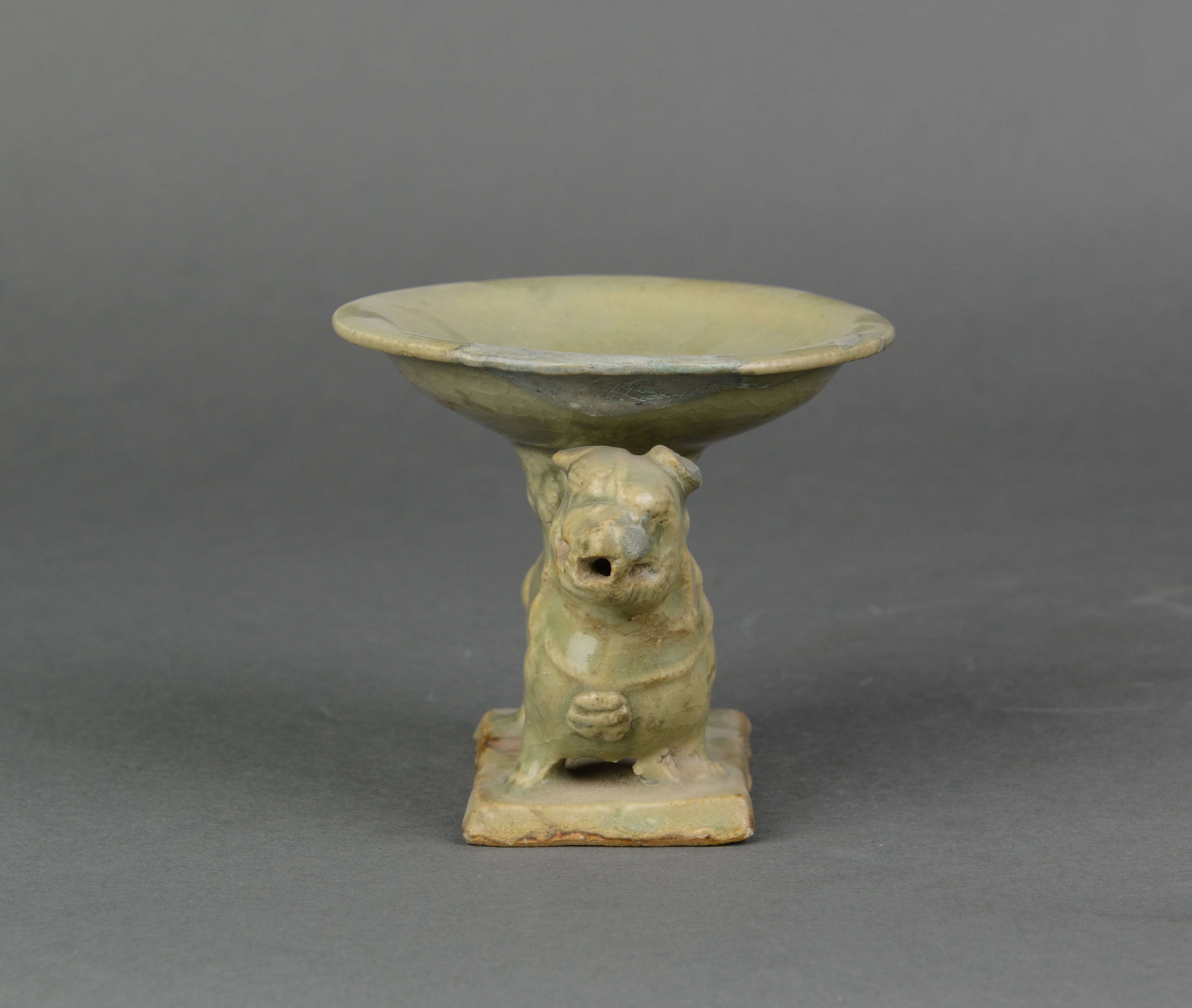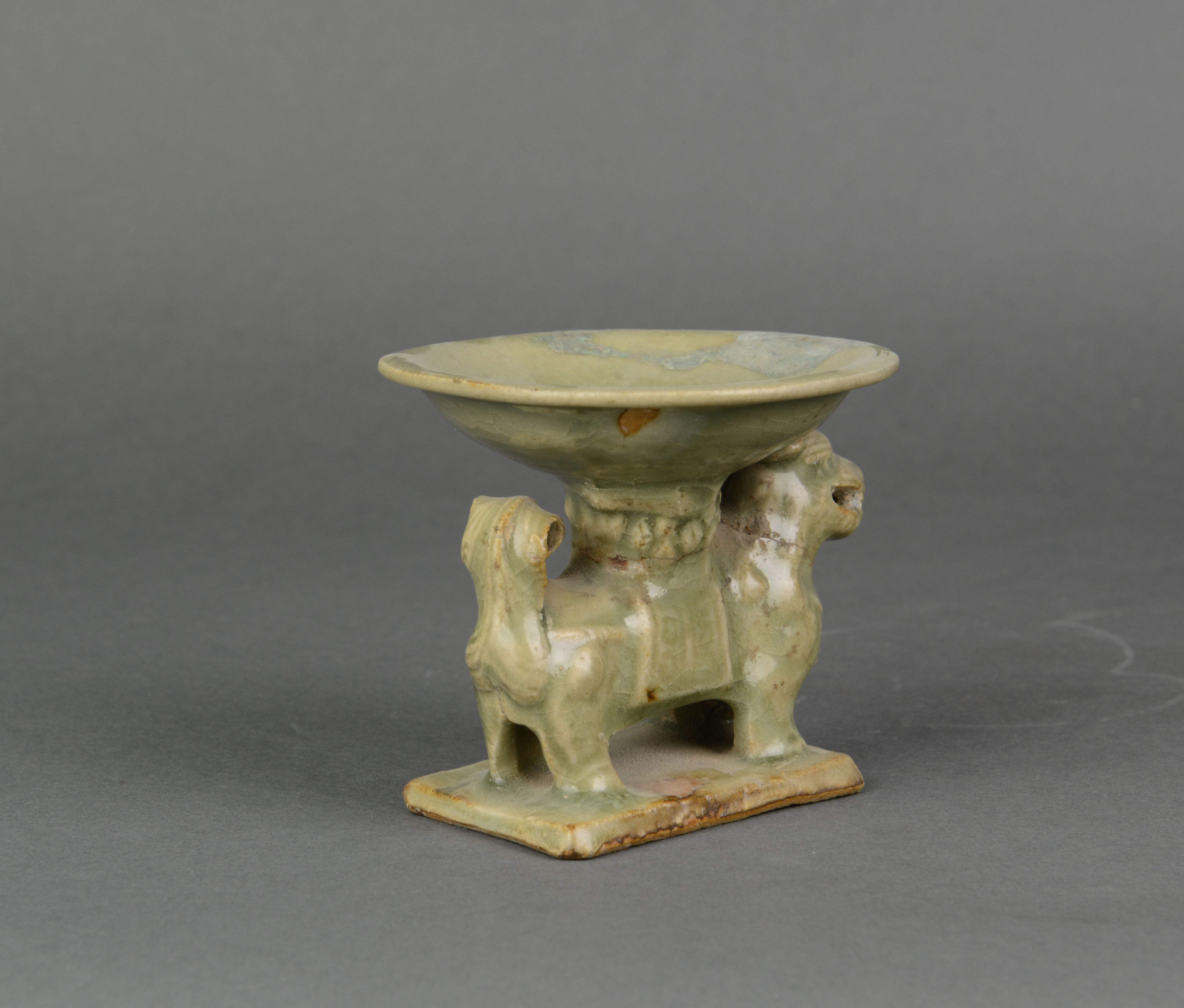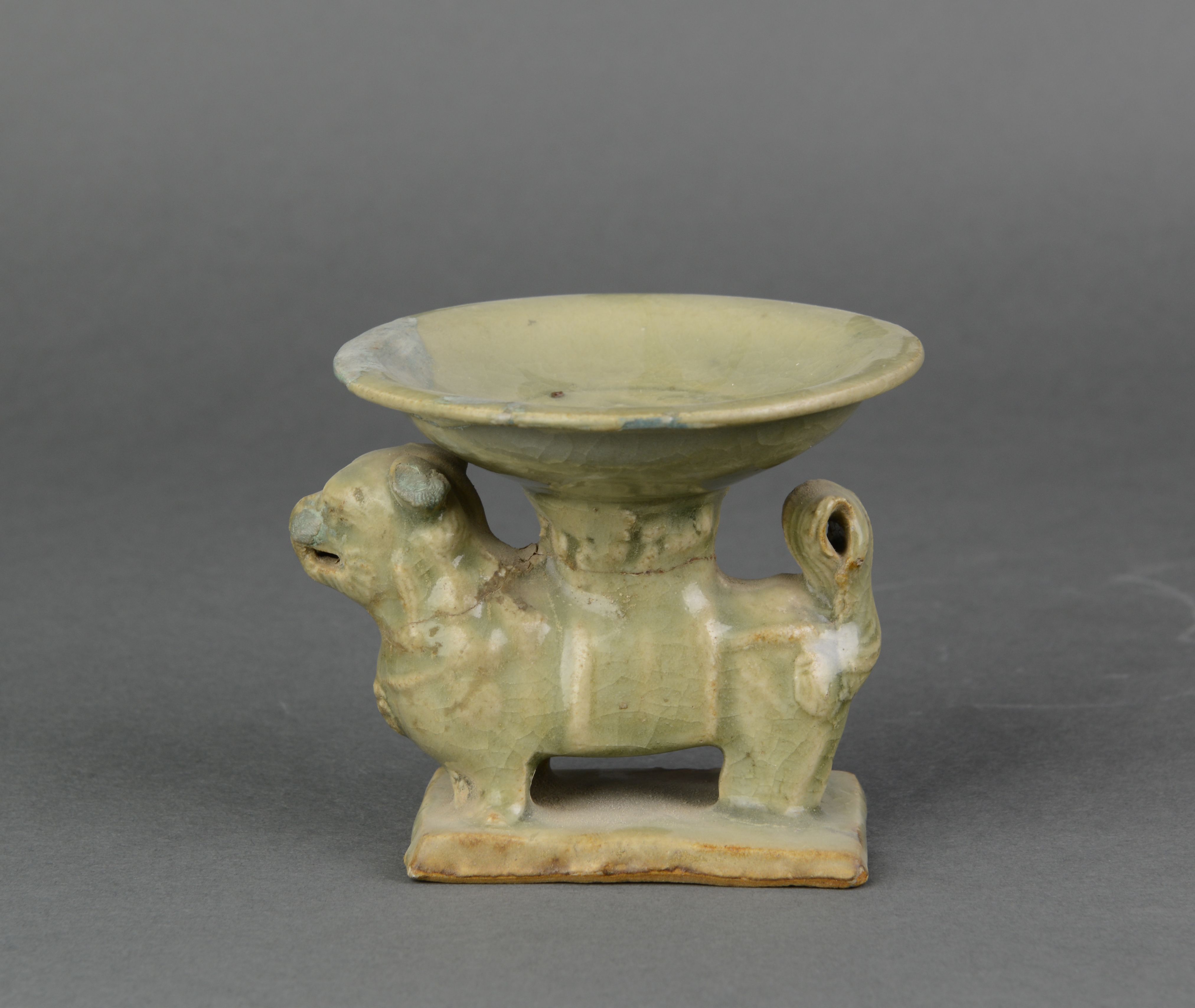 下为长方形平板座,座上站立一狮,昂首微右偏,尾上卷,胸系铃铛,背配云雷纹鞍垫,仰莲柱口置盘形盏,盏心刻莲叶纹,施青灰色开片釉,座底露胎着化妆土。