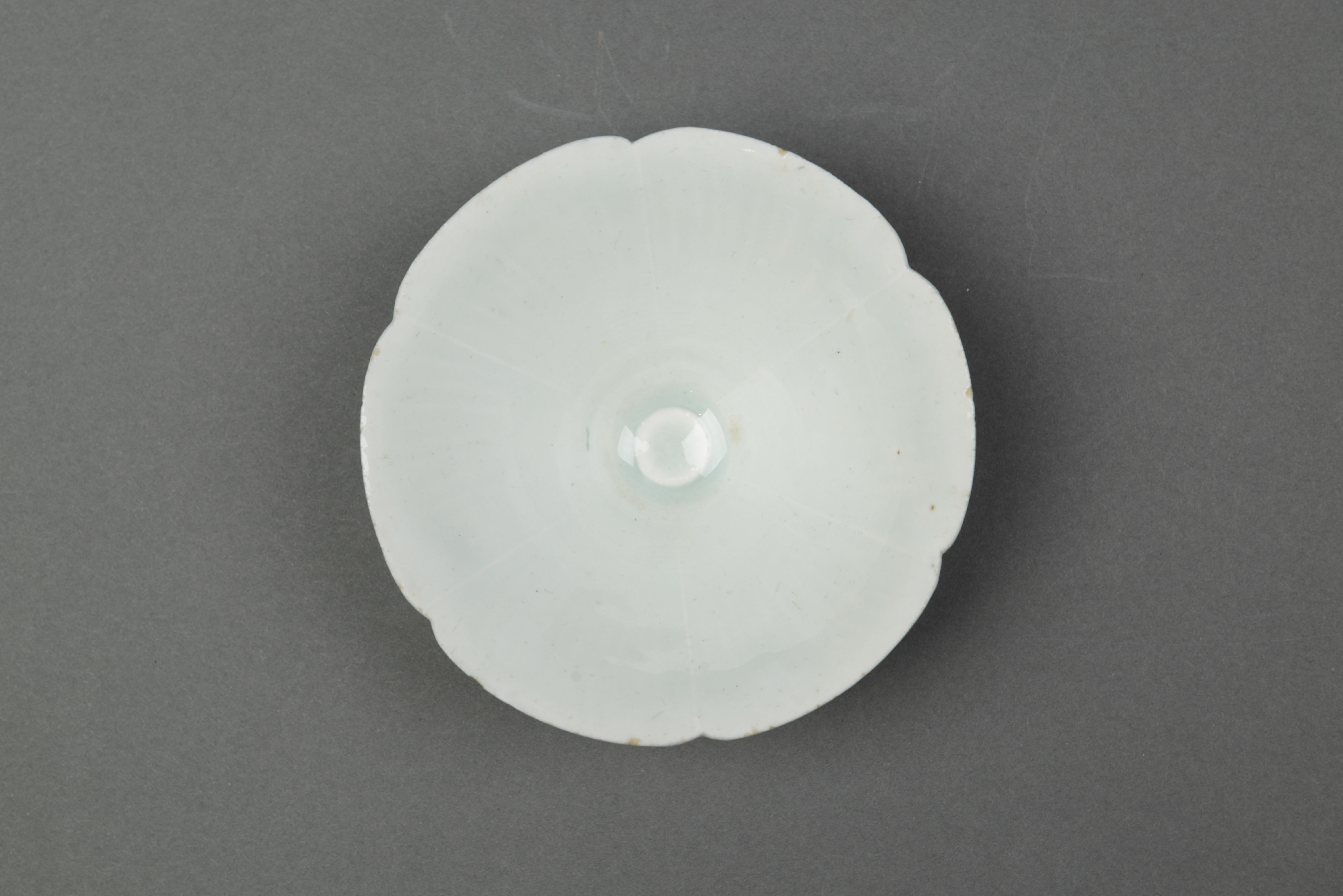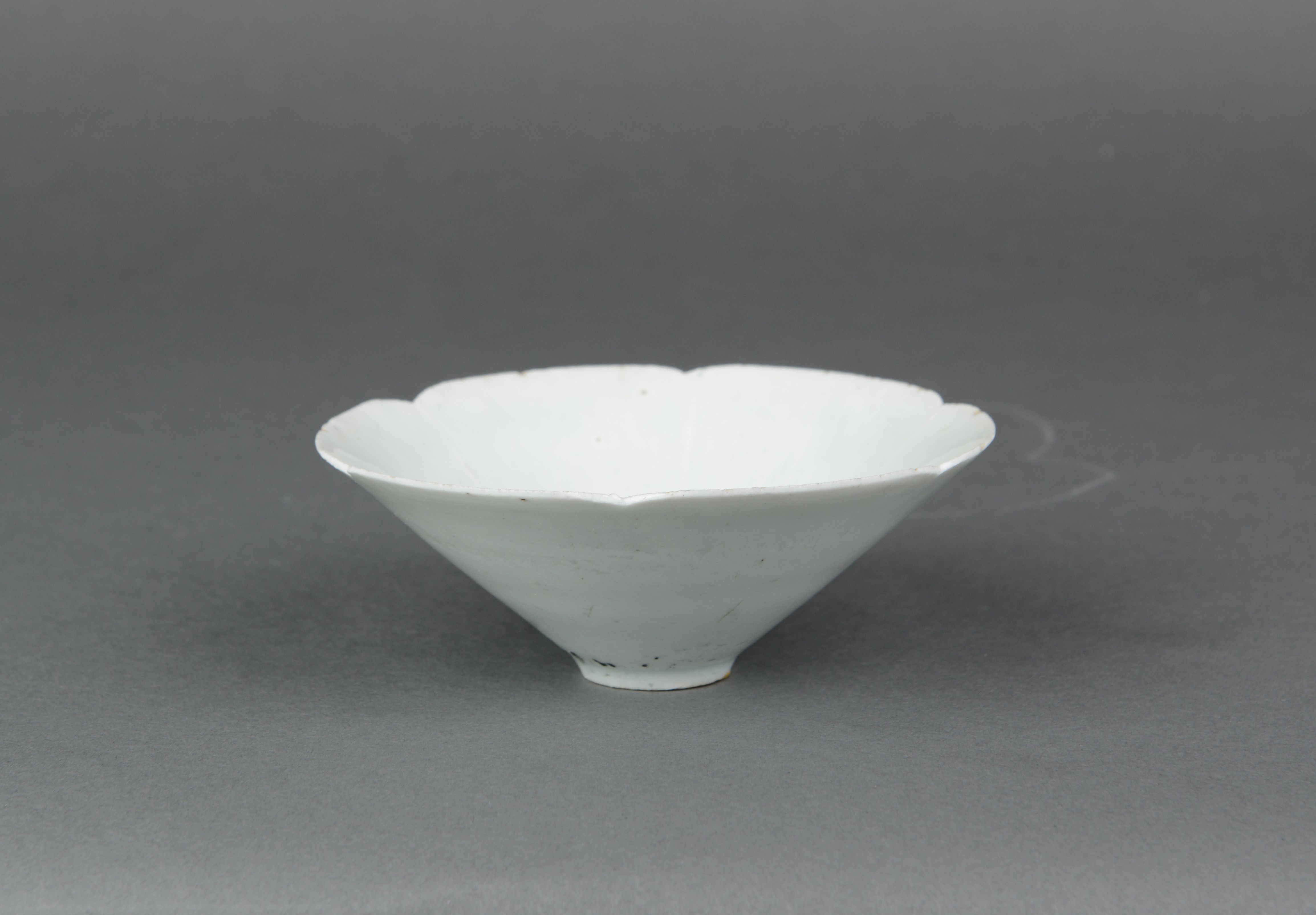 大敞口作六瓣葵花形,腹壁斜直,小假圈足,平底,青白釉晶莹润泽,质感如玉,胎体细薄,足底露胎。
