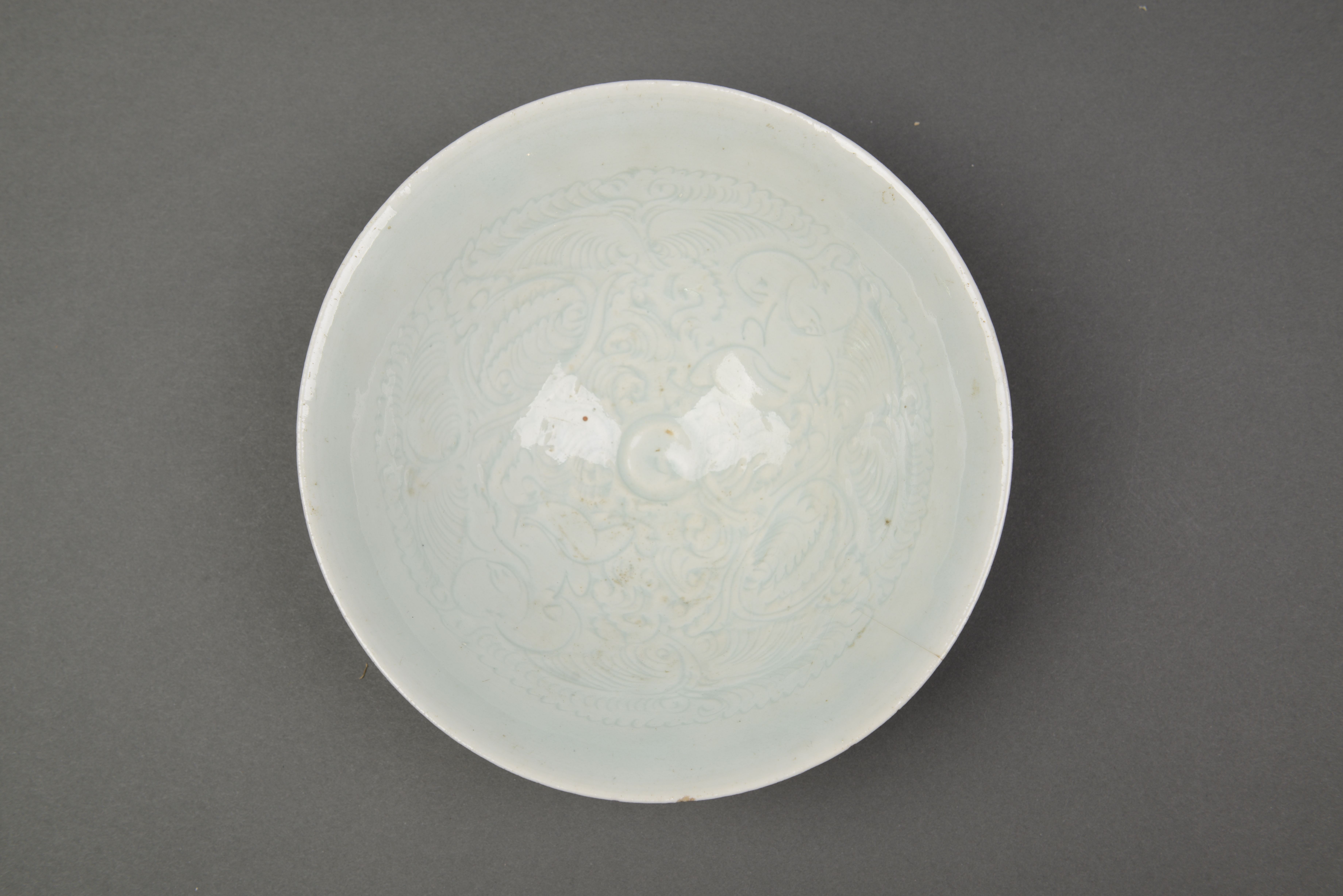 碗呈倒笠形,大敞口,斜腹微弧,小圈足。内壁印婴戏纹,手法细腻,表现孩童娇憨之态生动传神。青白釉晶莹润泽,质感如玉,胎体细薄,装饰、釉质均达到了很高的水准,乃景德镇颠峰时期的作品。