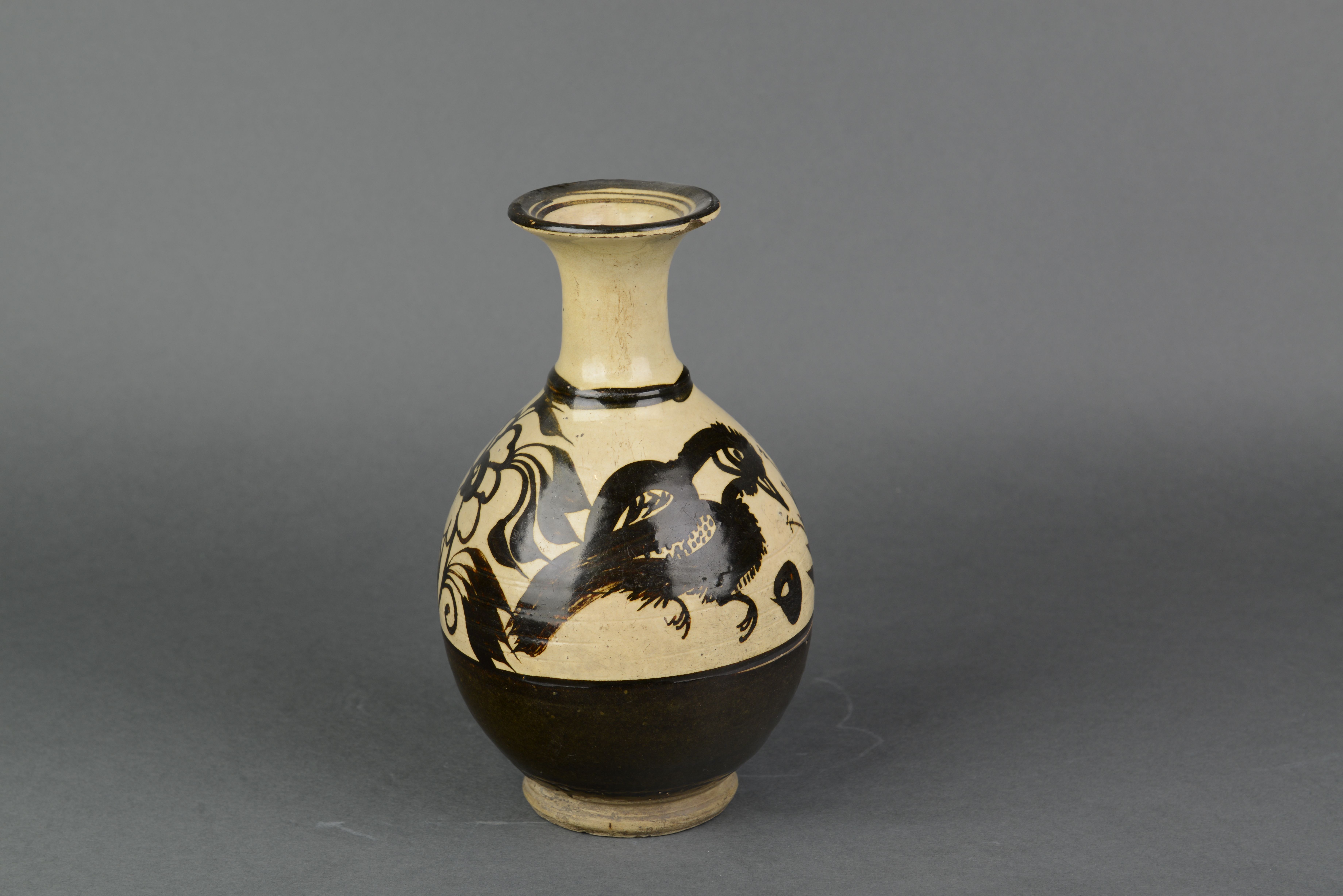 喇叭口,束颈,溜肩,颈肩部置环形单耳,圆鼓腹,圈足外撇。器表上三分之二白釉褐花,口沿饰弦纹,耳部饰草叶纹,肩部以下绘芦雁花卉纹;下三分之一施黑褐釉,底足露黄白胎。