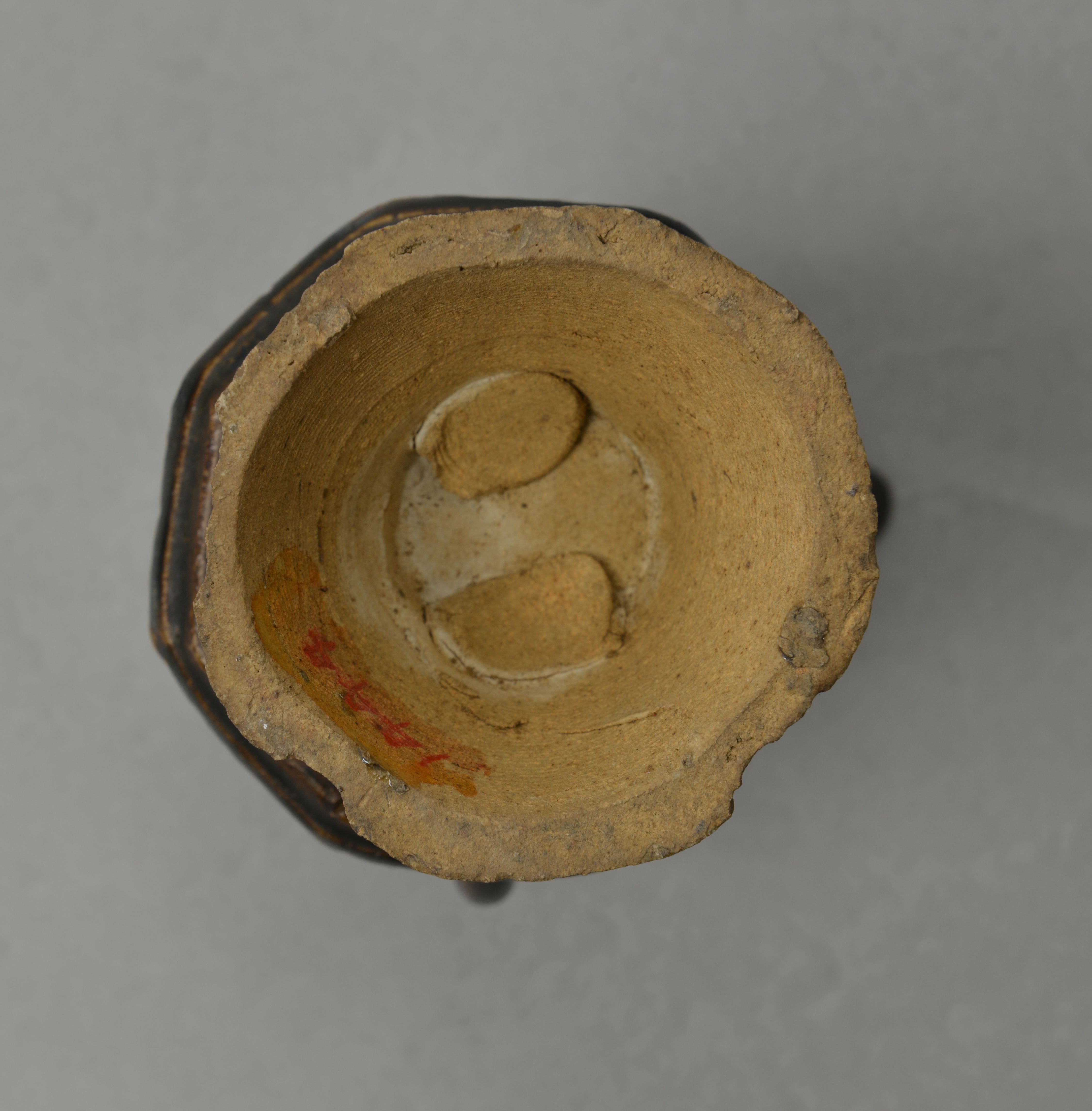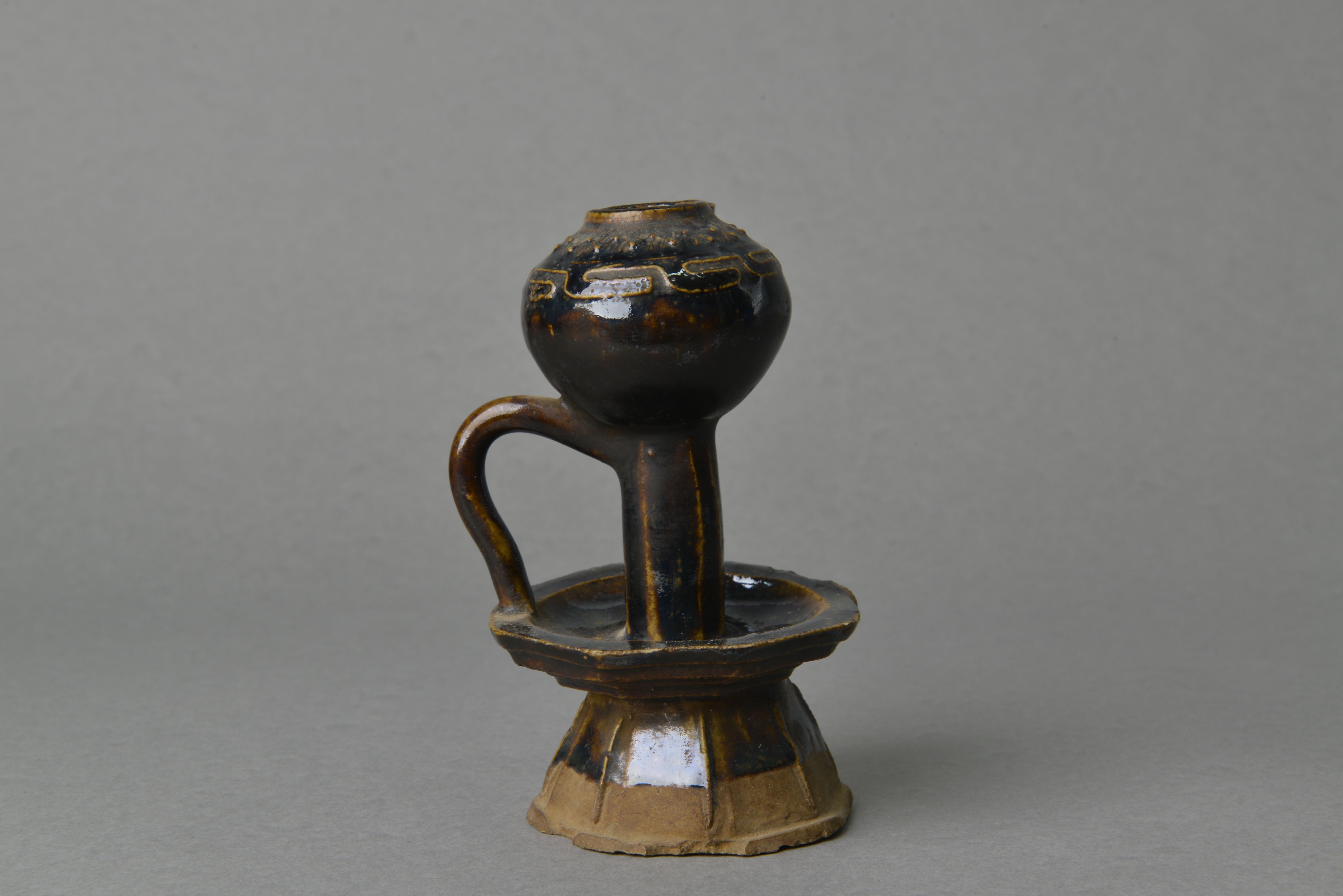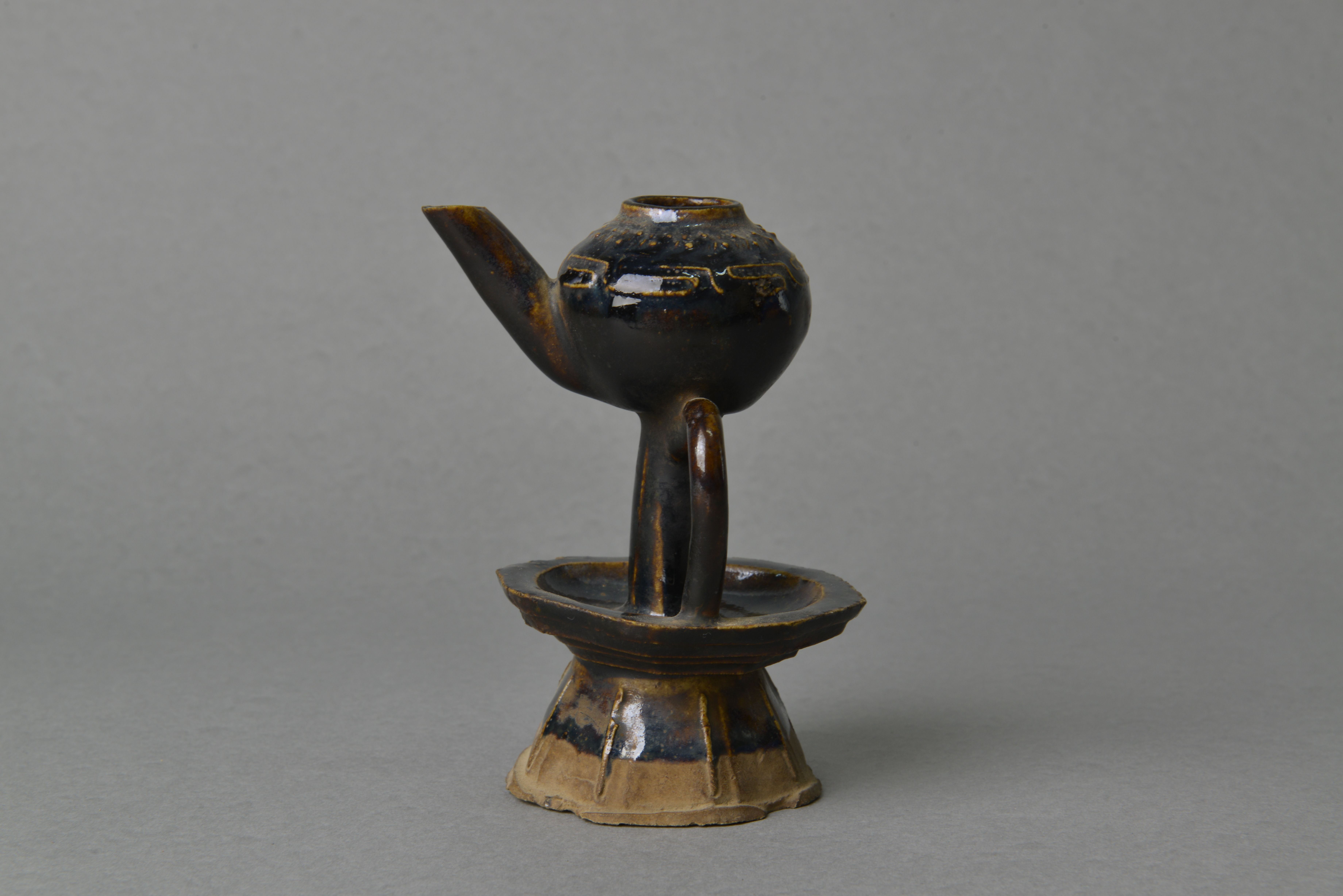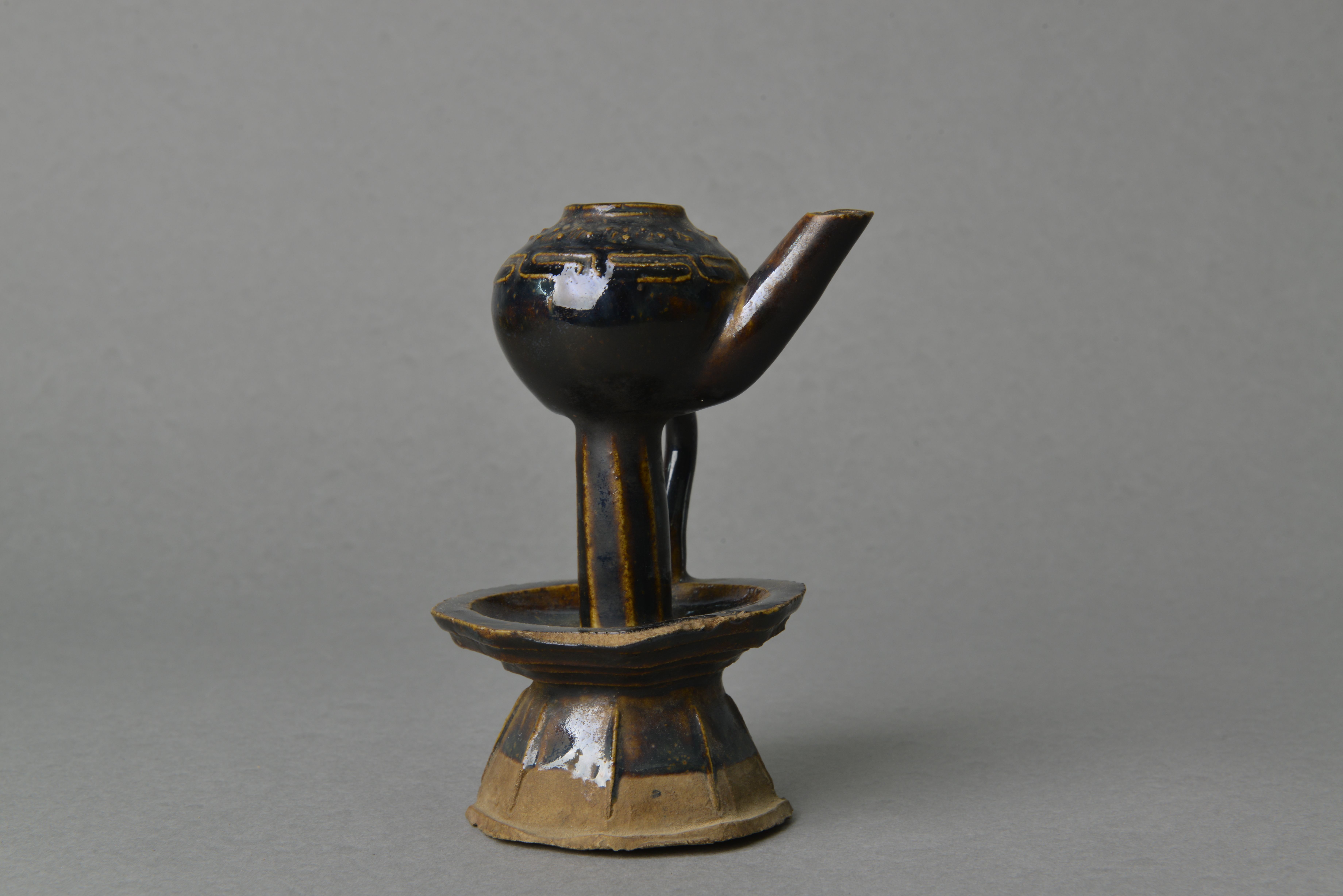 八边形高圈足外撇,上承八边形托盘,盘心立八棱柱,柱盘间作曲柄,柱顶承油壶,壶作小口,鼓腹,出长直流,施酱黑色釉,足圈丰釉。壶肩腹部饰波折状连珠纹和回纹,盘外壁饰多重凸弦纹。