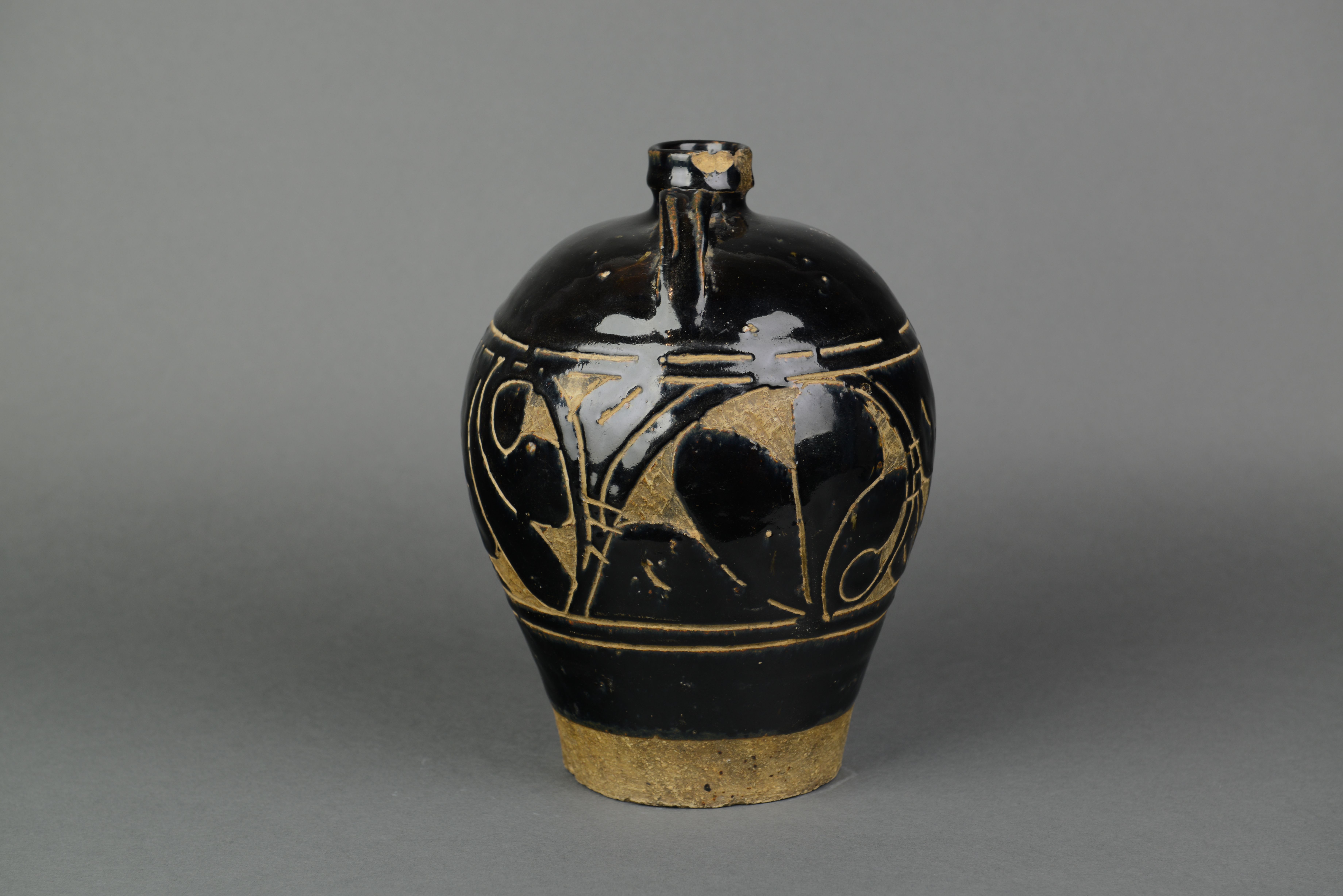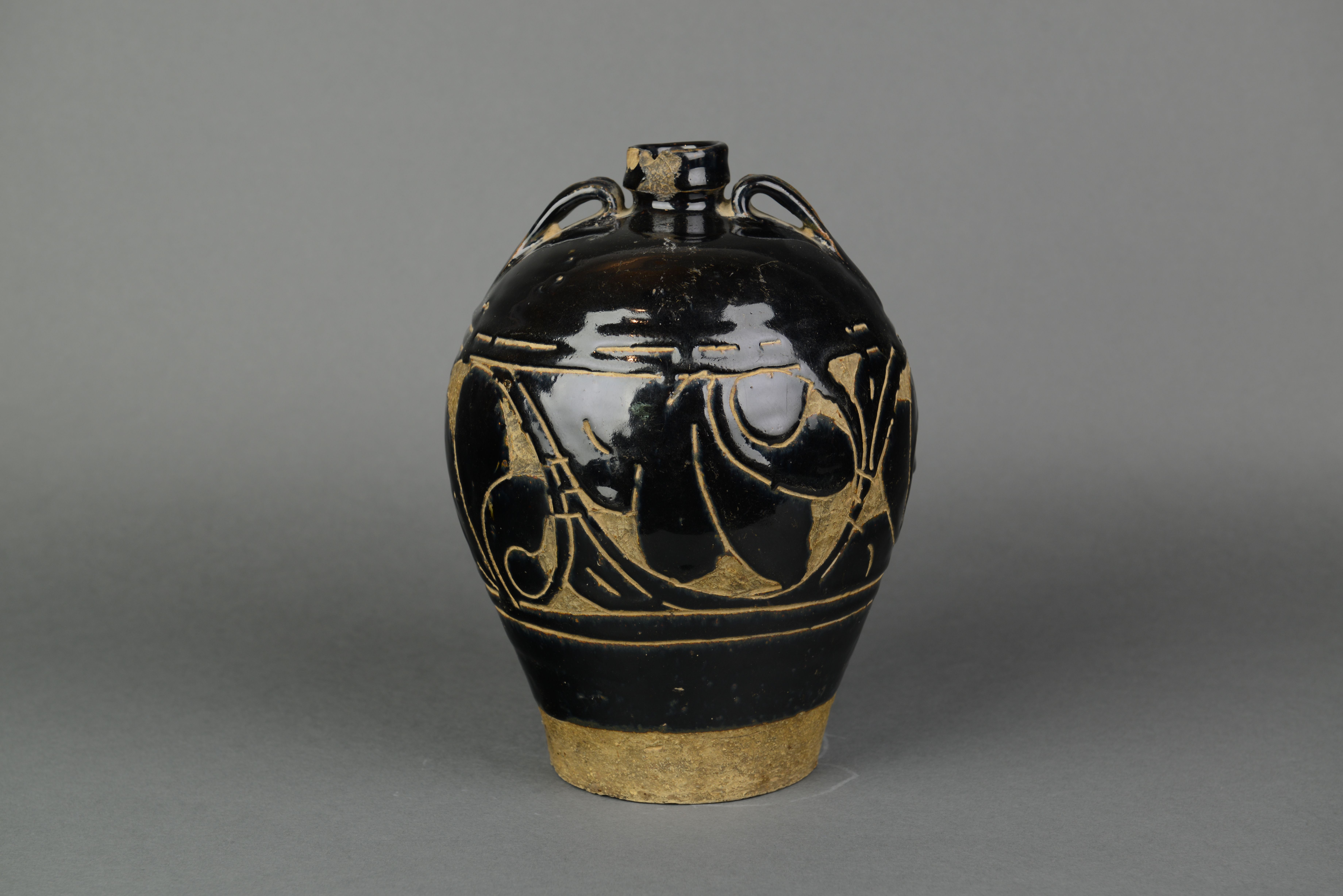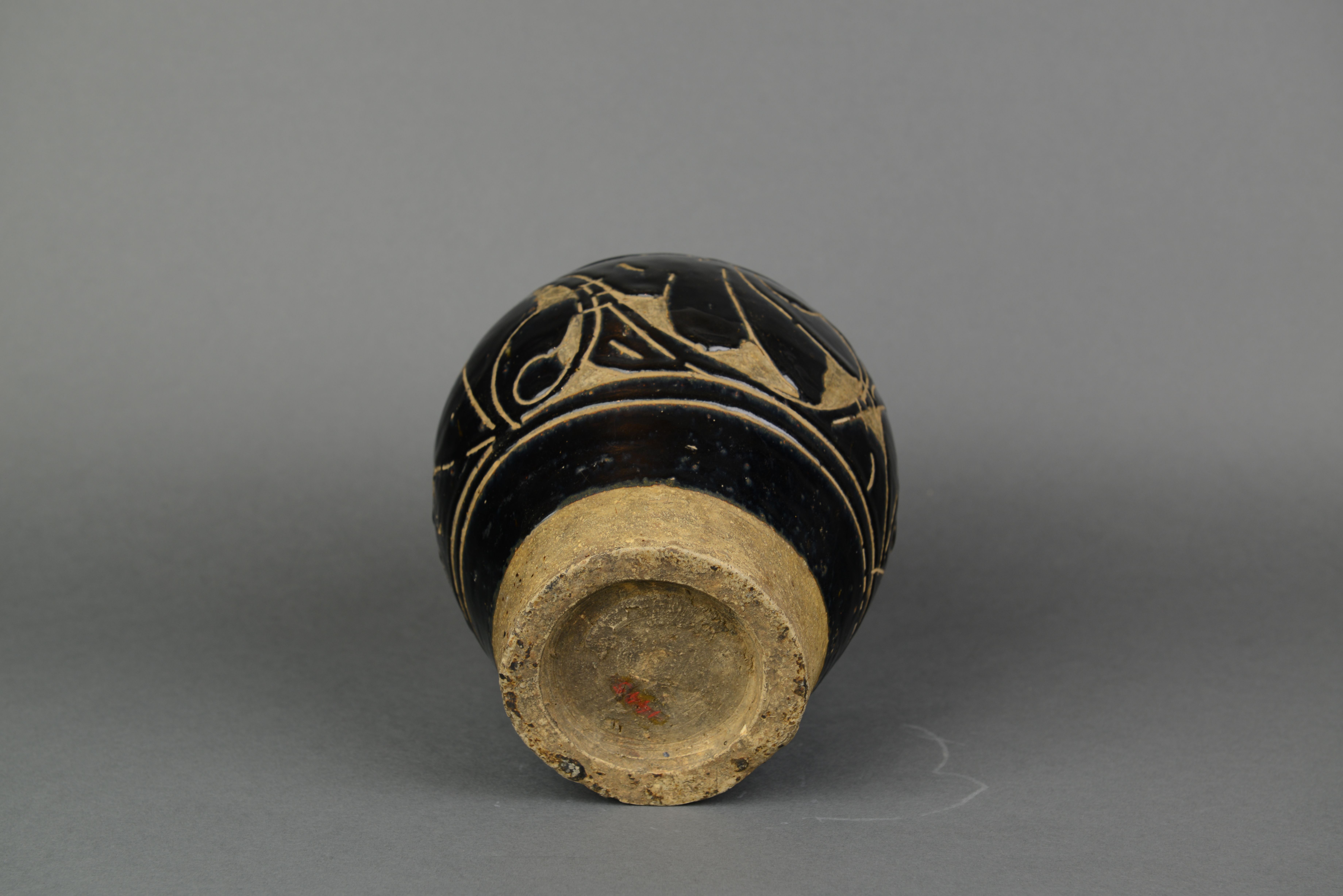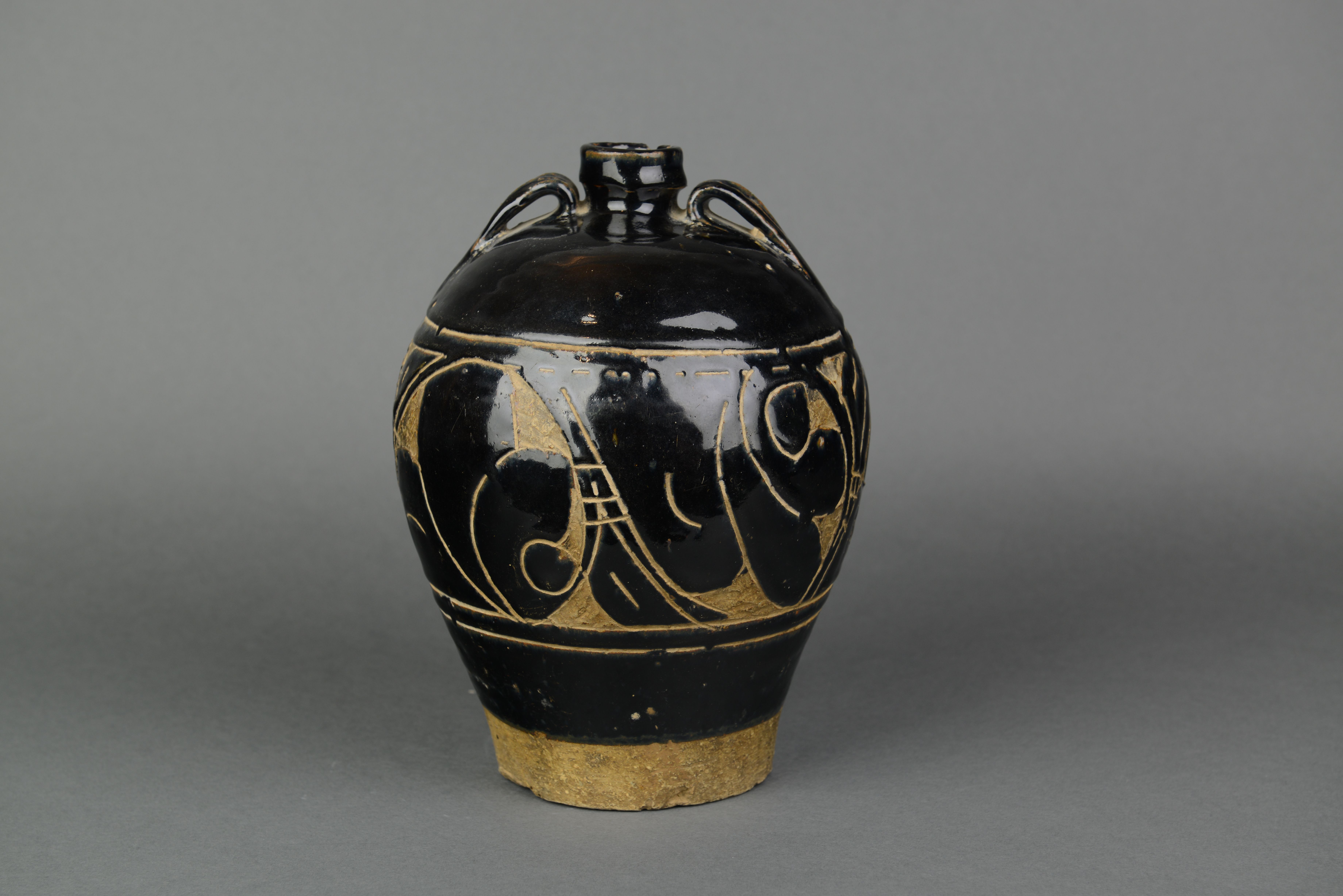 小口,短颈,圆肩,肩部作对称牛鼻形双系,上腹圆鼓,下腹斜收,环形圈足。黄白胎黑釉,腹中部剔刻折枝叶脉纹,简洁粗犷,腹下部近圈足处及圈足露胎。