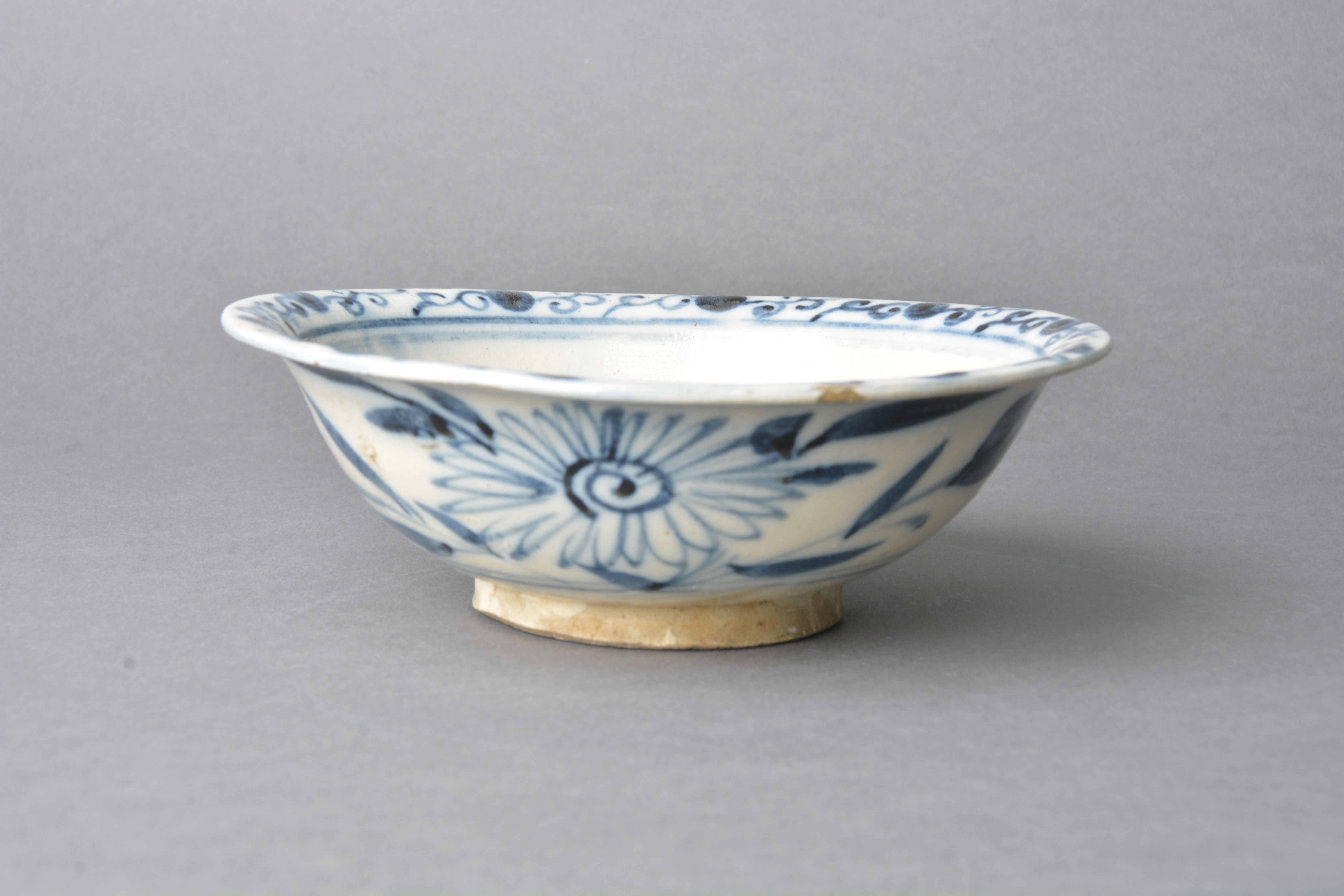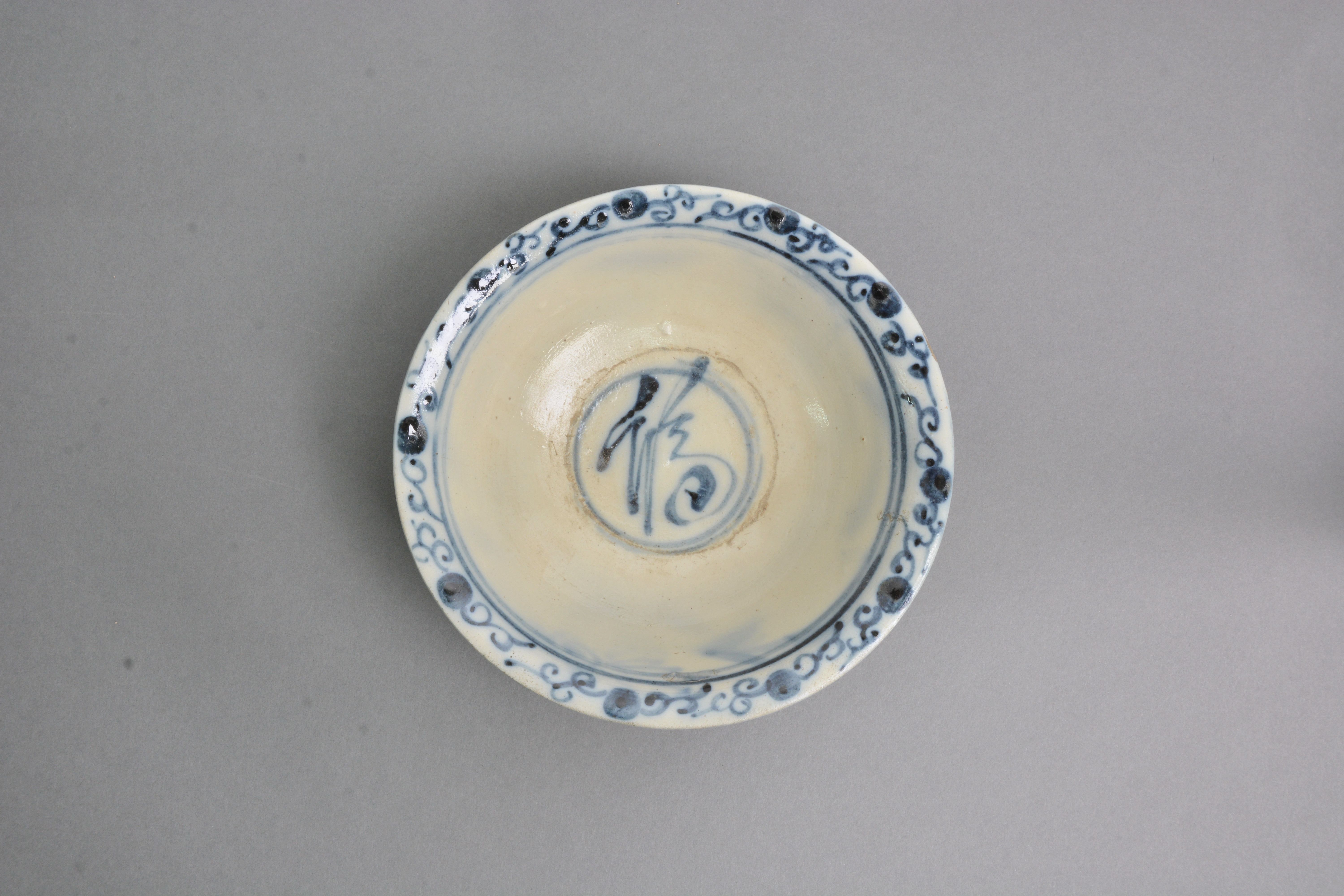 白釉青花,敞口,沿外撇,浅弧腹,圈点。口沿饰一周卷草纹,内底有青花手写草书“福”字款,外壁饰折枝菊花纹。底足露黄白胎。