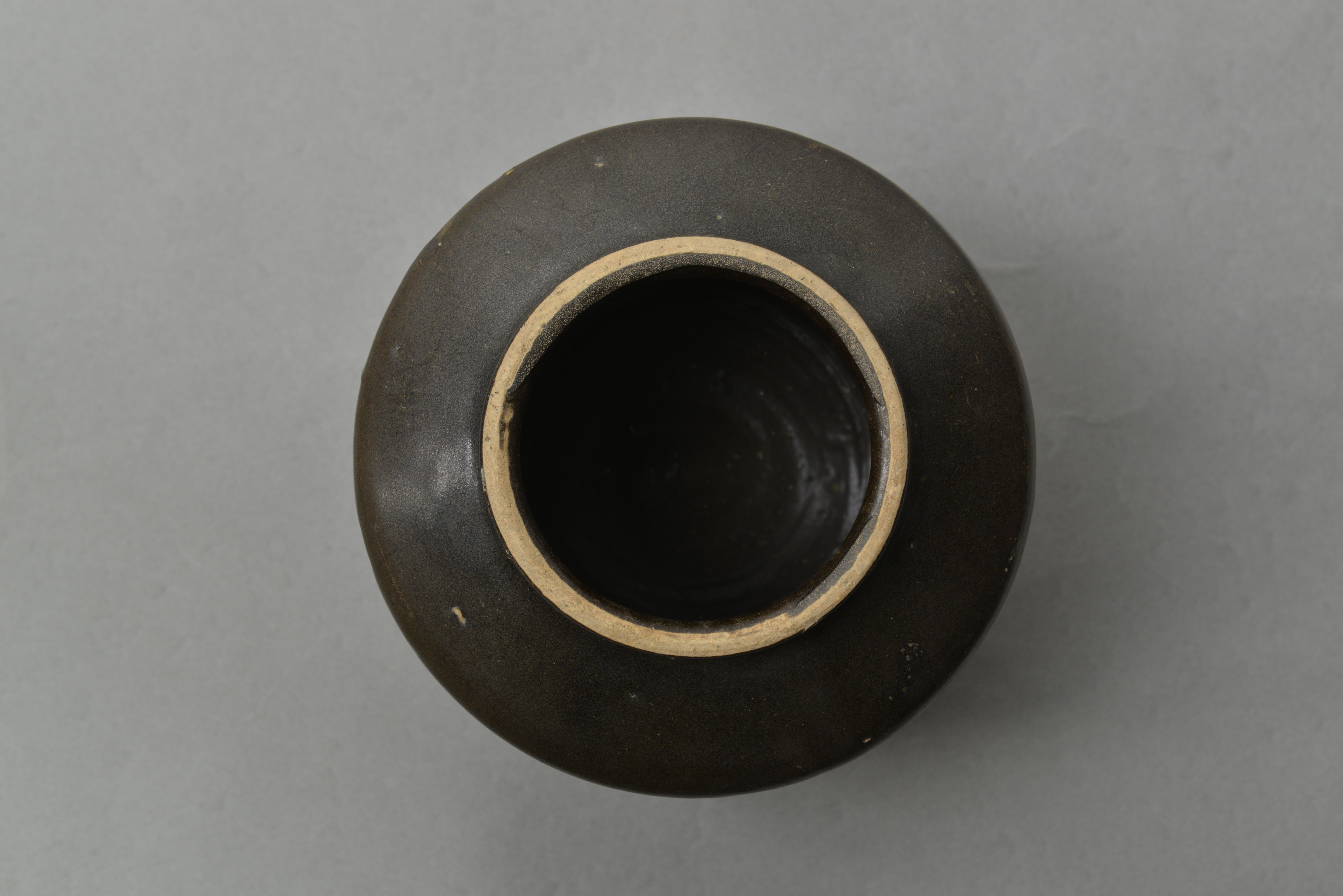 直口,短颈,折扇,筒形腹下斜收,矮圈足,平底。施黑褐色酱釉,口沿刮釉,腹中部刮釉一圈,饰两组水波状篦划纹,底部露胎。