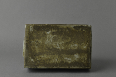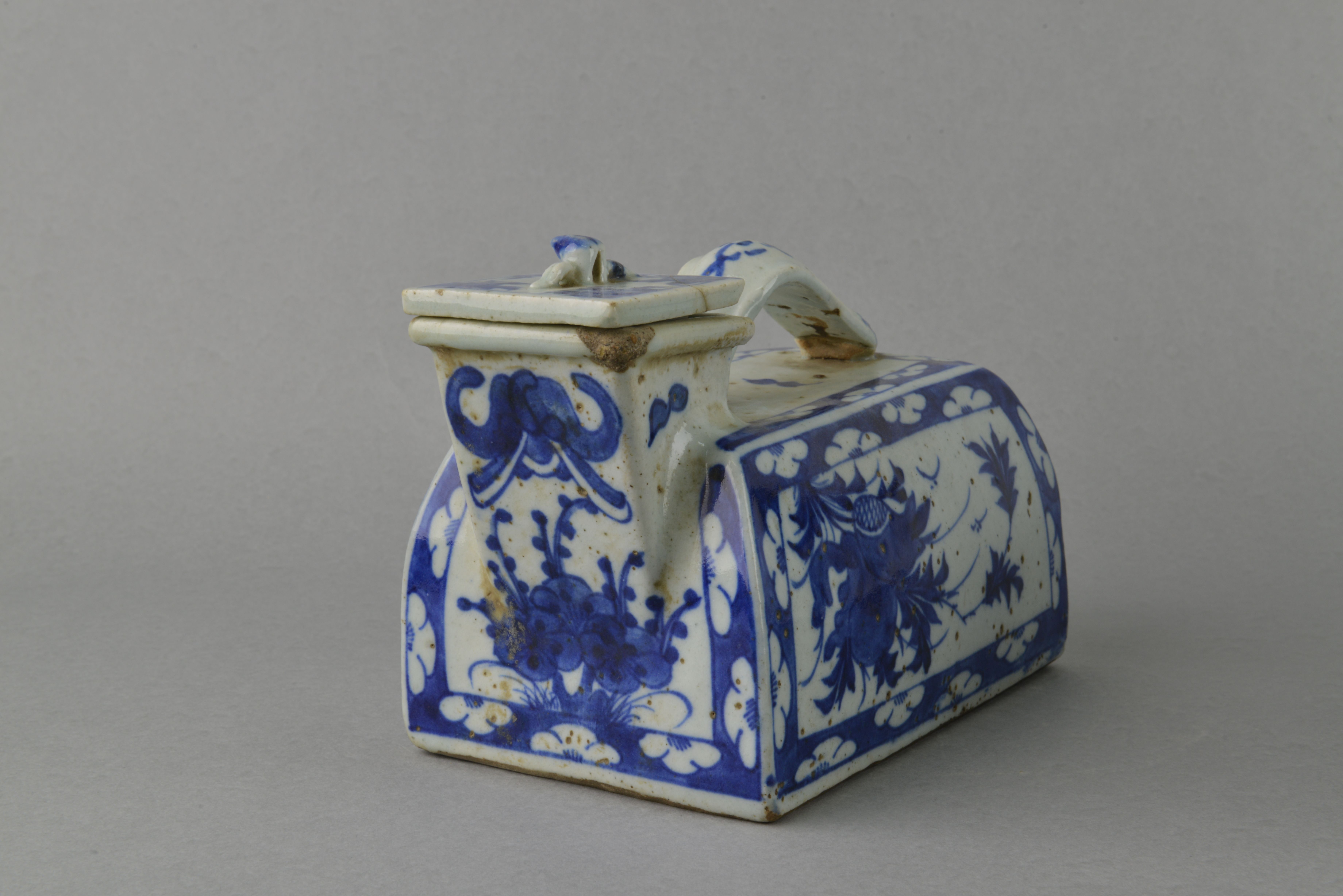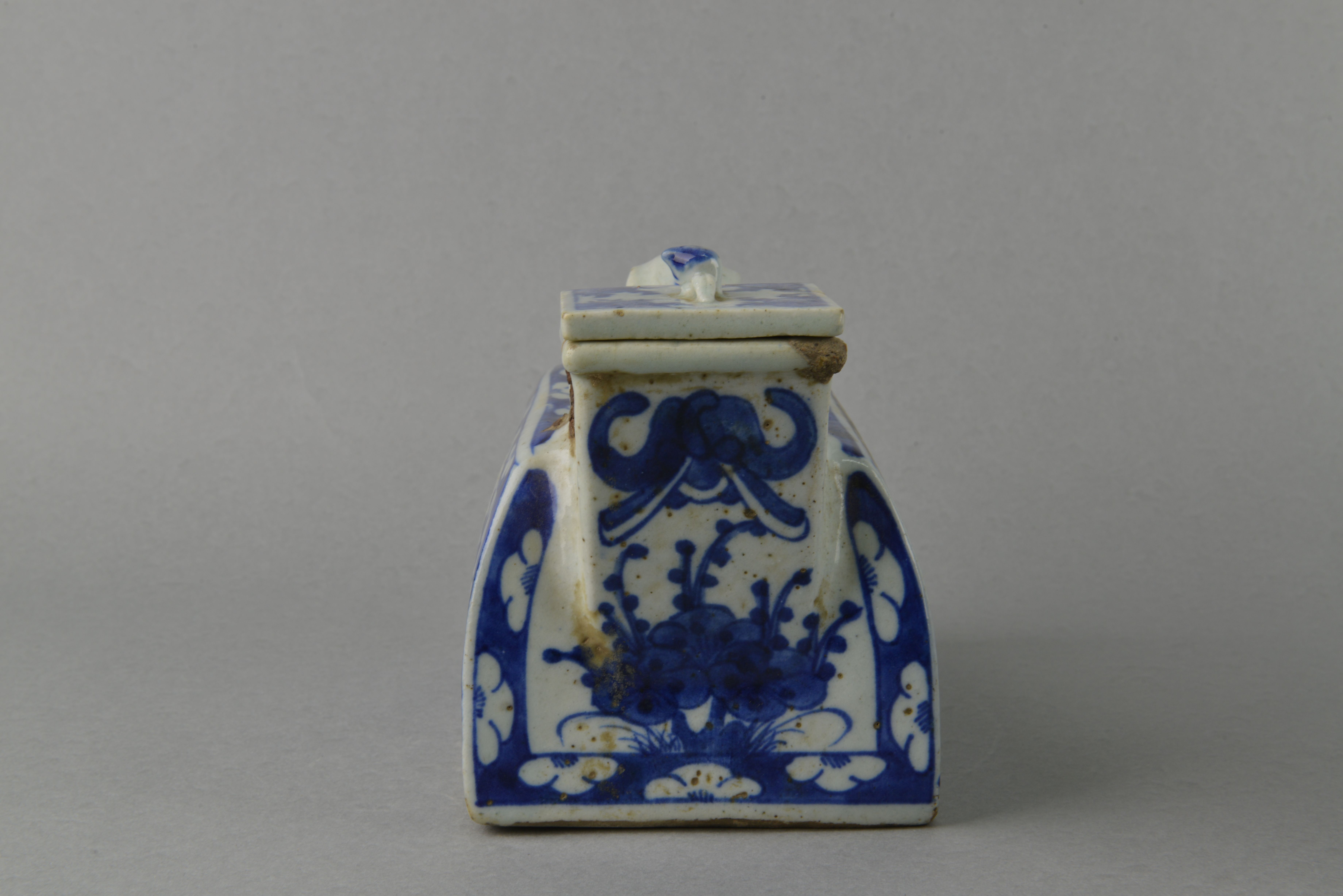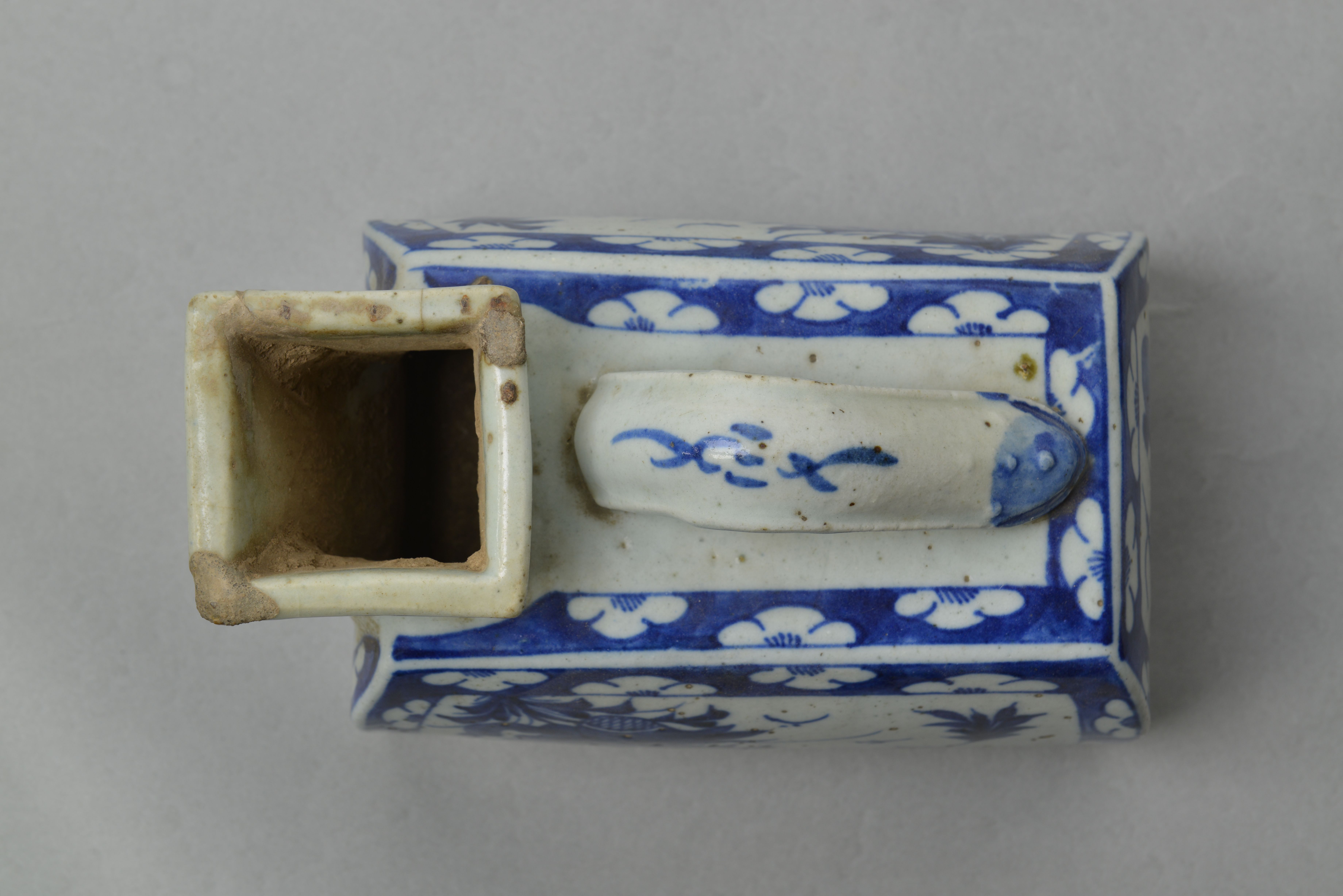 白釉青花,壶体长方形,方盖上有花钮,子母口,顶部有提梁,盖面方框,四角绘四石榴果,四周及顶部开梅花圈带纹方窗,前壁绘梅枝纹,后壁绘莲纹,两侧绘折枝石榴纹,提梁上落青花花样款。