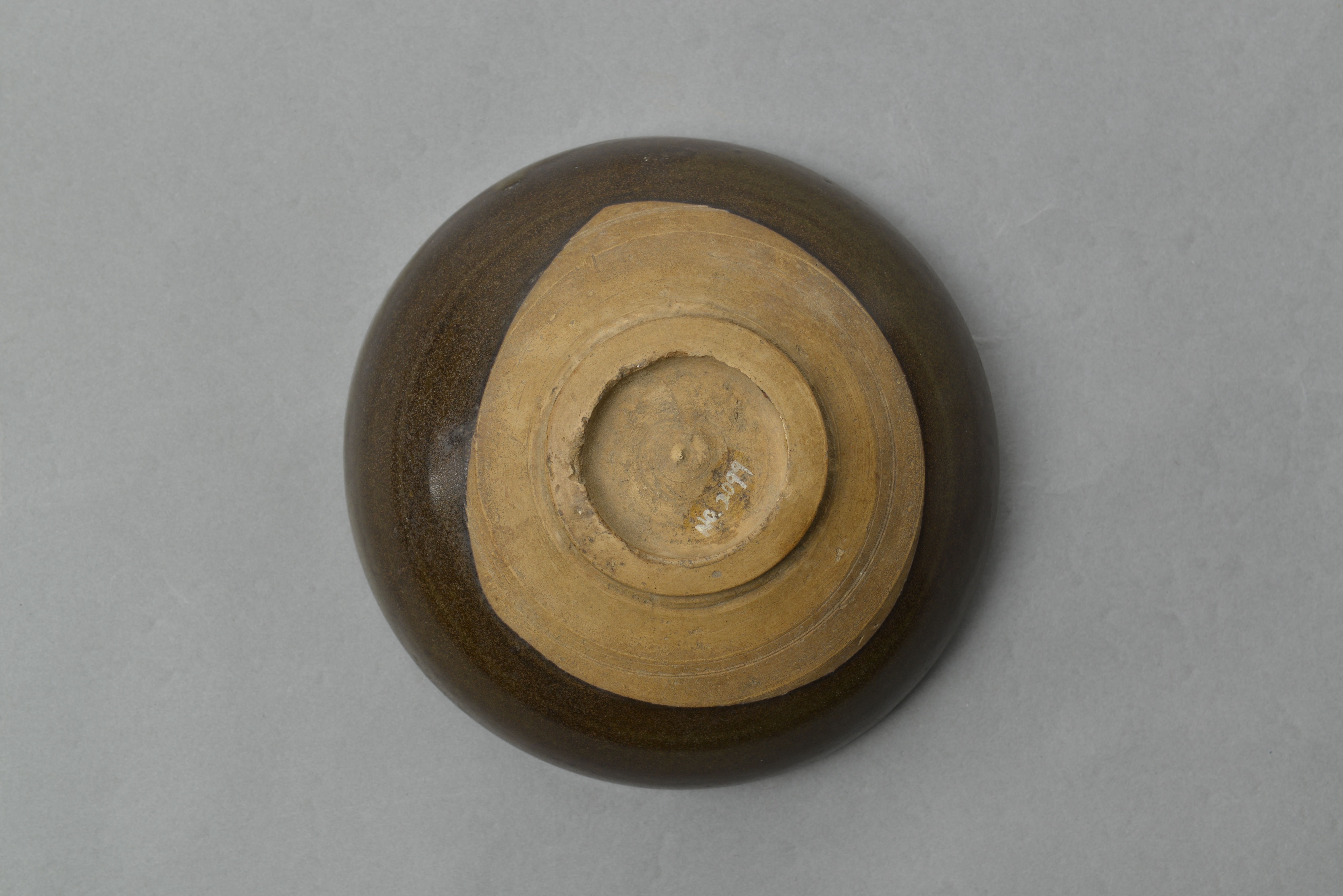 直口,弧腹,圈足,脐底,施黑褐色丰釉,内底、腹下近足处及足部刮釉,黄白胎,质坚细。