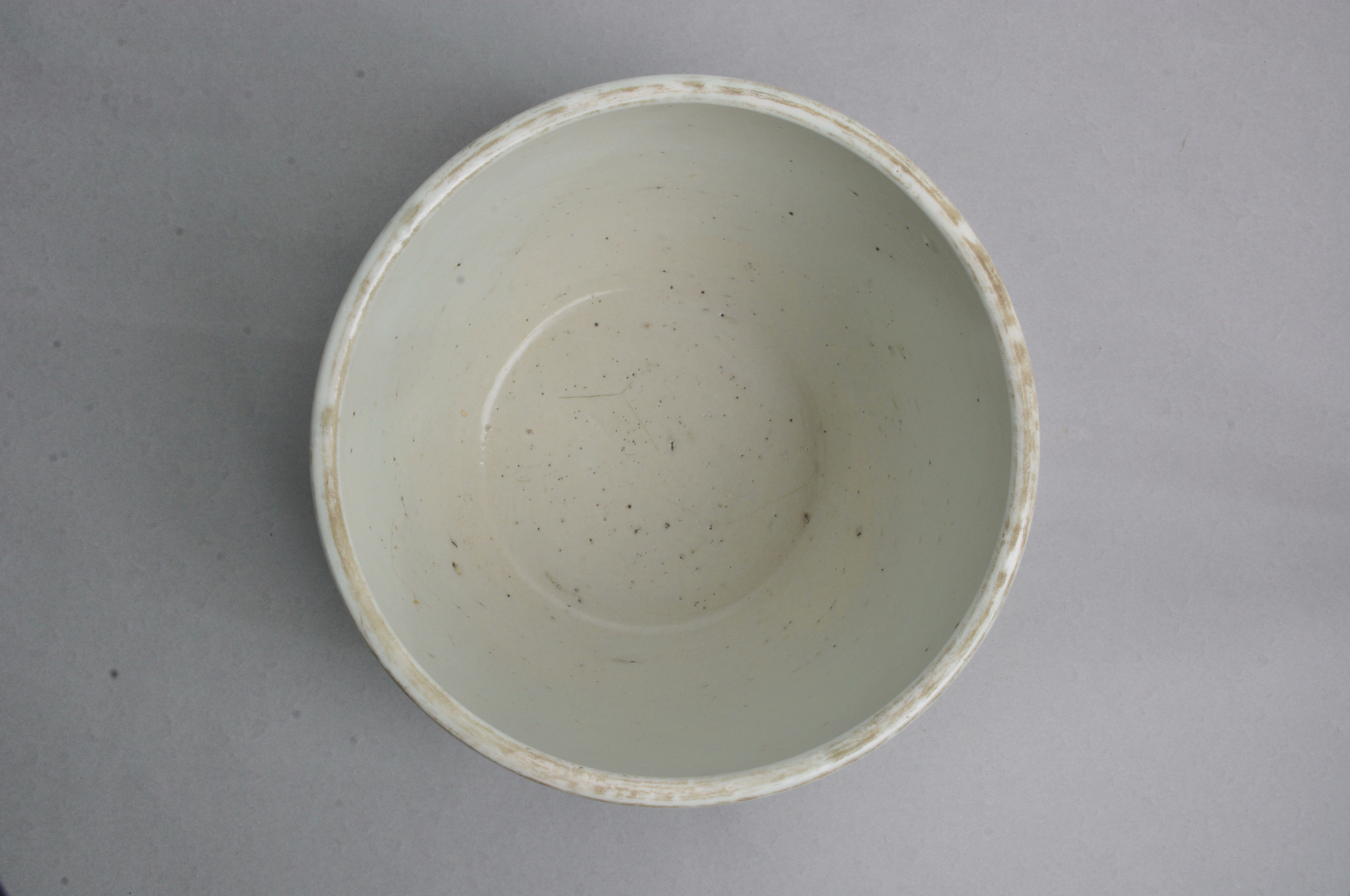 白釉青花。口微敞,深弧腹,圈足,平底,内外均施白釉,足圈刮釉。腹壁近口沿处饰弦纹,卷草纹,中下部饰海水云龙纹。