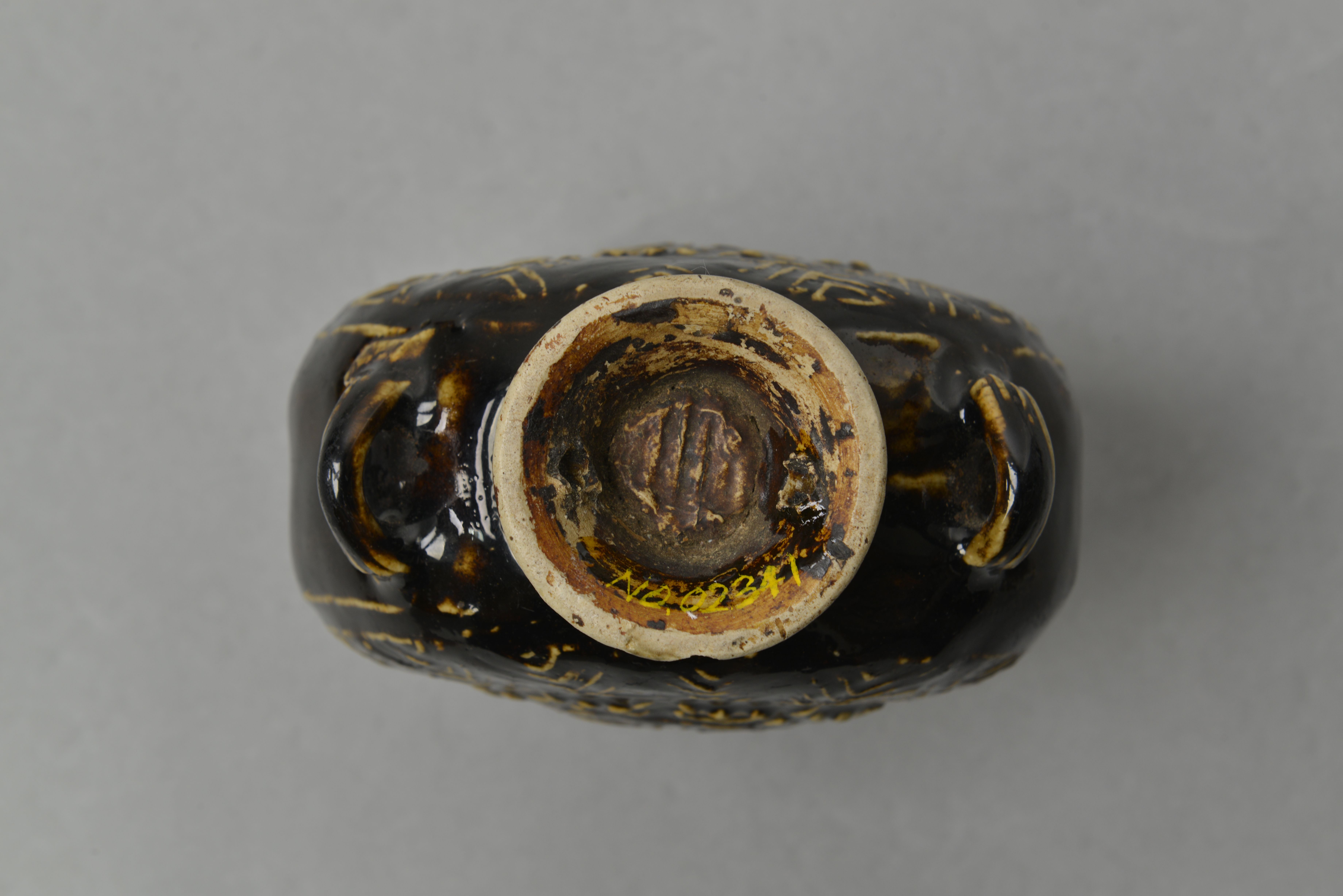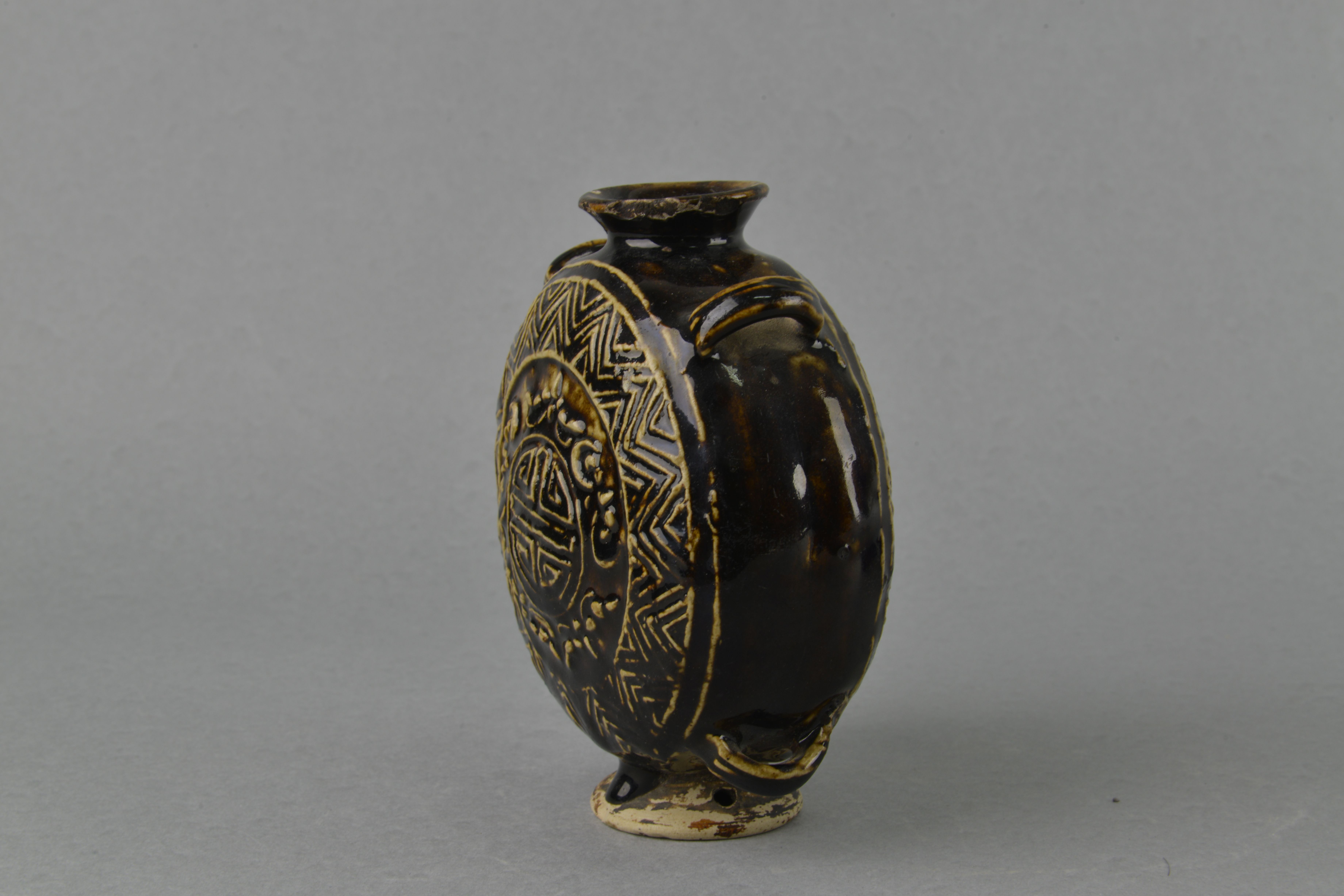 喇叭形小口,圆唇,束颈,扁圆腹,腹侧作对称四丰环条,喇叭形圈足,足根有两对称圆穿,腹两面均模印浅浮雕状多重波折纹圈,内有五蝠环捧一团寿。施酱色釉,足局部露胎。