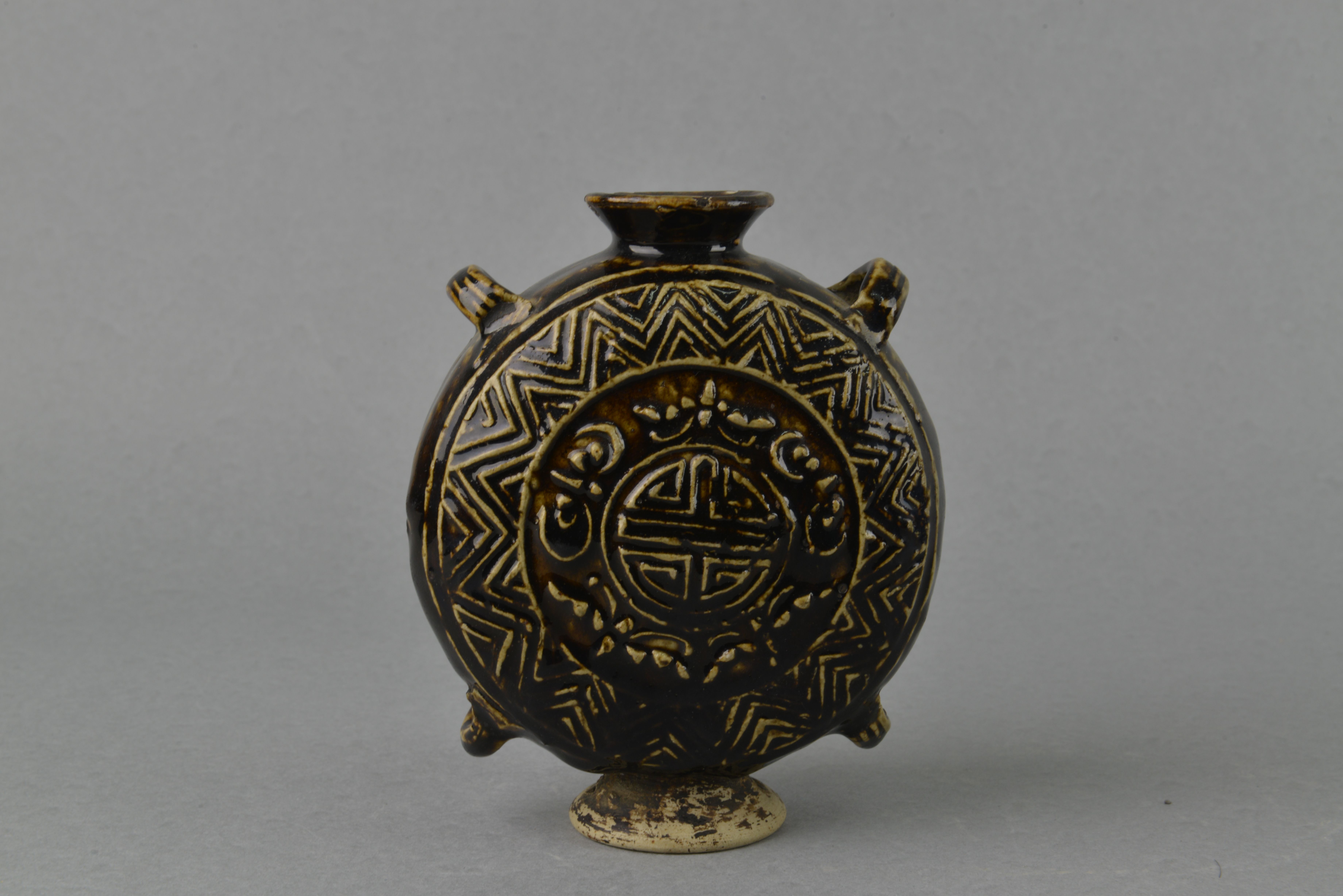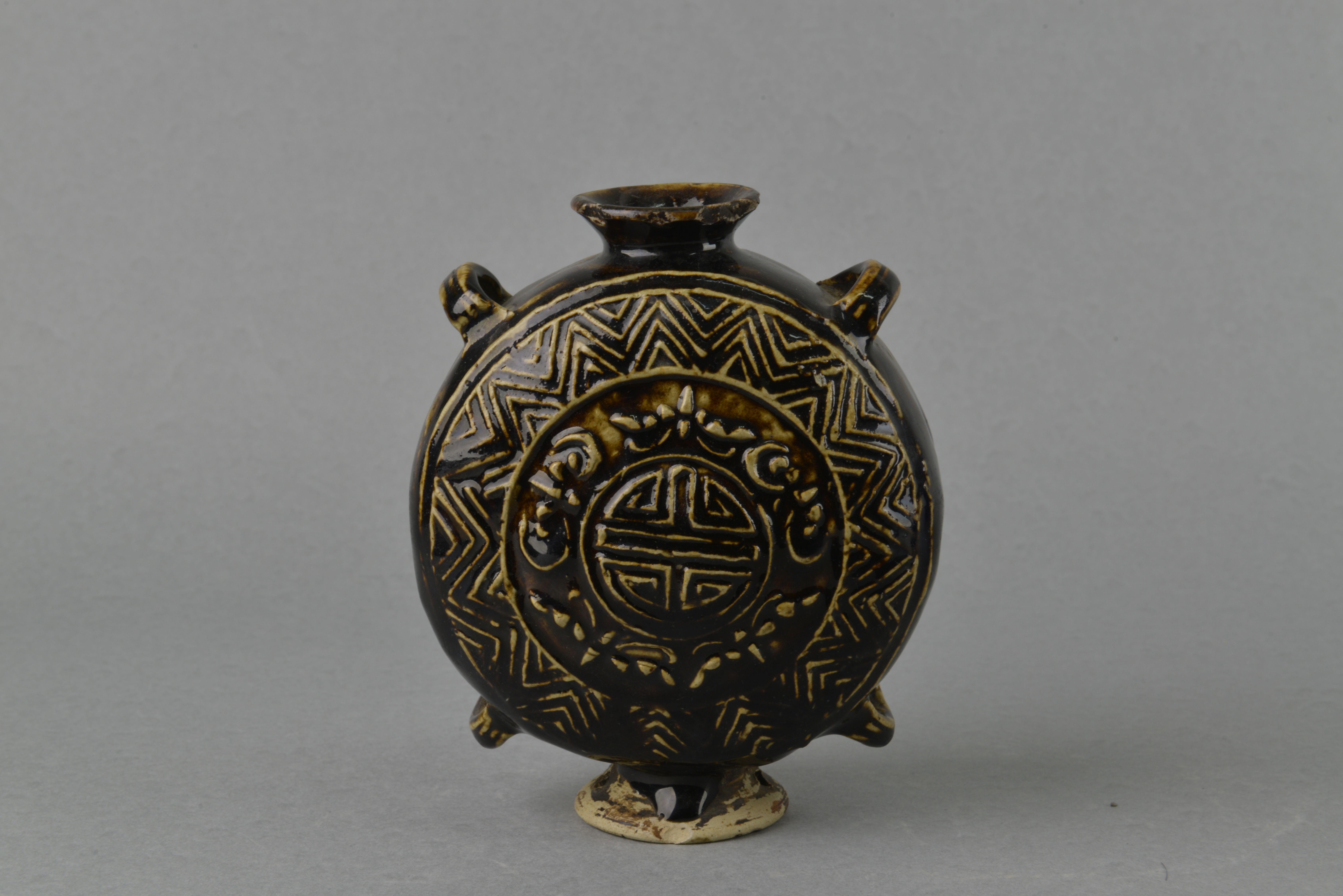清酱釉玉福捧寿纹四系扁壶